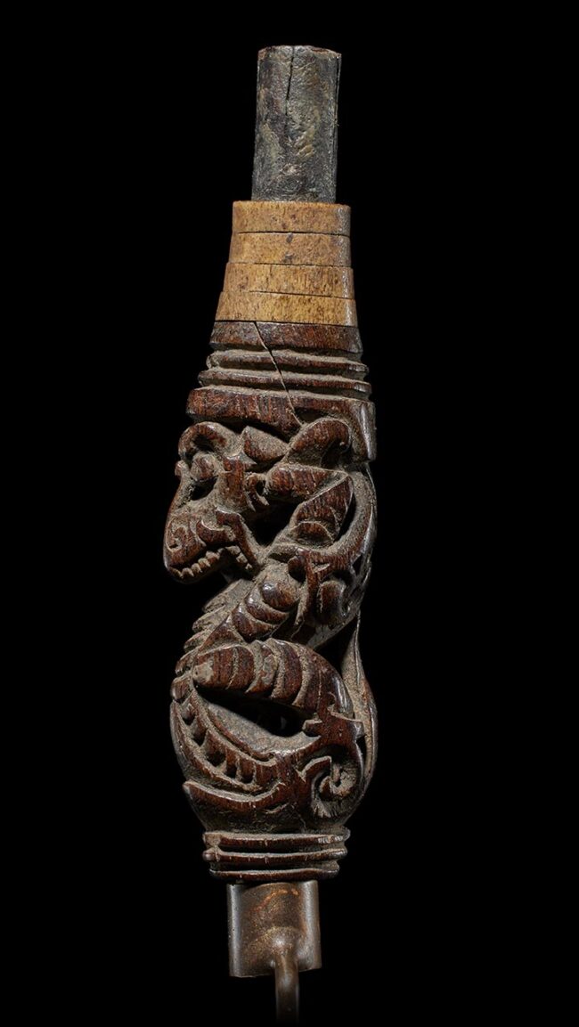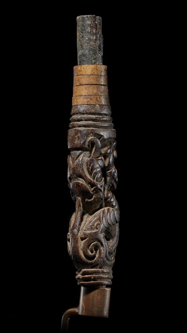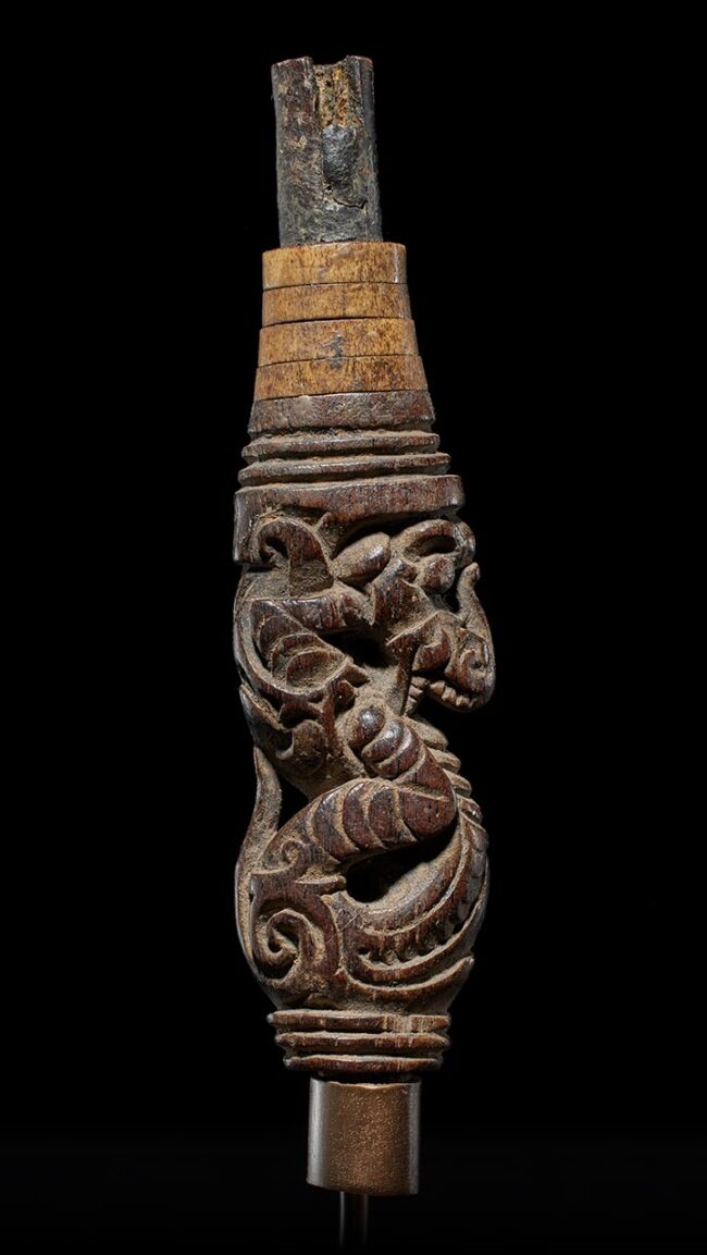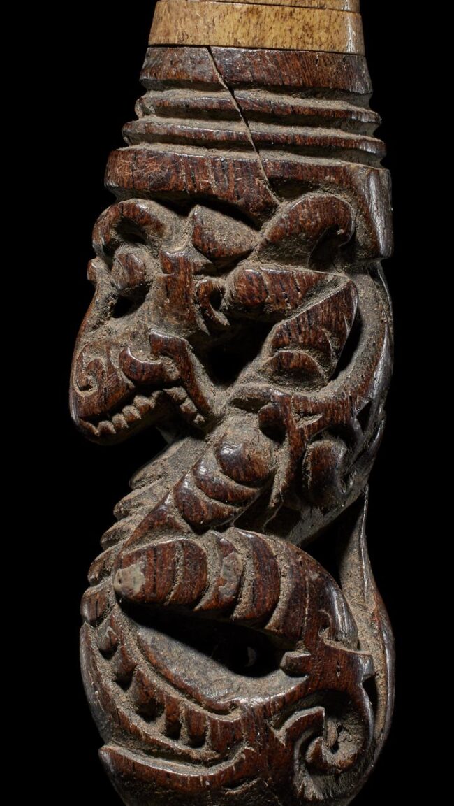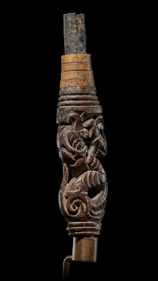 Crafted in the likeness of an Aso, a significant protective mythological being in Dayak culture, this wooden example exhibits a graceful, serpentine form. The creature’s head gracefully tilts away from its body, infusing it with a captivating sense of fluidity and dynamism. Adorning its upper section are carefully placed rings made from deer antler and buffalo horn, adding a tasteful and complementary touch to this impeccably crafted artifact.