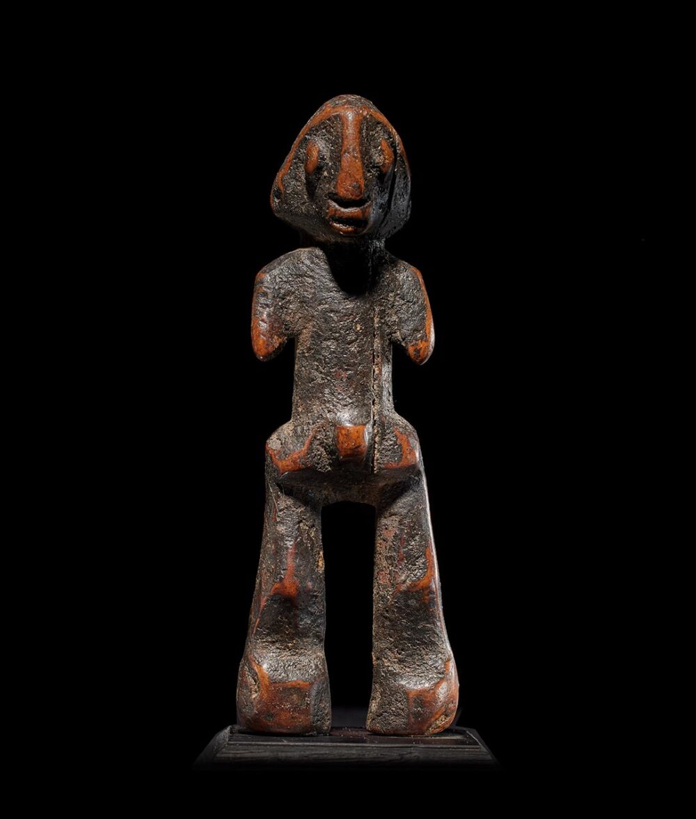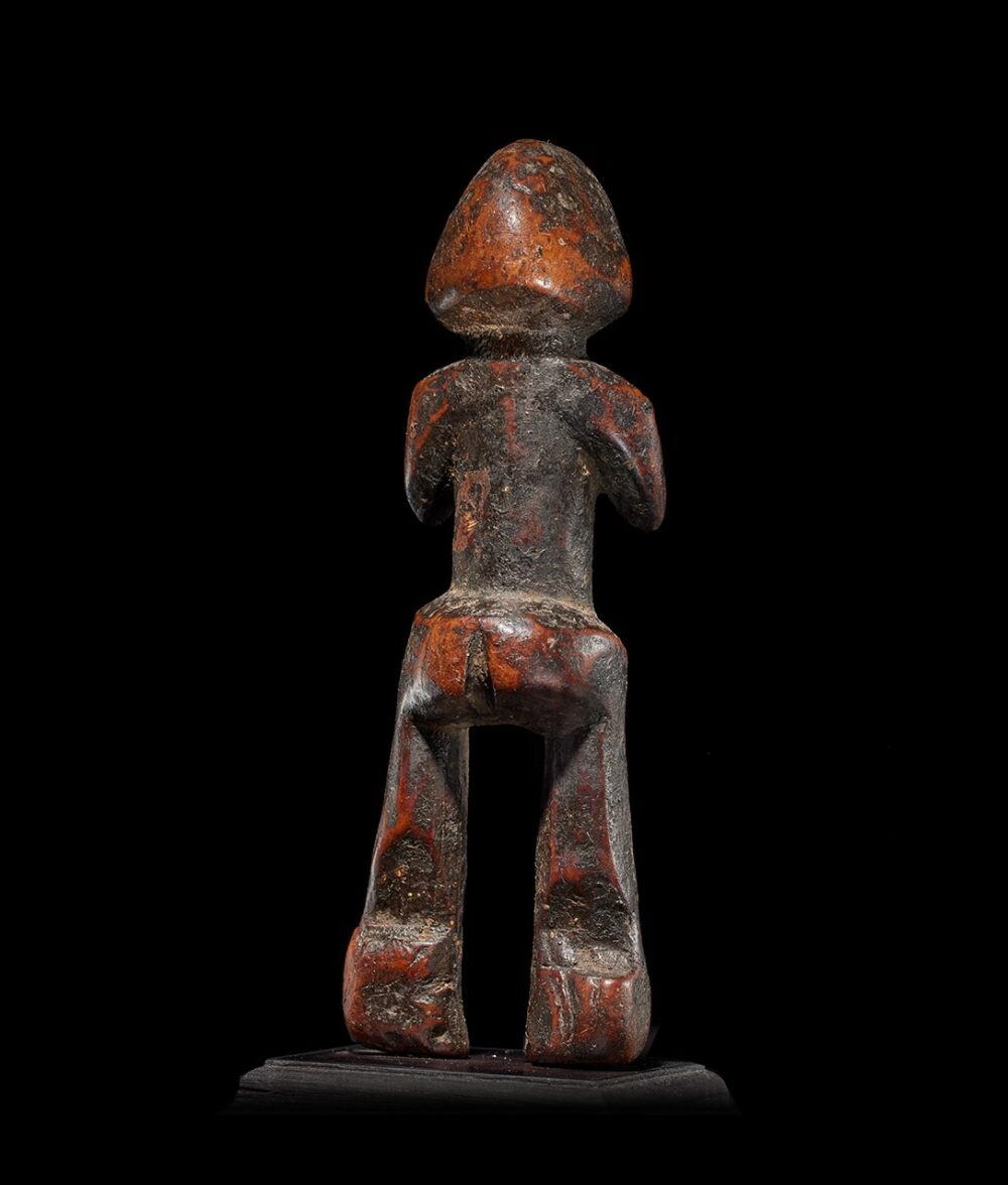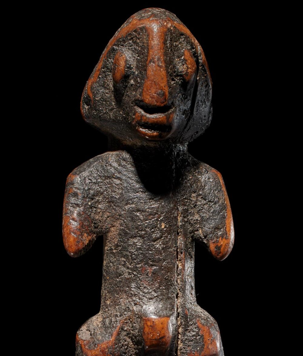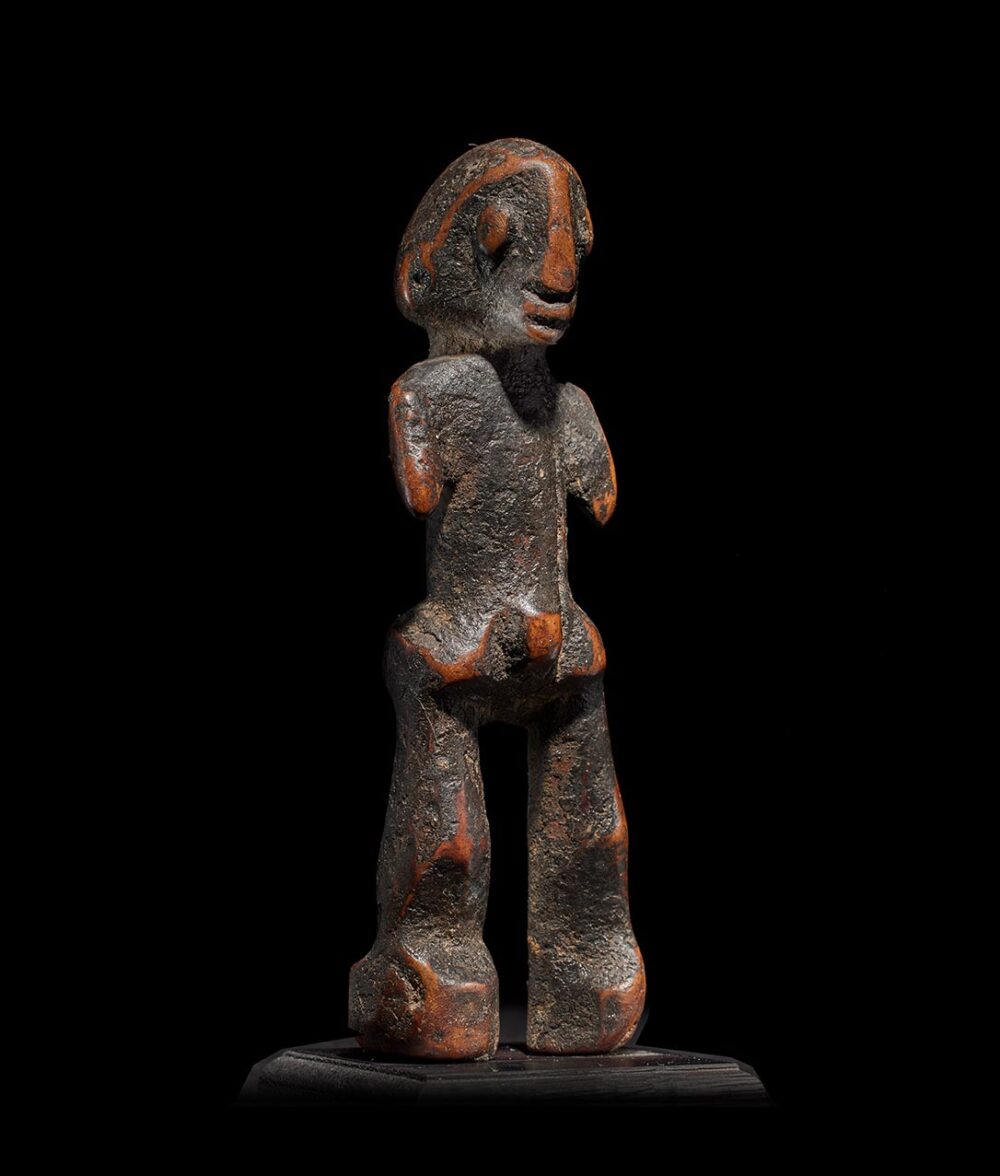 This particular piece stands out as a compelling embodiment of abstraction, featuring an expressive visage with prominently protruding eyes and a mouth. Its form flows with an innate dynamism, from the delicately carved body to the powerfully rendered legs. The wood, heavily worn and deeply patinated has become encrusted through years of libations and handling, bears witness to its storied history.