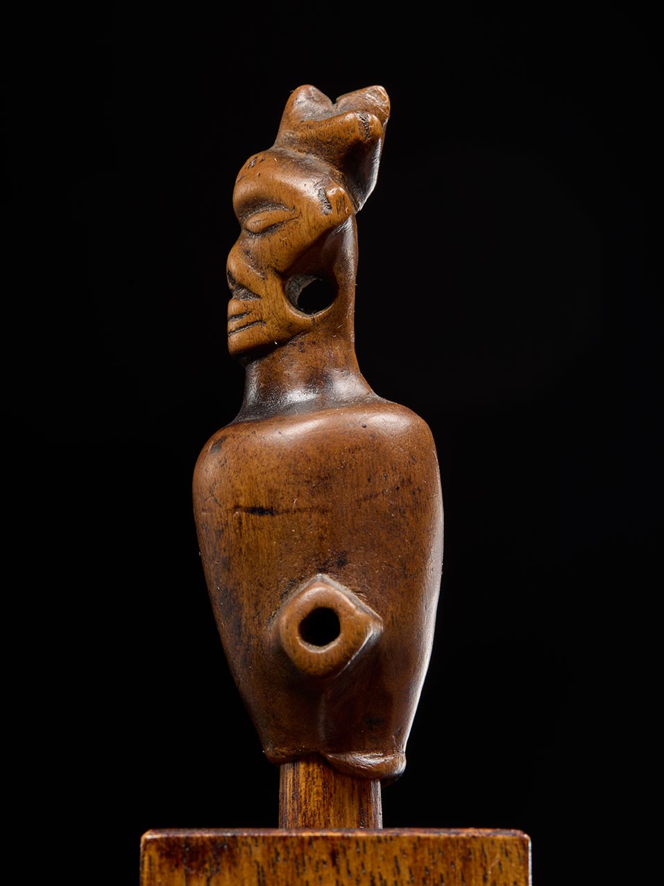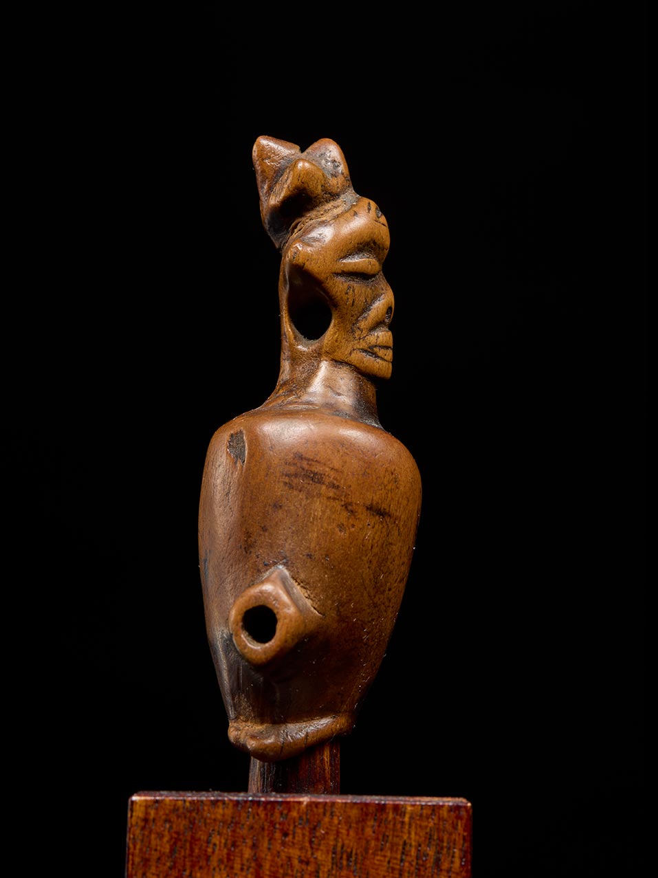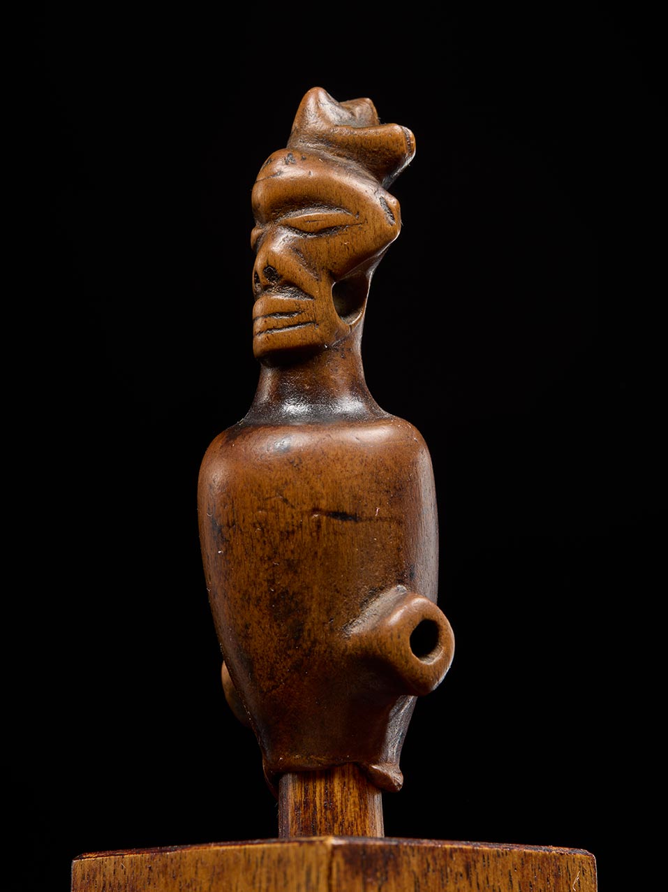 This particular example is exceptionally sculptural, with a compact, ovoid body and projecting side tubes worn soft and smooth from prolonged use. The facial features are boldly stylized: deeply incised eyes, a prominent mouth, and a commanding presence far beyond its scale.