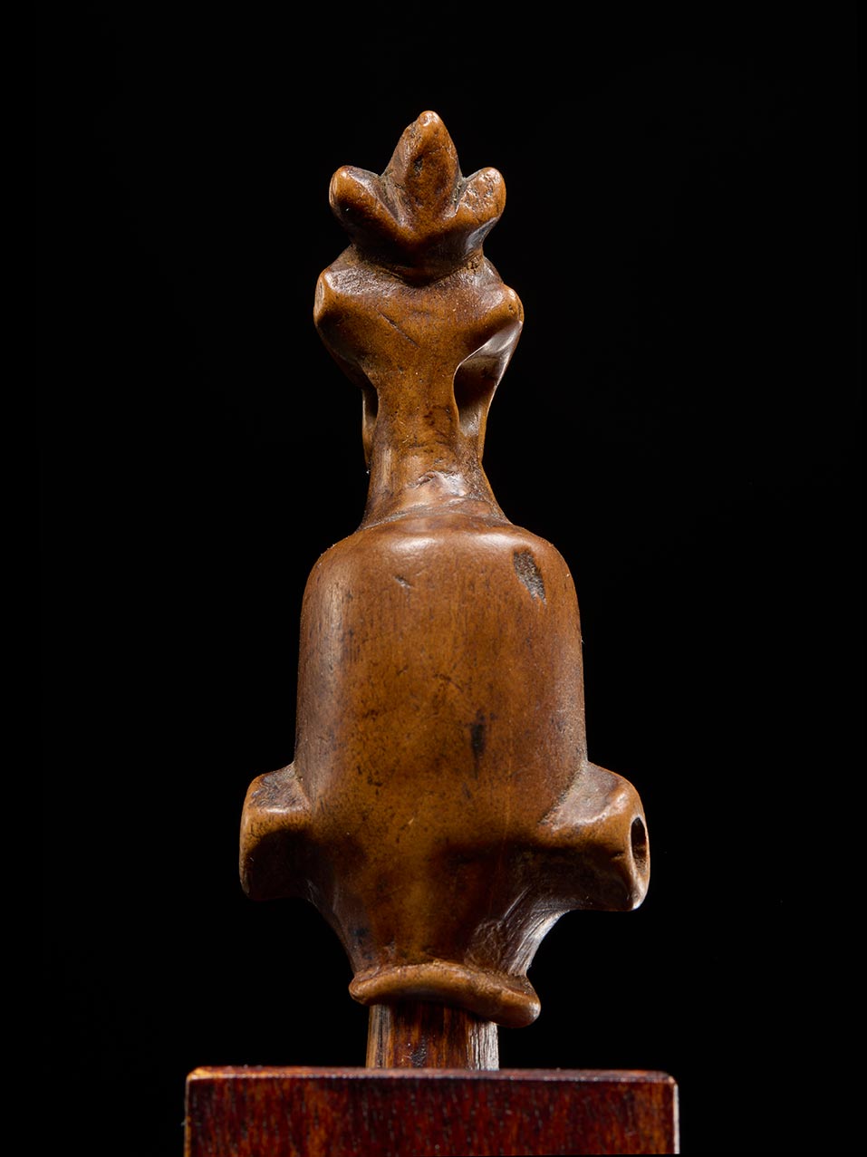 This finely aged wooden whistle by the Pende of the D.R. Congo transcends its utilitarian origins, taking on the visual power of a miniature sculpture. Whistles such as this were often used during initiation rituals, masquerades, or dances, where their sound played an important role in summoning spirits or punctuating ceremonial action. They were typically worn suspended around the neck or tied to the wrist.