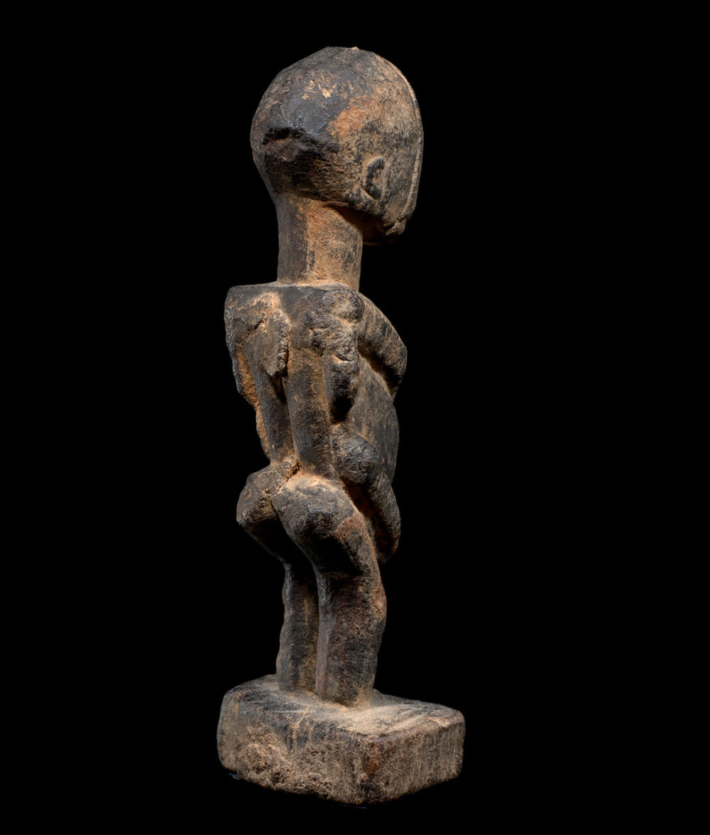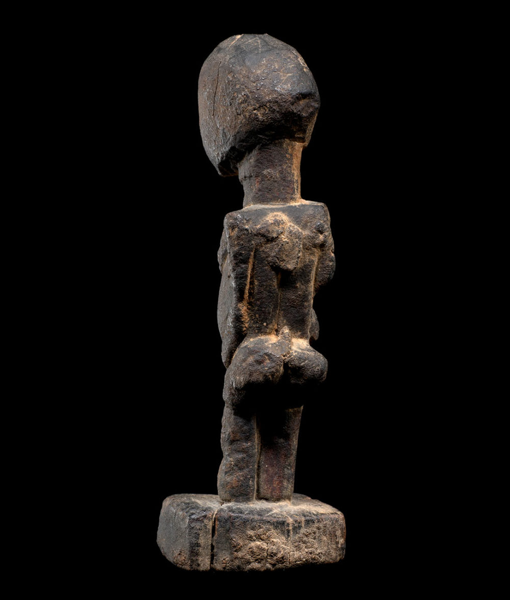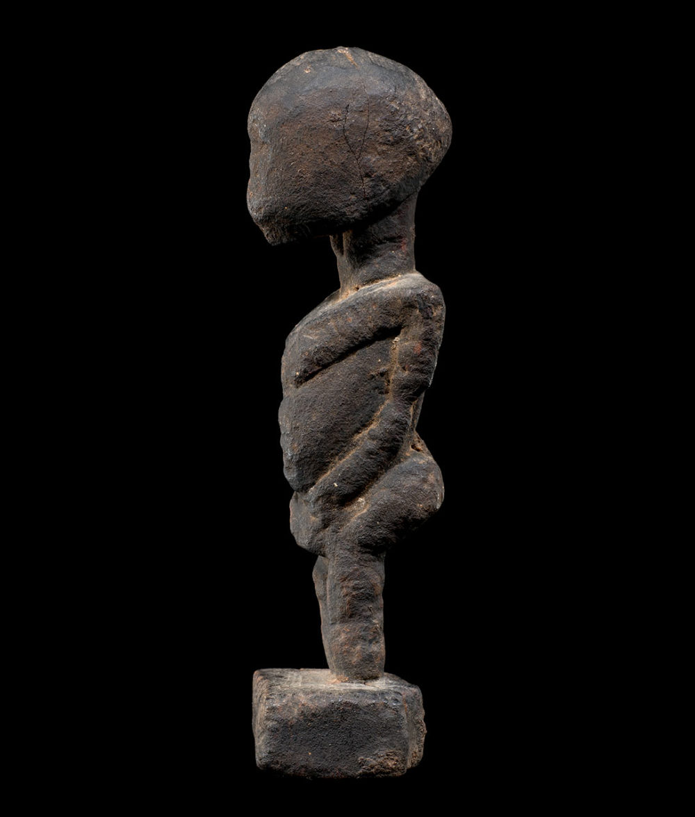 Provenance: Private French collection. This ancient Dogon figure was placed in a sacred shrine and used in ritual context. Its surface is covered in a thick sacrificial crust. Analysis on similar pieces reveal that such patina is often composed of blood and millet poured over the figure during ritual libations. Such figures were linked to family rituals and fertility. The gracious proportions and position of the figure evoke the ancient art of the Tellem, predecessors of the Dogon who settled in the Bandiagara Escarpment in the XIth century.