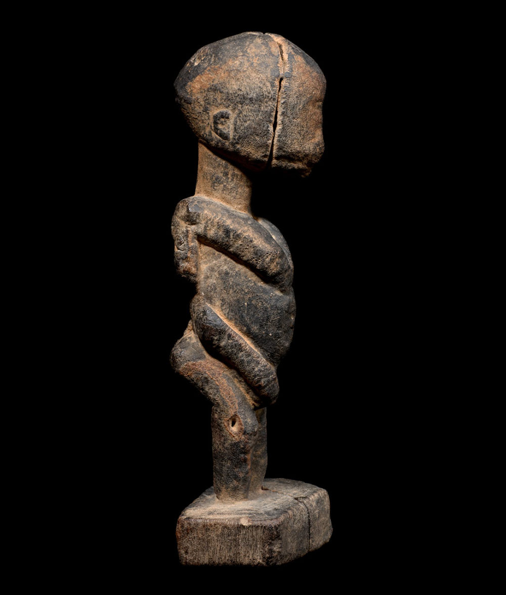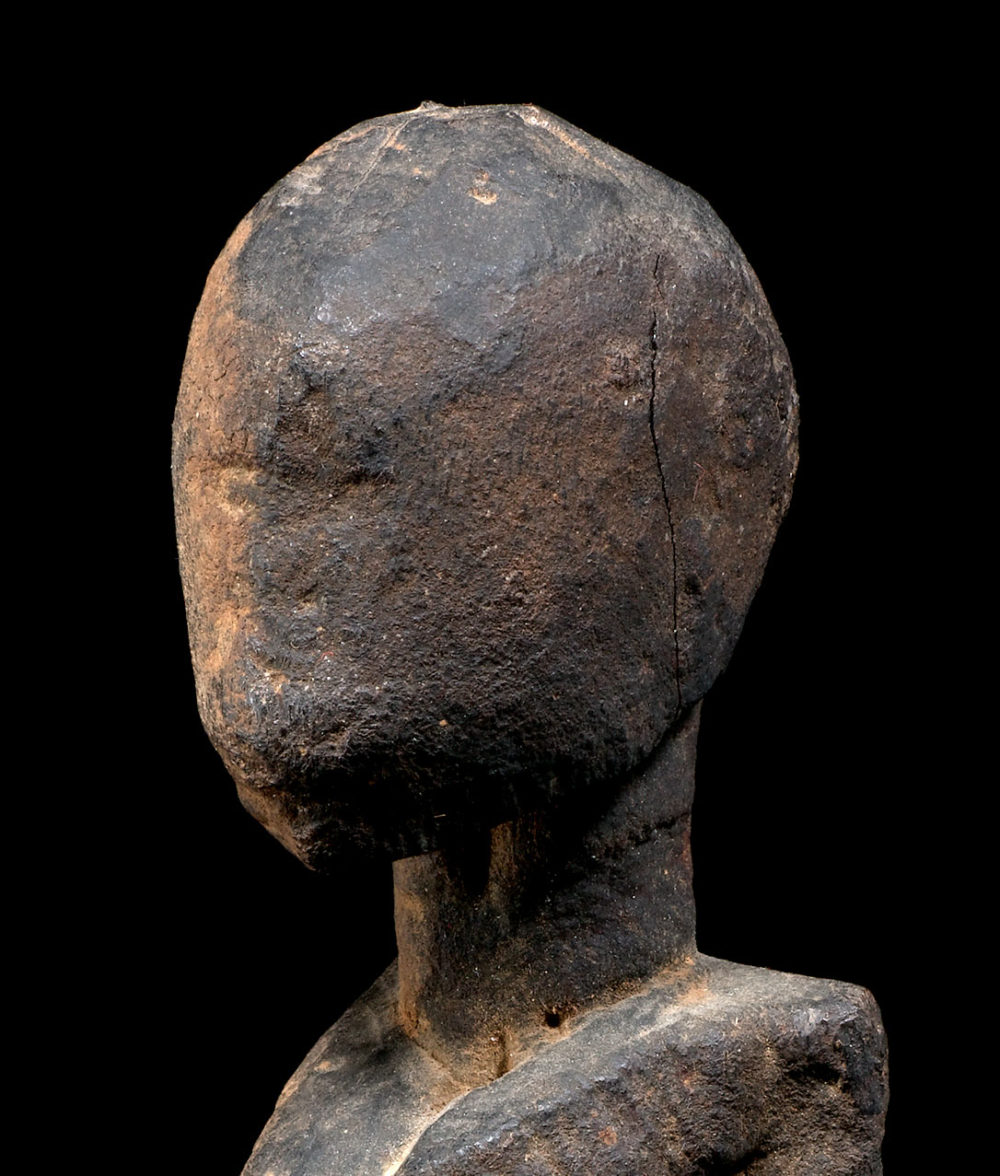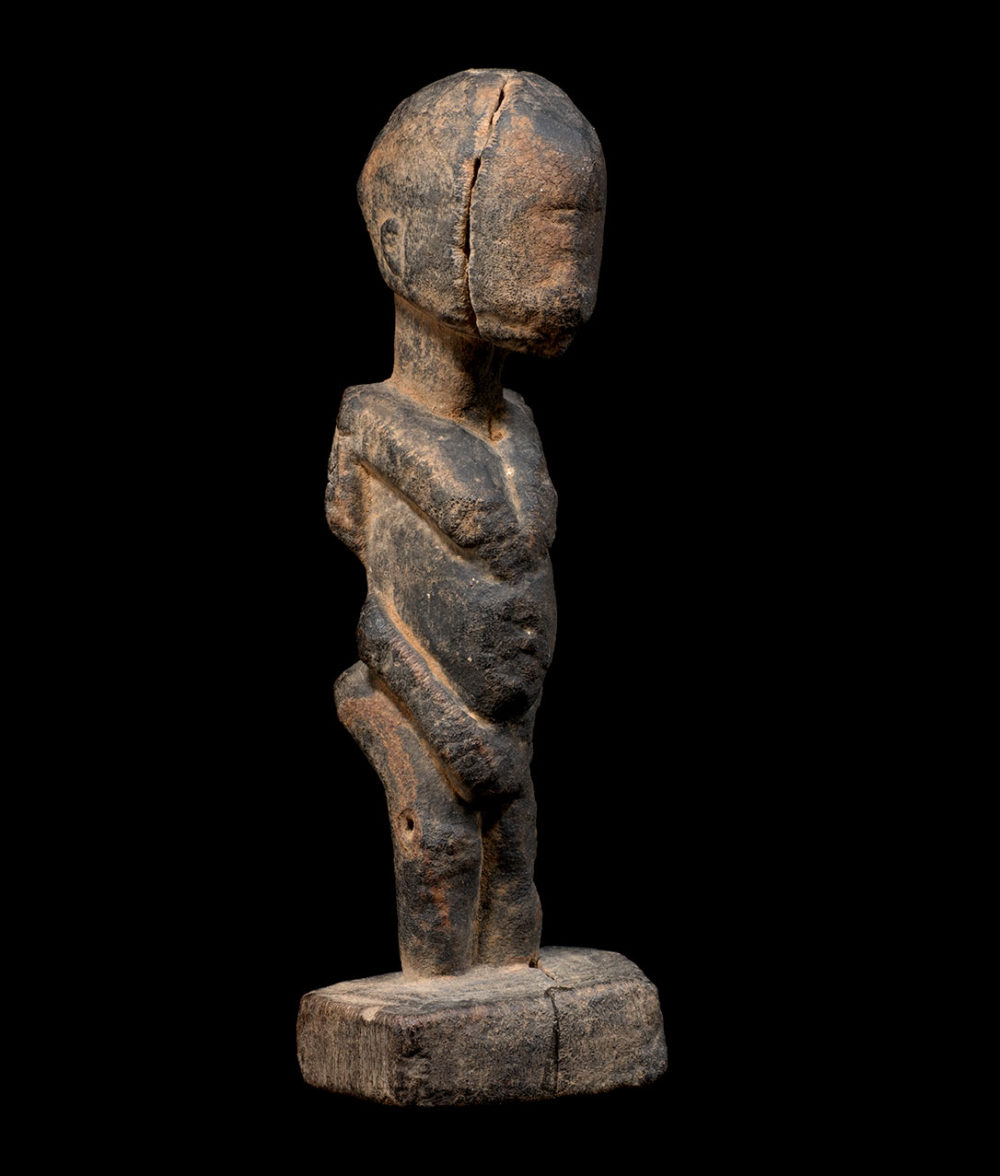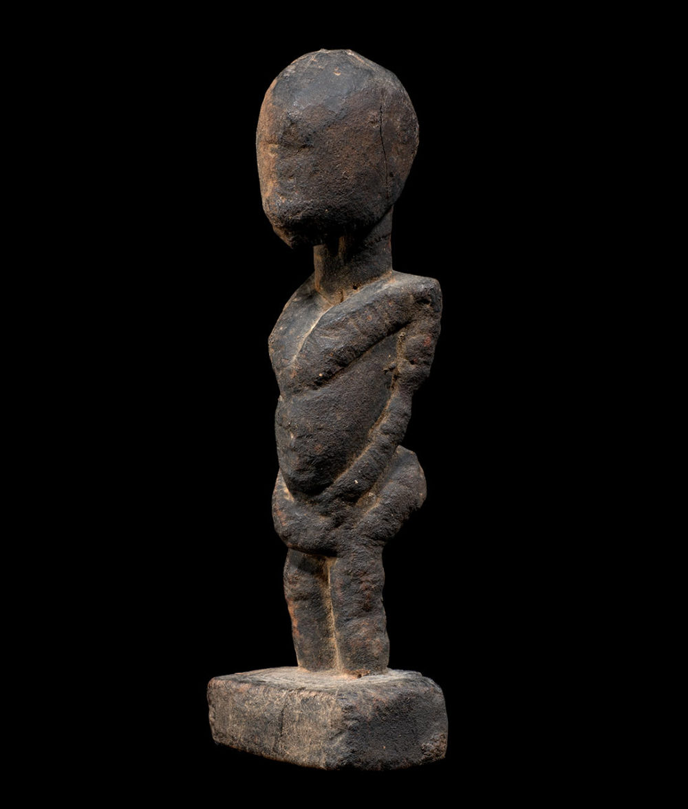 Provenance: Private French collection. This ancient Dogon figure was placed in a sacred shrine and used in ritual context. Its surface is covered in a thick sacrificial crust. Analysis on similar pieces reveal that such patina is often composed of blood and millet poured over the figure during ritual libations. Such figures were linked to family rituals and fertility. The gracious proportions and position of the figure evoke the ancient art of the Tellem, predecessors of the Dogon who settled in the Bandiagara Escarpment in the XIth century.