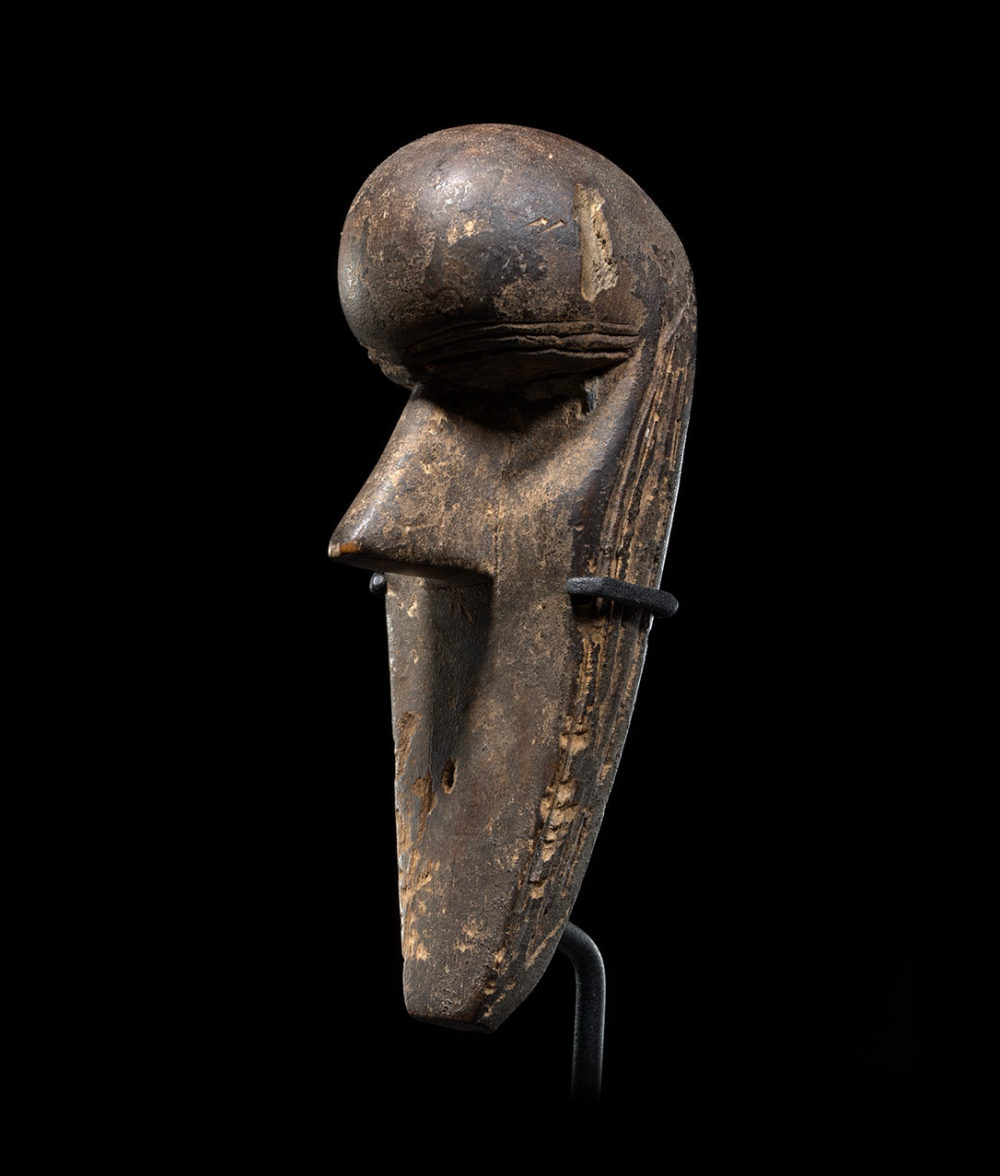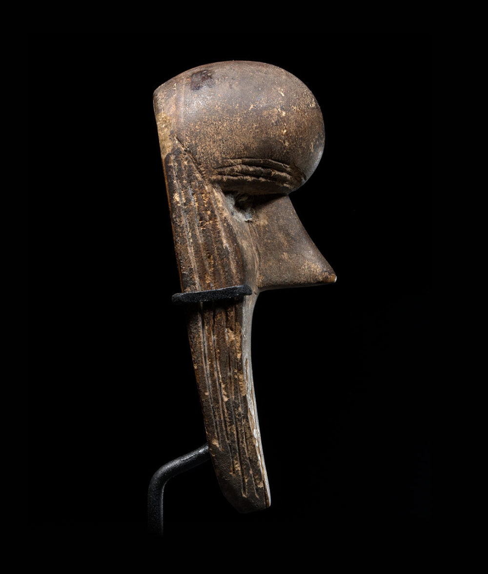 This mask is a quite rare example of Loma passport masks. A very similar piece can be found in the Metropolitan Museum collection, its back being stuffed with a magical mixture. The back of this mask being carved out, it may have held a magical charge too. Both this mask and the Met’s present carved lines on both sides of the face, supposedly scarifications. Its bold composition and expressive shape, combined with its gem like quality, makes it a beautiful work of art.