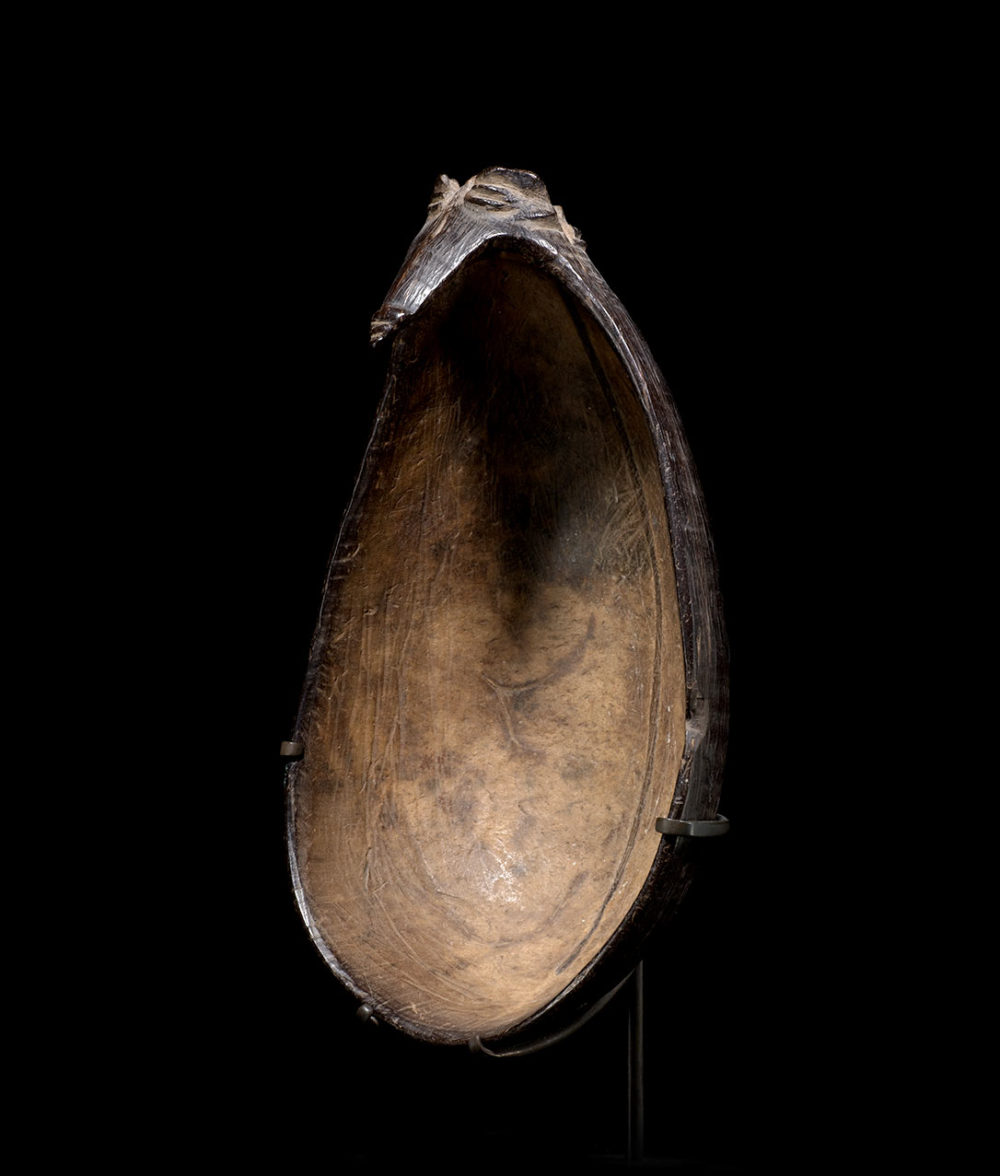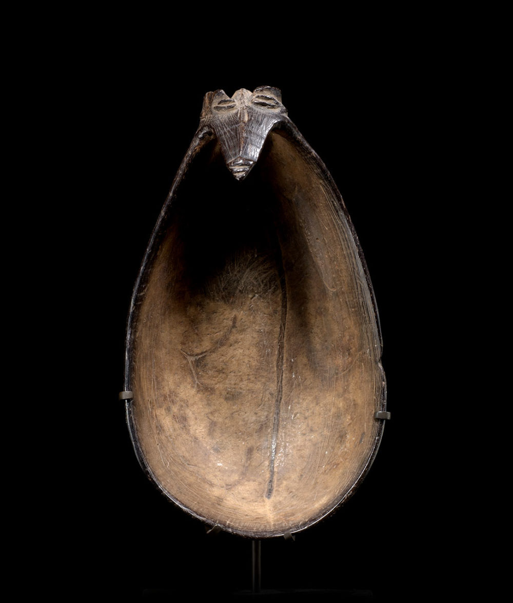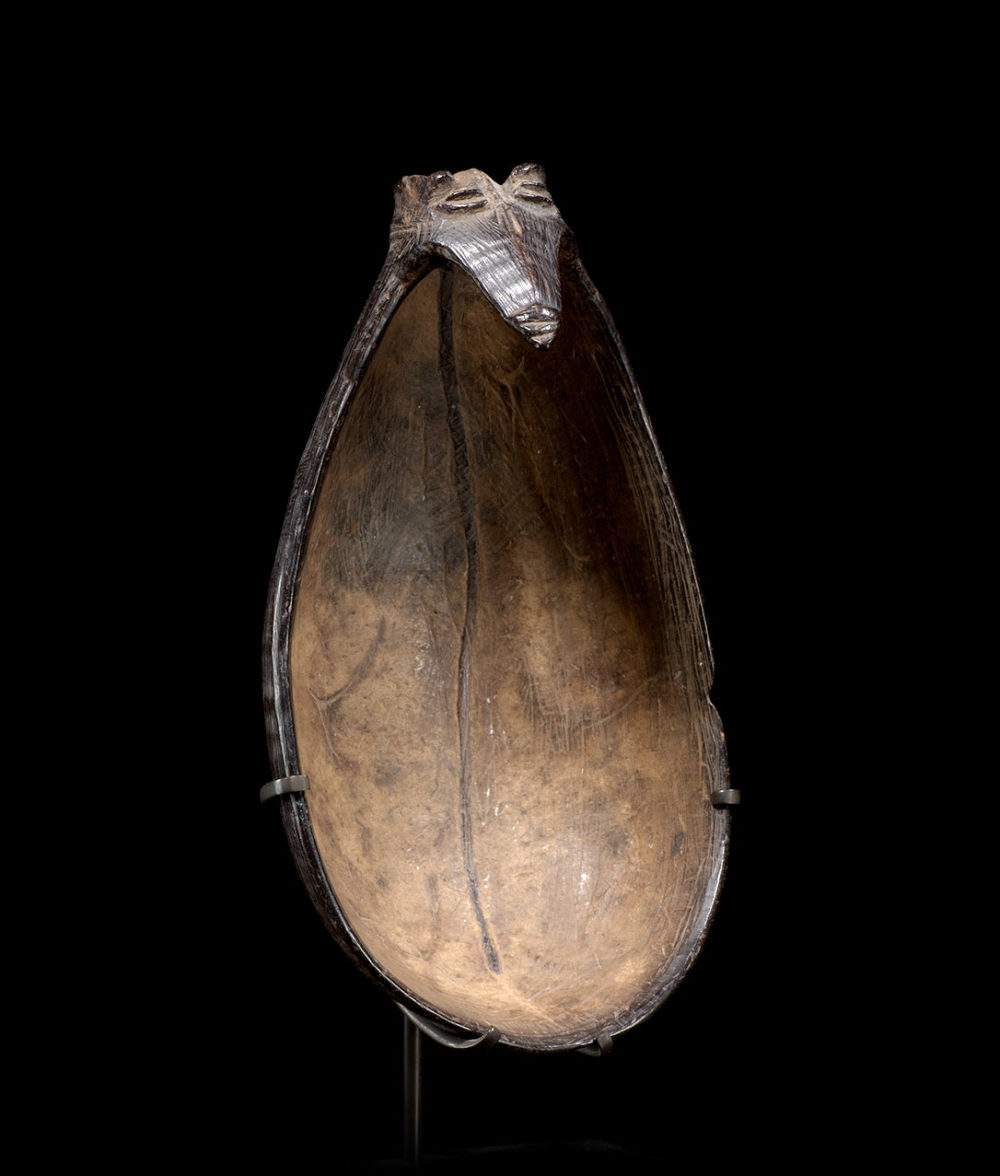 Provenance: Important American collection. This coconut shell spoon is an outstanding example of a common type of everyday tool for the Azera people. Its formal qualities suggest it belonged to an important person, perhaps a Big Man. The flying fox design forming the handle can also be found on soup clay pots. The Azera made a large variety of coconut shell objects, this material being particularly solid, light and easily accessible.