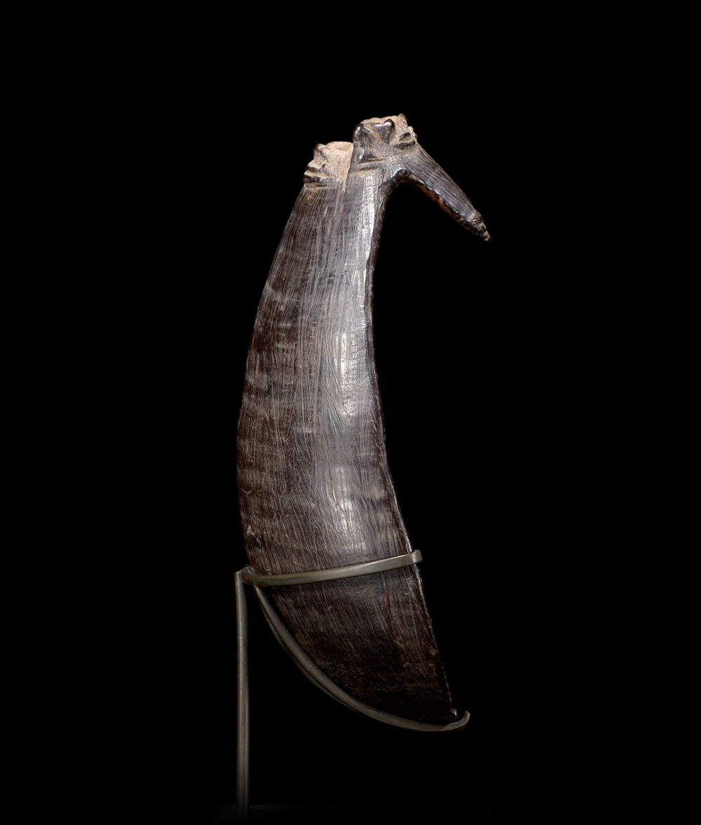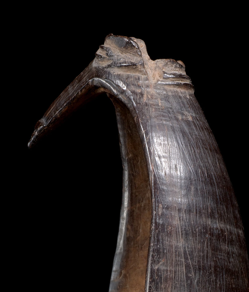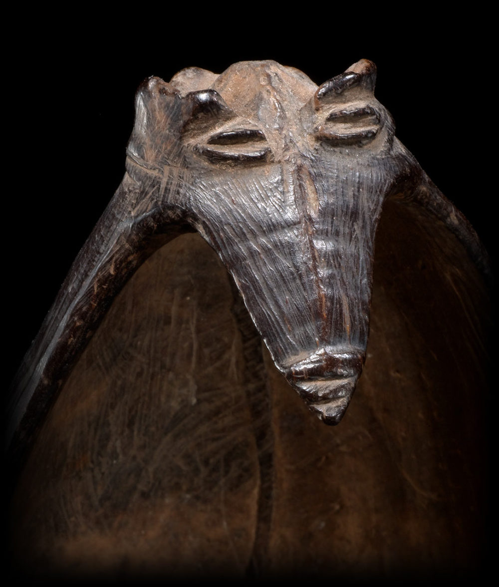 Provenance: Important American collection. This coconut shell spoon is an outstanding example of a common type of everyday tool for the Azera people. Its formal qualities suggest it belonged to an important person, perhaps a Big Man. The flying fox design forming the handle can also be found on soup clay pots. The Azera made a large variety of coconut shell objects, this material being particularly solid, light and easily accessible.