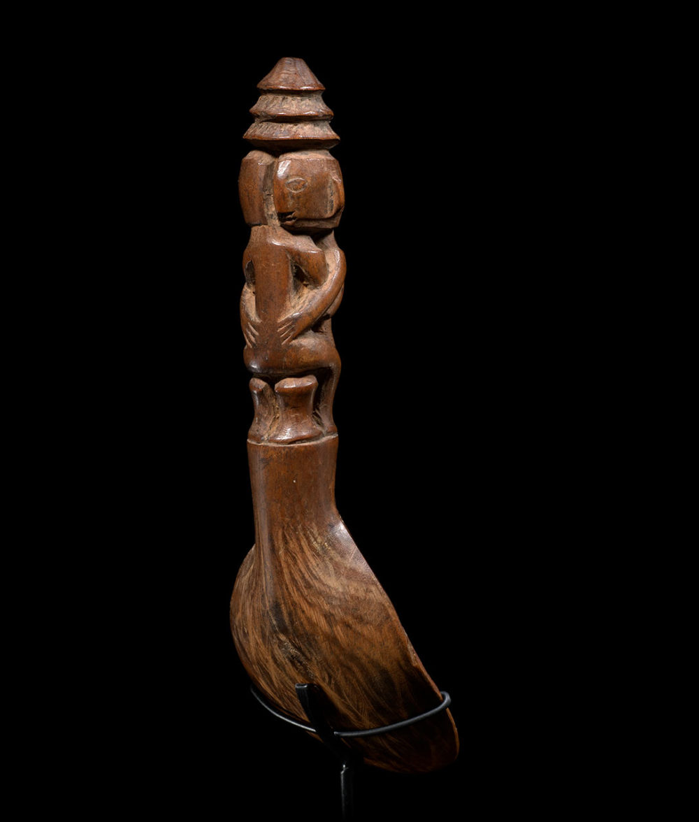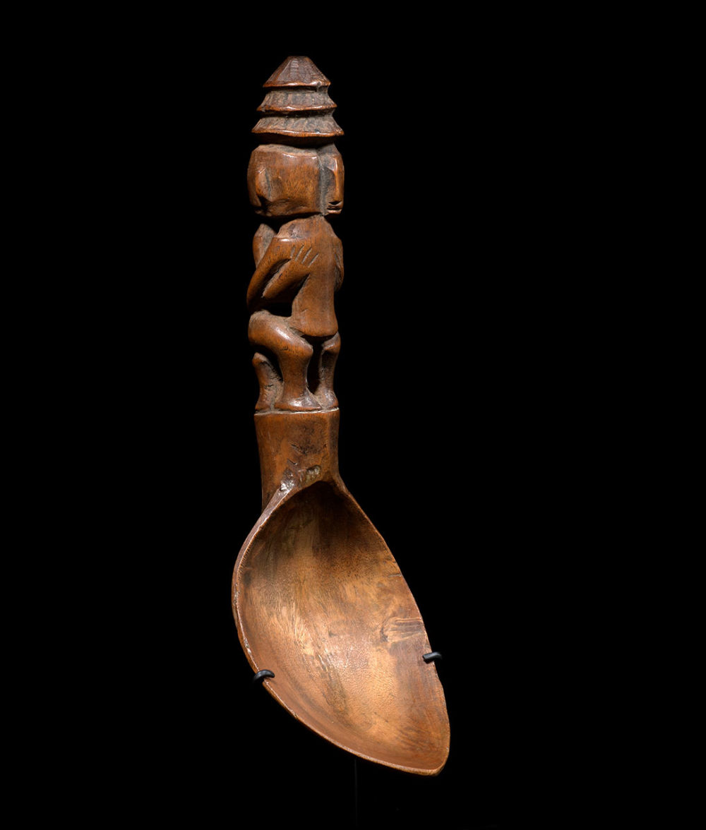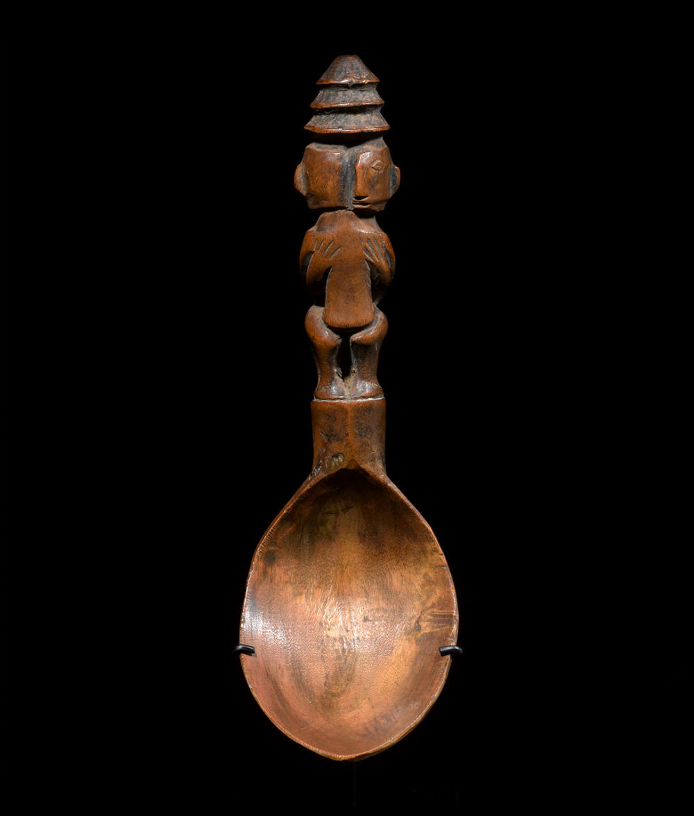 Provenance: Important American collection. The Ifugao people are renowned for their rice deities figures (bulul) as well as their finely carved bowls and spoons. Figurative spoons have been used by the Ifuago to serve food and wine. They usually represent one solitary figure or embraced couples. This ingeniously carved couple, the bold curves and the smooth surface of the spoon gives it a feeling of force and tenderness altogether.