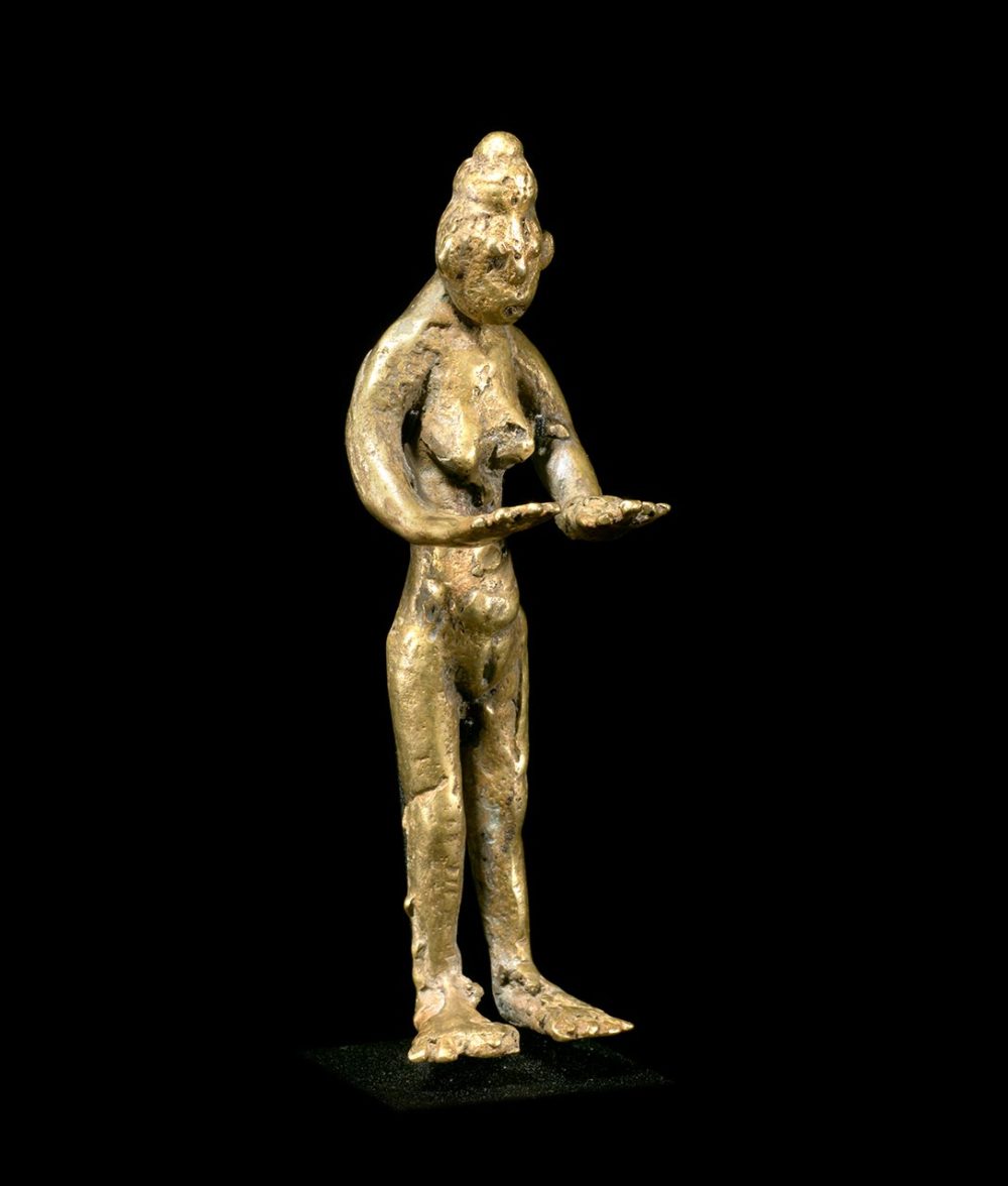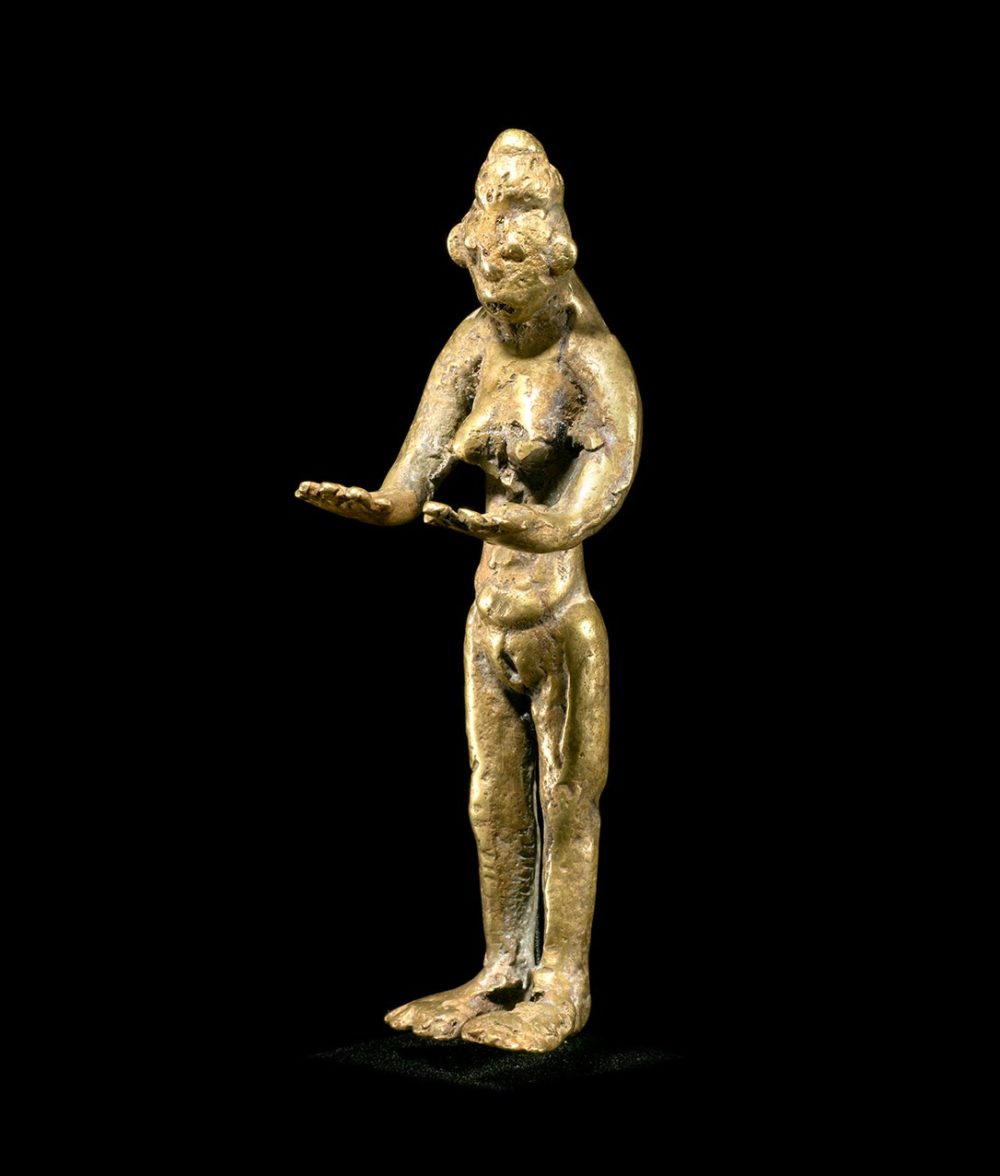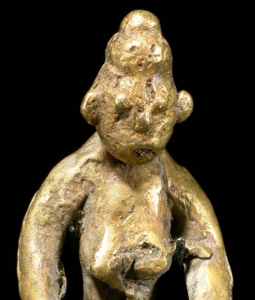 Small Indonesian metal figures are very rare. This female figure is a beautiful example. The distinctive headdress in a topknot formation tapers down the head of the figure. The face is naturalistic and there are hints of subtle decoration above her genitalia. Most likely representing a spirit, these figures were protective agents against various threats.