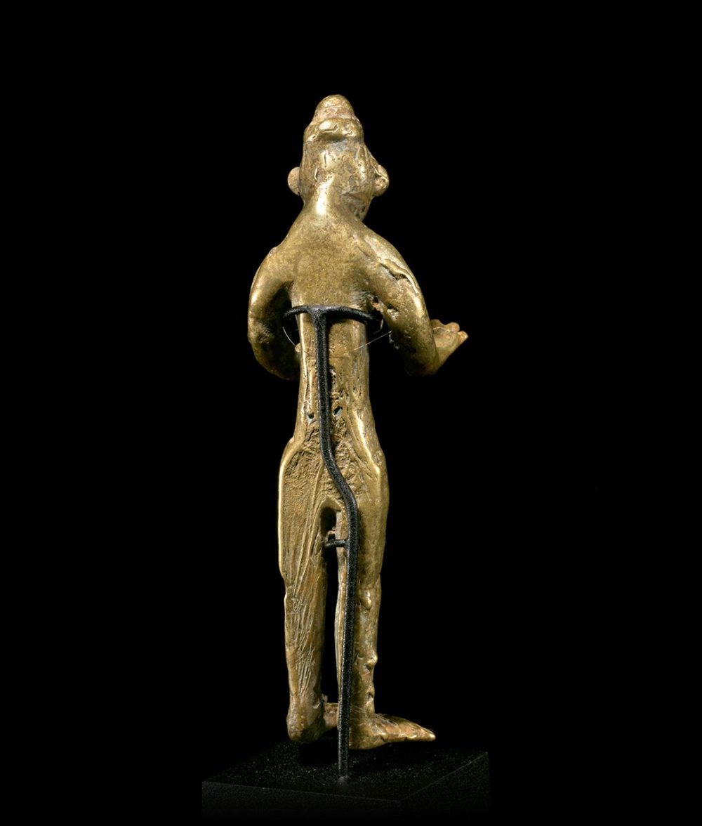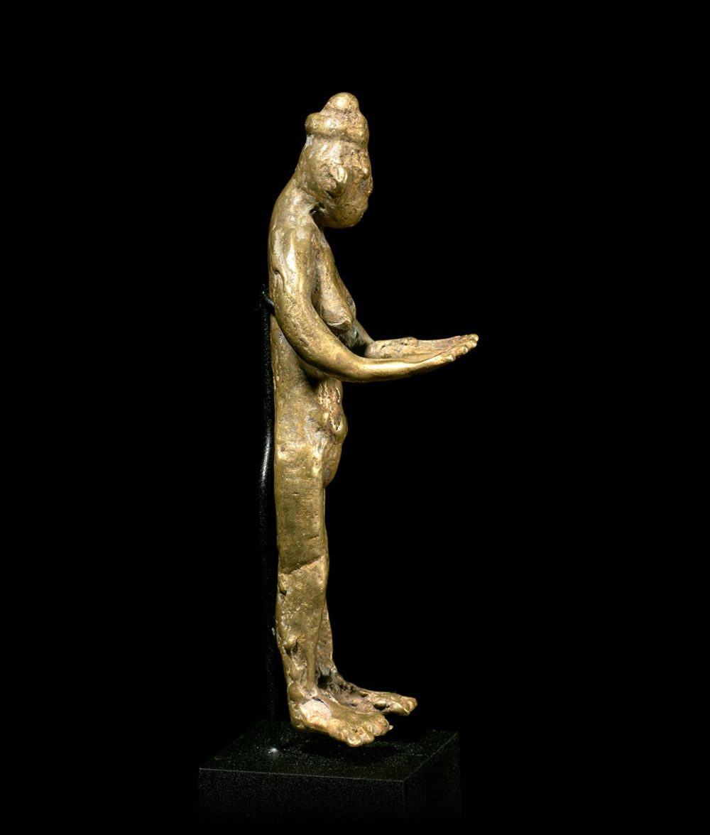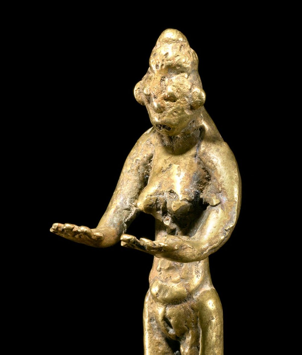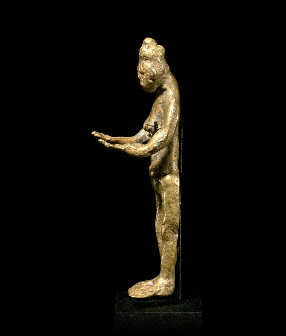 Small Indonesian metal figures are very rare. This female figure is a beautiful example. The distinctive headdress in a topknot formation tapers down the head of the figure. The face is naturalistic and there are hints of subtle decoration above her genitalia. Most likely representing a spirit, these figures were protective agents against various threats.