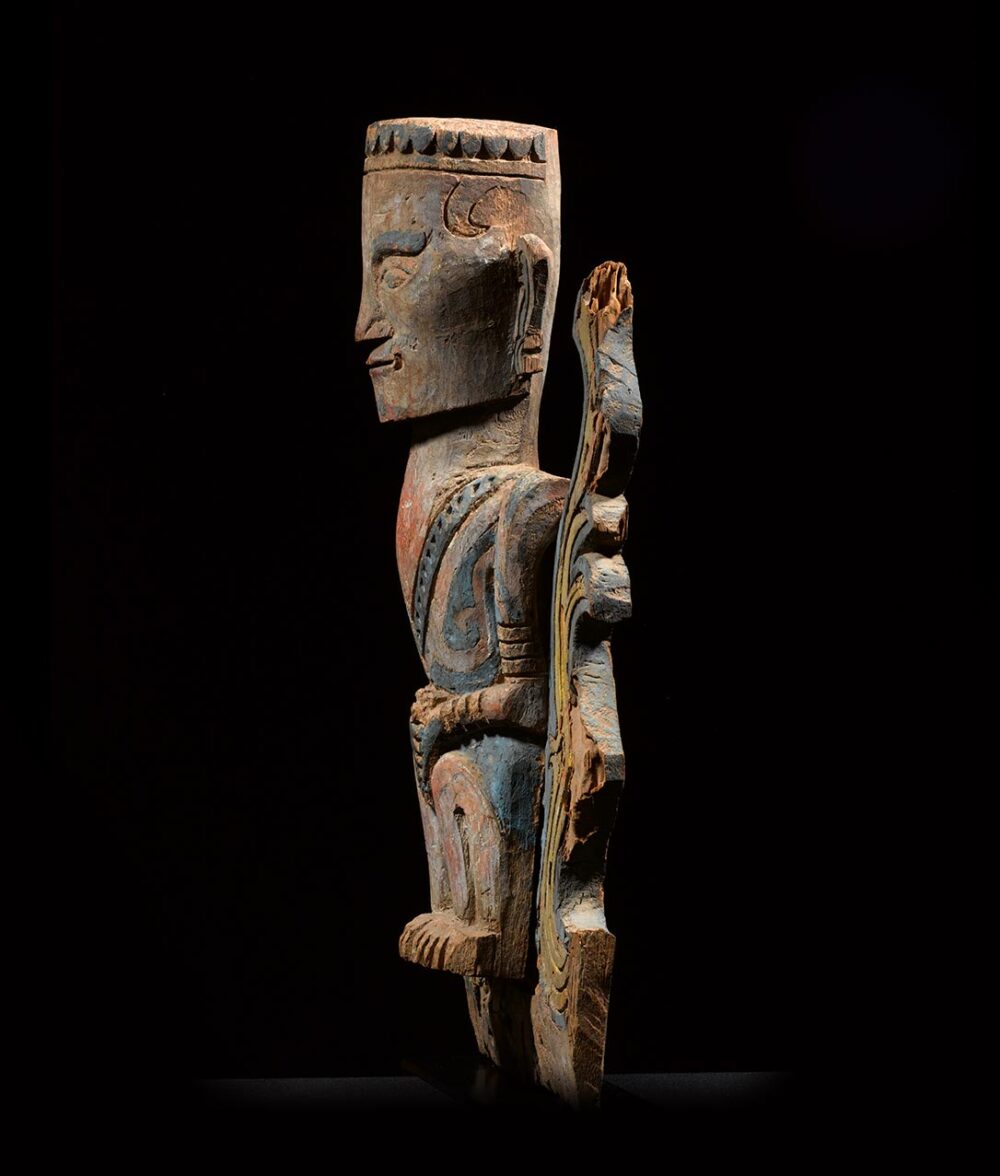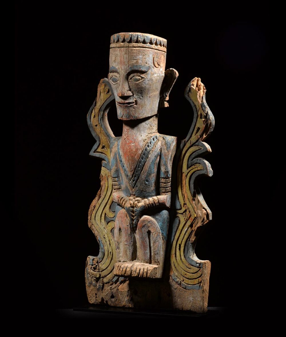 The traditional architecture of the Batak is often elaborately decorated with carved panels and sculptural elements. The most common sculptural element found on structures is the large singa heads which flank either side of the building. The architectural panel offered here is a much rarer type, seldom found and most likely adorned the home belonging to a chief or a descendant of a tribal ruler. An example of one such house is published in “Tobaland the shreds of tradition” by Jean Paul Barbier. In the early 1980’s Barbier traveled to Samosir Island, in search of the ancestral home of the Batak tribal leader Parmonangan; the home was first photographed in 1938 by P. Voorhoeve. Unfortunately, during his trip, Barbier discovered the original home was no longer standing, and was most likely rebuilt in the 1940’s. The façade of the home had three panels with human figures carved in high relief. The pair of figures above the larger female, illustrated here, appears to be similar to the present example; except that upon closer examination it becomes clear the one offered here was made at a much earlier date. This panel is clearly of better workmanship than the examples photographed by Barbier. The modeling of the head and face in particular is very well done, its expressive open eyes and its pinched mouth, the lack of European adornment, plus the presence of organic pigments and Reckitt’s Blue powder are all signs it was created at a much earlier period. The figures Barbier photographed are dressed in western clothes and the modeling of the bodies and faces lacks the sensitivity that the great early master artists were able to achieve in their work.