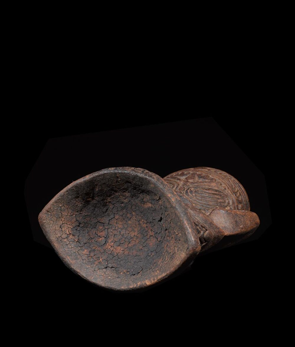 Wooden betel mortars are fairly common in New Guinea, but this one is special. It has two primary beaked faces most likely that of a hornbill or bird. The incorporation of this zoomorphic element with a human face is a powerful method of representing the relationship between ancestors and their animal spirits. The entire surface of the mortar is skillfully adorned with clan designs and symbols, including numerous stylized human figures. It has a wonderful handled surface with most of the red ochre pigment still intact. The cavity inside the mortar is heavily encrusted, showing extensive signs of use.