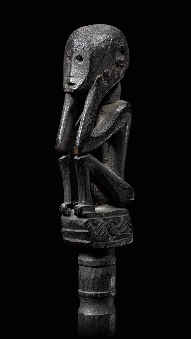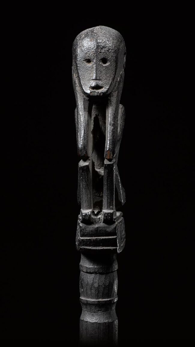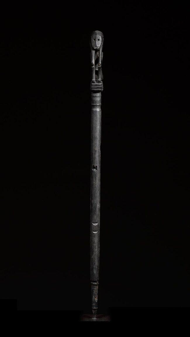 Pig trap amulets, or Tun tuns, were thought to magically enhance traps used in hunting. The long stick would be pounded into the ground, and mark the height of the trap’s release mechanism. This is a classic example. The figure sits atop of the stick, in a crouched position, with elbows resting upon the knees, chin resting upon the hands, with an intense face and open mouth. The figure is finely carved, utilizing positive and negative space. Its limbs are lively and elongated, while its hands are exceedingly exaggerated. The patina is dark and encrusted, and its surface is well worn from many years of use.