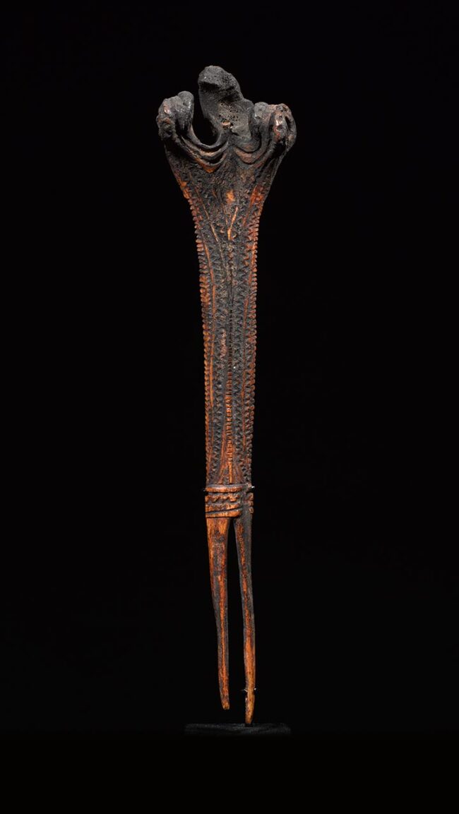 This example of a cassowary bone ornament would have been worn in the hair, often serving as a fastener behind a wooden headdress to keep it attached to the back of the head. What is important to notice in this ancient and beautiful hair ornament is the elaborate openwork on the top knob, and the skillfully carved clan symbols and designs that cover the hair pins entire surface. Also of note, at the back of the hair pin a stylized face or mask has been carved in relief.