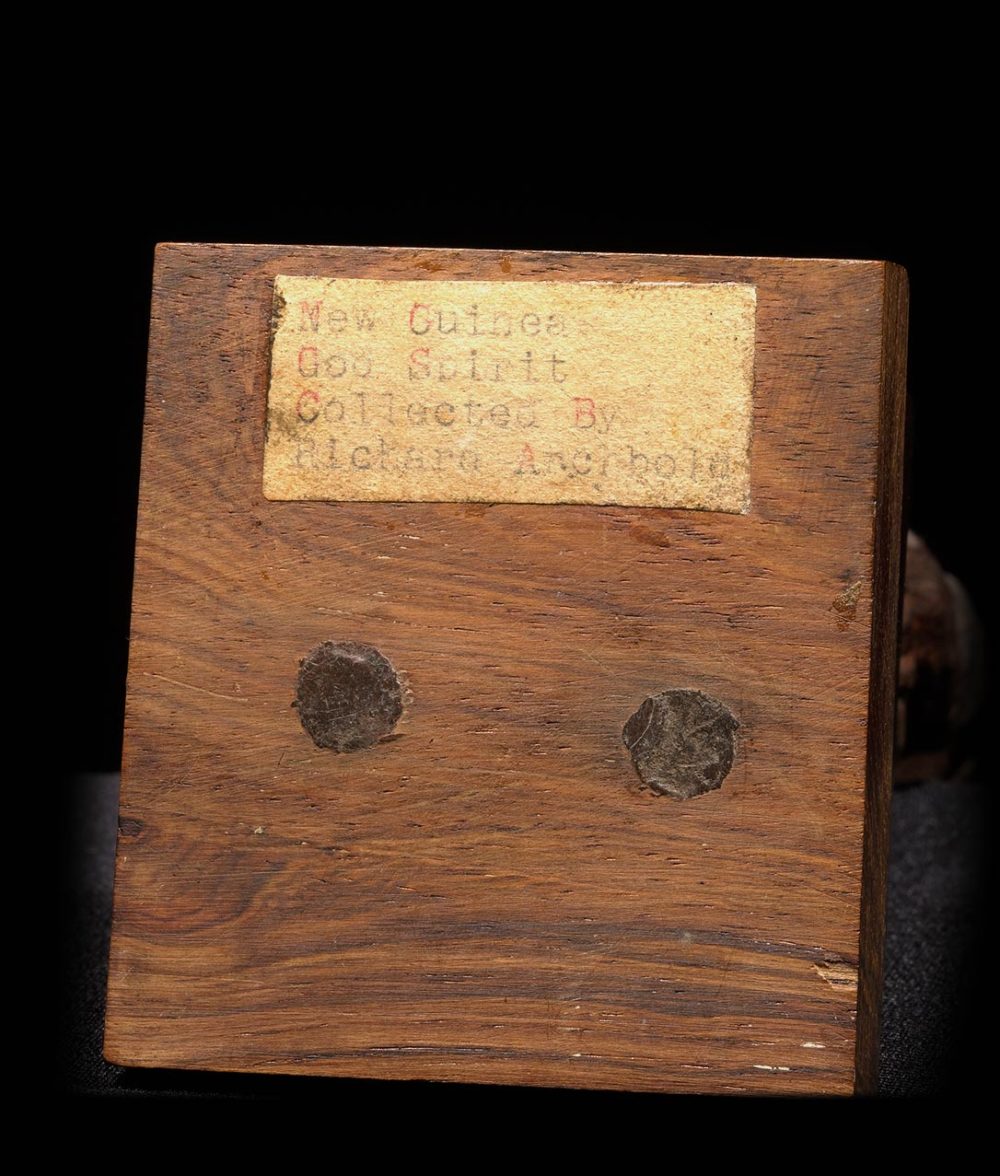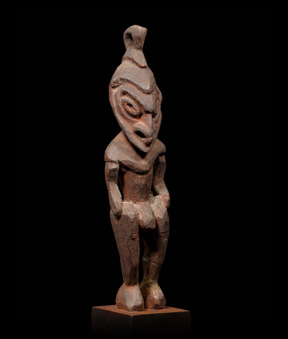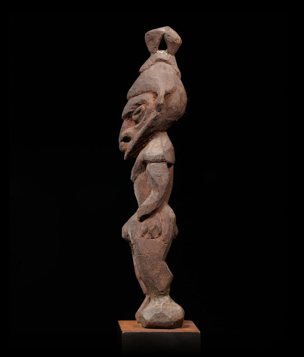 Authoritative in form; this Ramu river figure has immense torque in the body and is surmounted by a traditionally rendered face with an arrowed shaped pierced nose. The profile is magnificent and exposes the subtle tilt of the figure. Stone carved from hardwood with old red pigments that are still intact. In excellent condition.