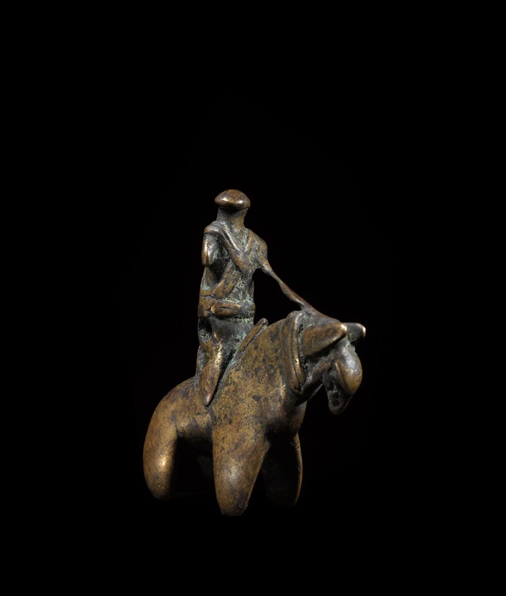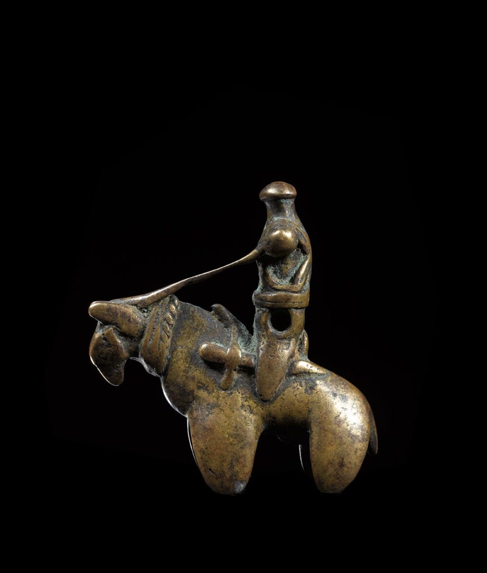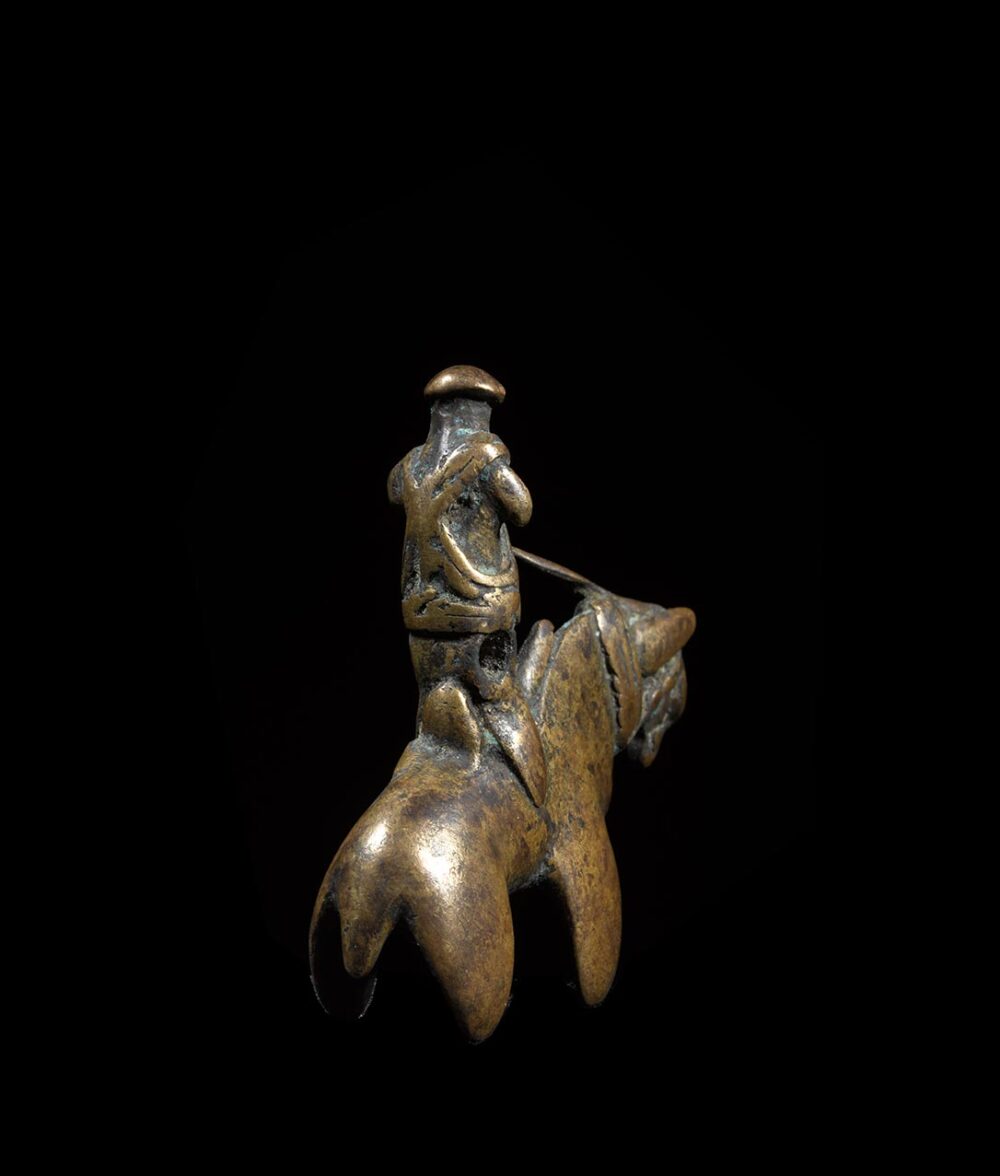Cast in the classic form of an equestrian figure, this small pendant showcases how diminutive objects can be just as detailed if not more so than larger objects. The features are extremely worn from generations of handling; while the integrity of the casting is still totally intact. The details of the figure and horse and its riding gear are both visible but delicately rounded from everyday use and wear.