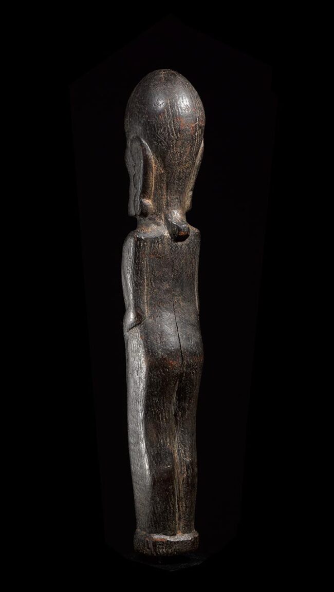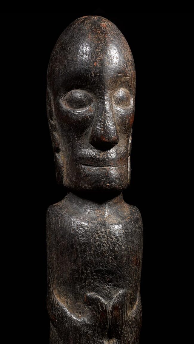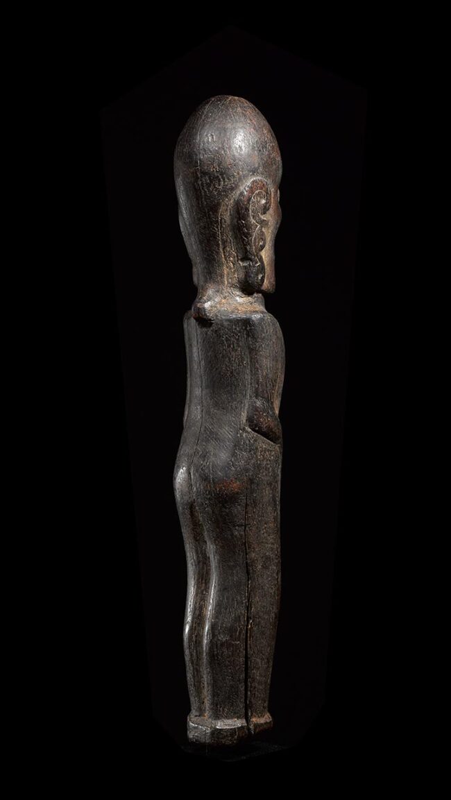 Shamans or datus used these objects to control the spirit world and keep evil spirits away from the village. The wooden cavity on the figure’s chest, just above its thumbs, contains pukpuk, which is a mixture of organic substances that activates the figure’s magical qualities. The figure is carved in an elongated stylized fashion; and when viewed from profile the subtle curves of the sculpture are revealed. This example is also quite large and impressive, with strong and oversized hands and ears. The patina is dark and deep, attesting to its great age and repeated ritual use. The wood used is heavy and dense. Overall, it’s in very good condition, the splits seen in the wood are old and stabilized.
