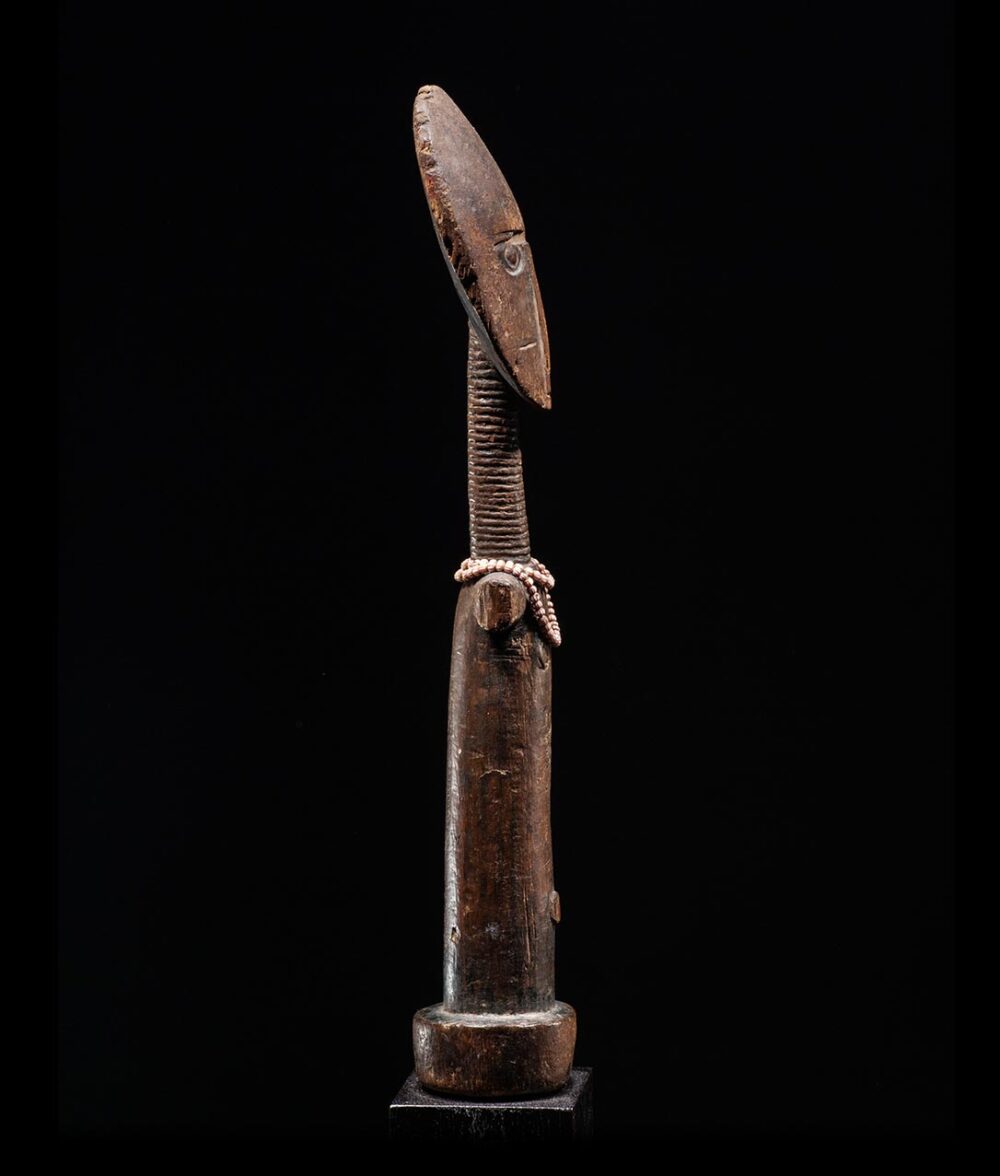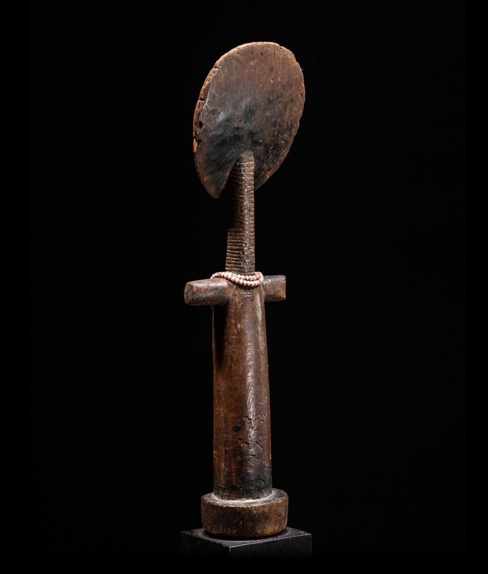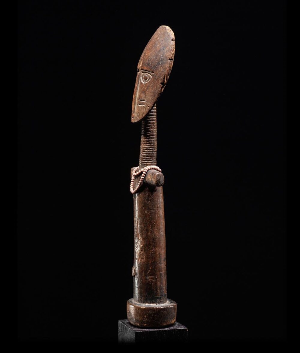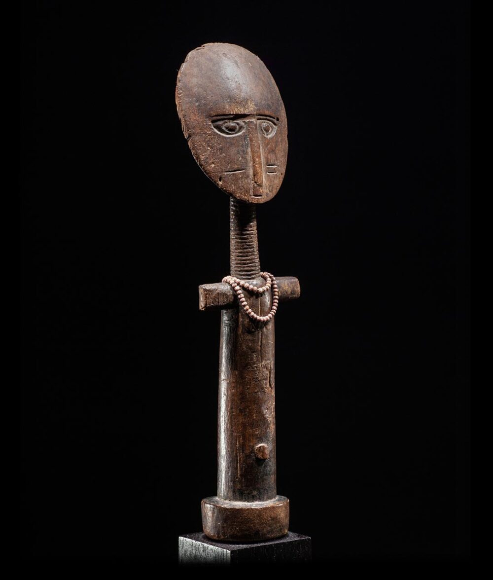 Akua mma dolls are known for their long neck, round face, high forehead, and small mouth. These characteristics are synonymous with Ashanti ideals of beauty and were carried by expectant mothers in order to encourage their unborn child to be beautiful. This example is in great condition and exhibits a beautiful dark brown patina, suggesting it was carried and used often. The head is large and circular, the face expertly carved with deeply cast eyes that have a piercing gaze. There is also some facial scarring. The long-stylized neck down to the arms of the sculpture is perfectly carved. Old glass European trade beads are draped around the figures neck and arms.