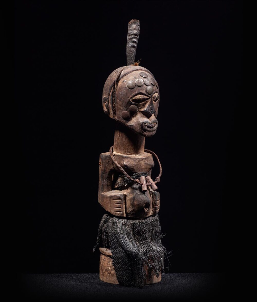 Belief in witchcraft and sorcery was the basis for the creation of many sculptures, which acted as protective devices, in the Congo regions. These figures are more commonly known as power figures or fetishes. Songye figures are characterized by enlarged, sometimes hollow craniums and hands placed over the stomach, where the magical substance would be contained. This figure is beautifully carved with an extremely expressive face. The wood is very oxidized, giving off a dark brown encrusted patina. Multiple metal tacks have been pounded into the figure’s head and face. This is consistent with Songye power figures. The act of pounding metal nails into the sculpture was supposed to help release its magical properties. The duiker horn on top of its head is original to the piece and was used as a receptacle for magical substances.