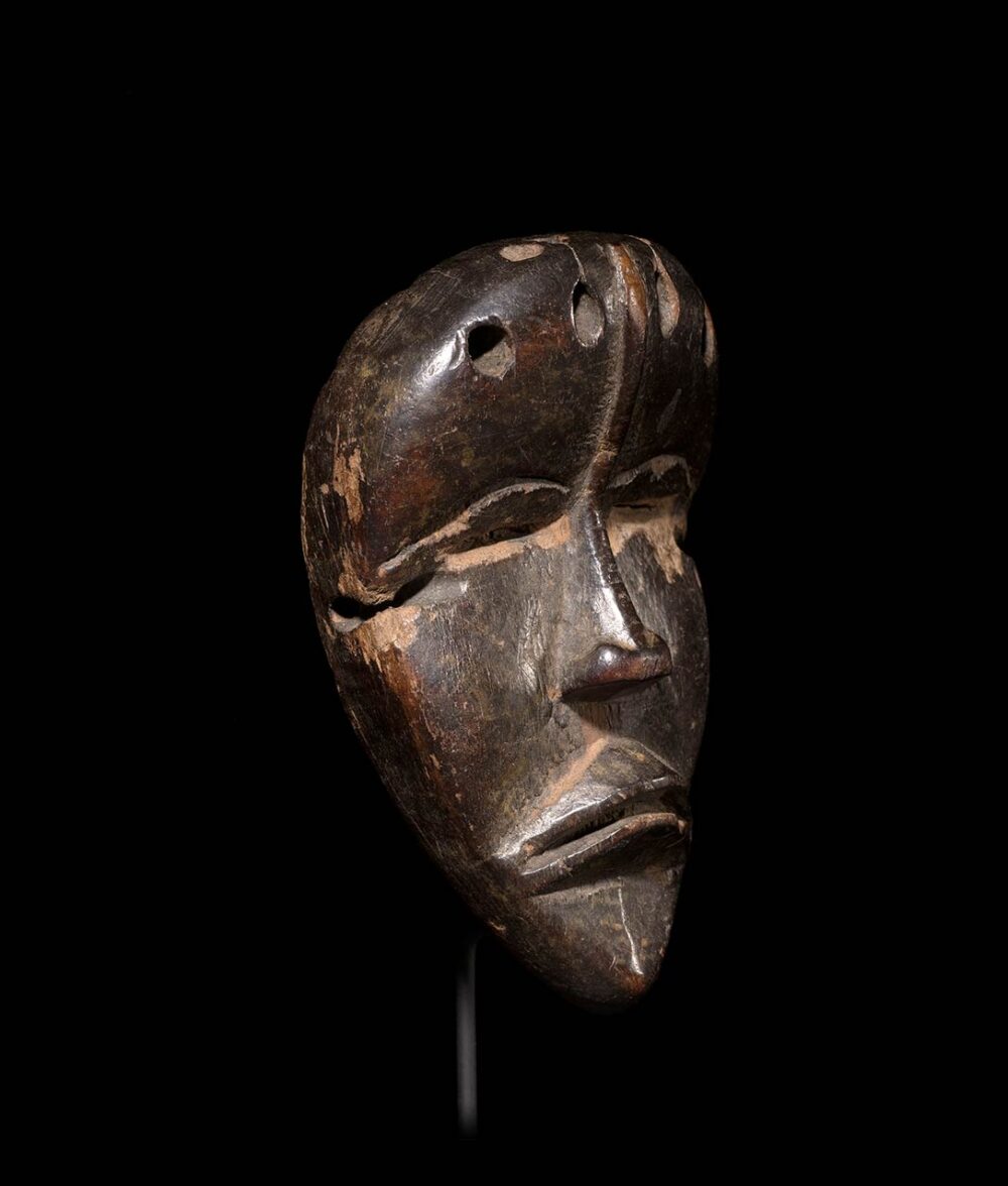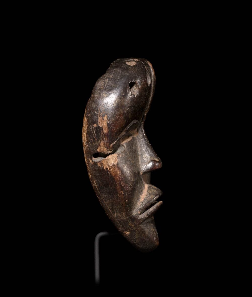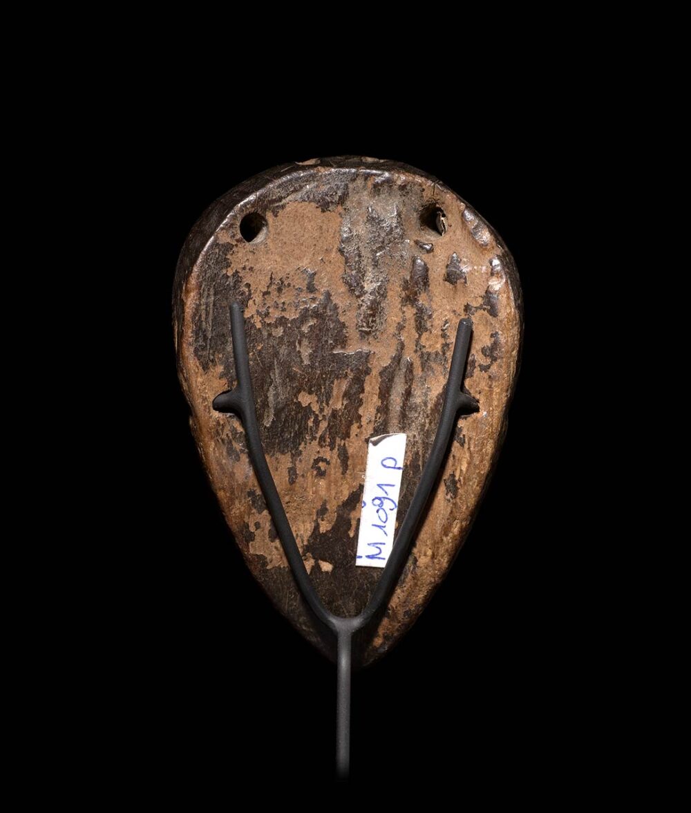 Ma-Go is the traditional term for these miniature masks meaning small head; the term passport has been used by westerners to describe the way these small masks are used; and indeed, they are sometimes used as a passport; a symbol of their clan when they travel from village to village. But these masks also have a more important value; they serve as protection and carry spirits inside them to ward off evil. This example is simply gorgeous; with a deeply pierced forehead, once carrying long strands of beads, and beautiful down cast lips. The wood is hard and slightly eroded in areas from exposure; but the mask is very much intact and quite an impressive example.