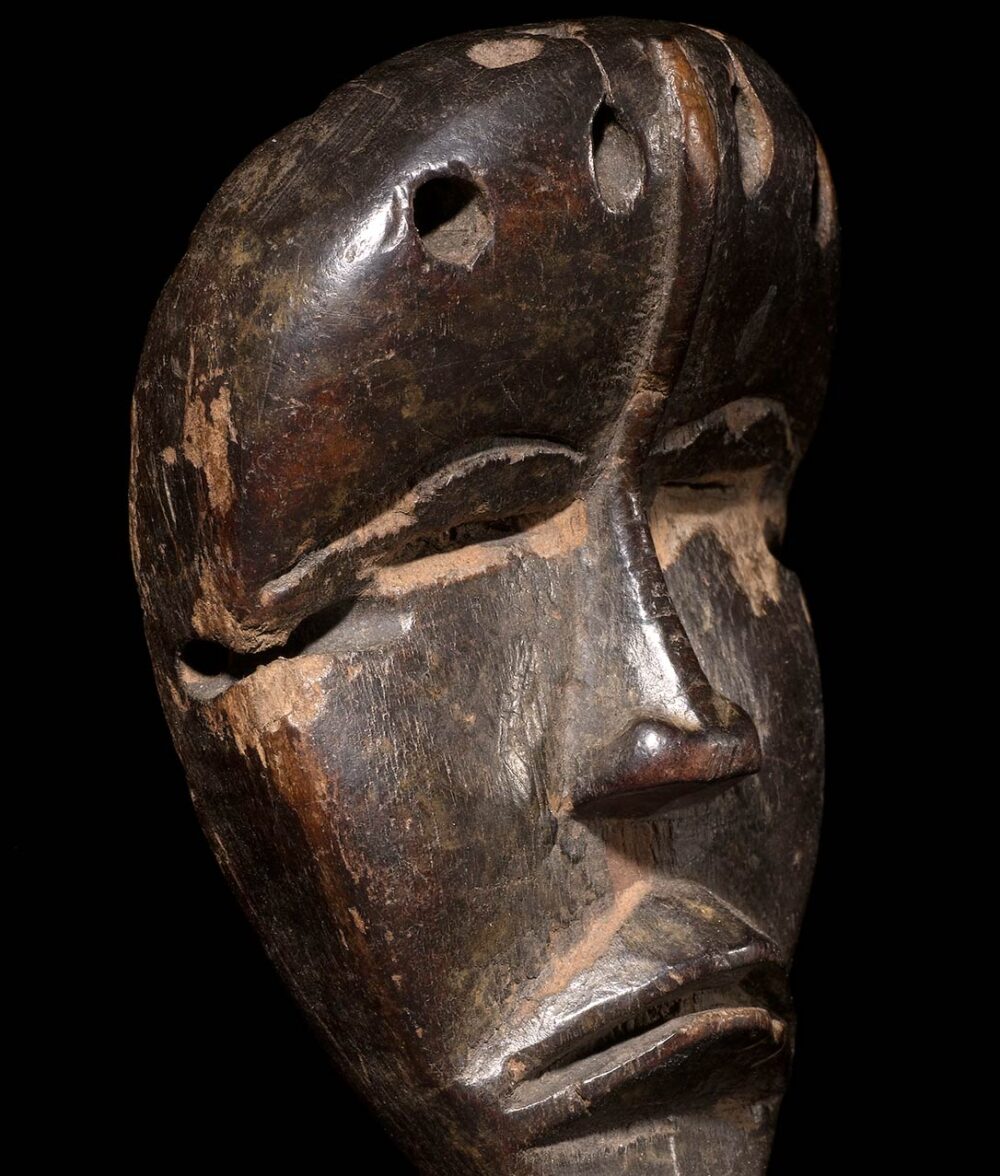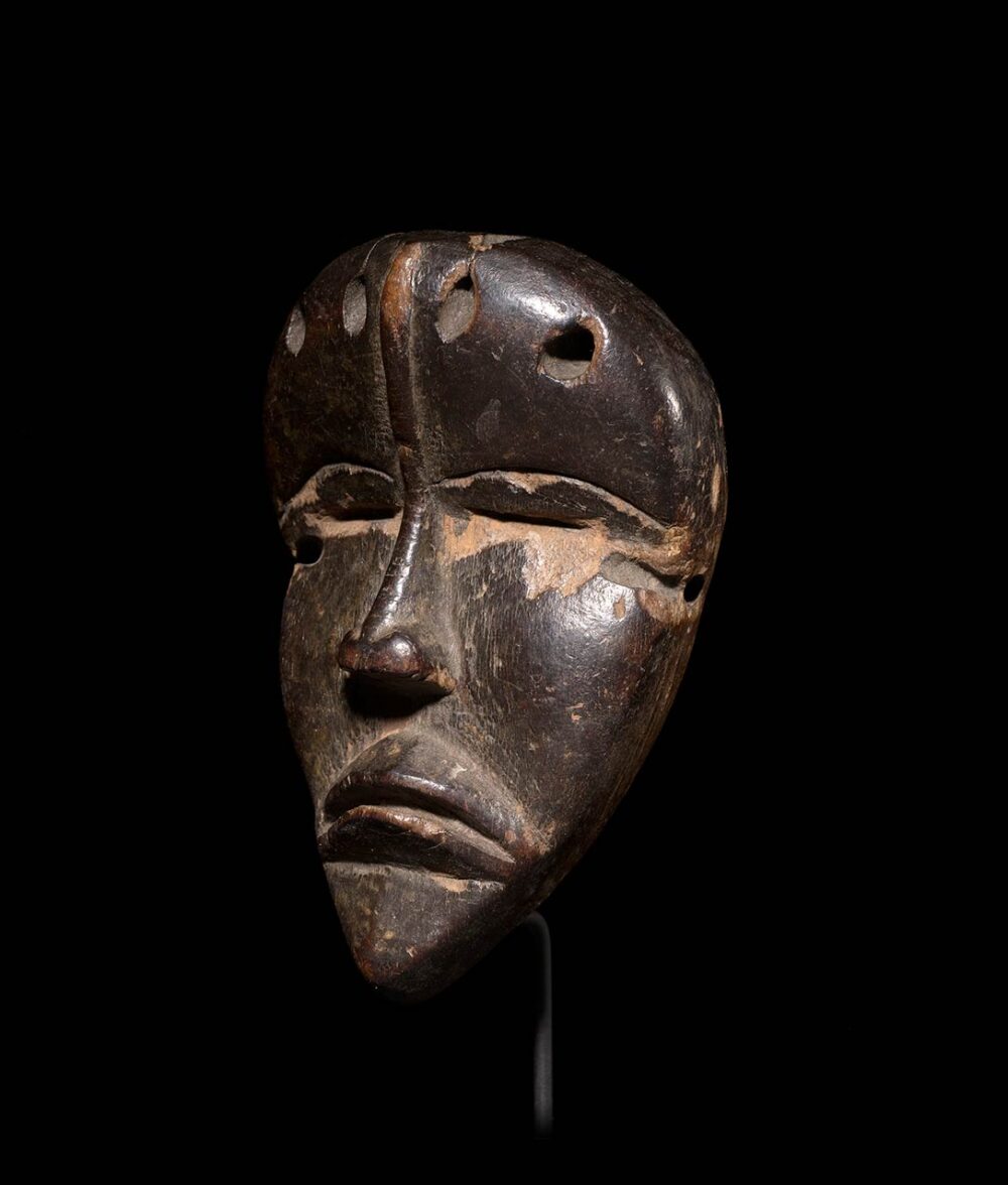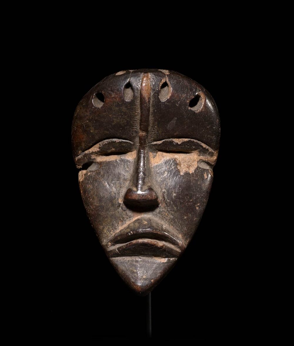 Ma-Go is the traditional term for these miniature masks meaning small head; the term passport has been used by westerners to describe the way these small masks are used; and indeed, they are sometimes used as a passport; a symbol of their clan when they travel from village to village. But these masks also have a more important value; they serve as protection and carry spirits inside them to ward off evil. This example is simply gorgeous; with a deeply pierced forehead, once carrying long strands of beads, and beautiful down cast lips. The wood is hard and slightly eroded in areas from exposure; but the mask is very much intact and quite an impressive example.