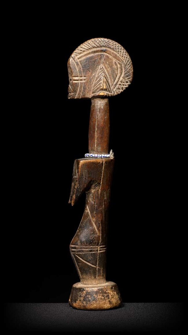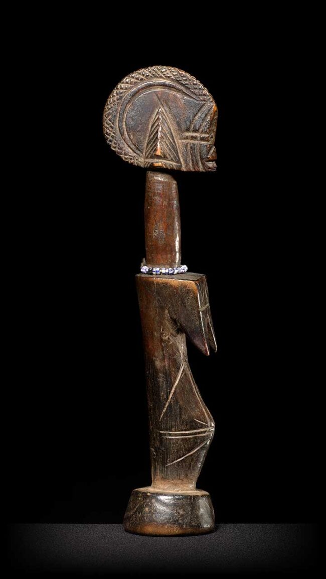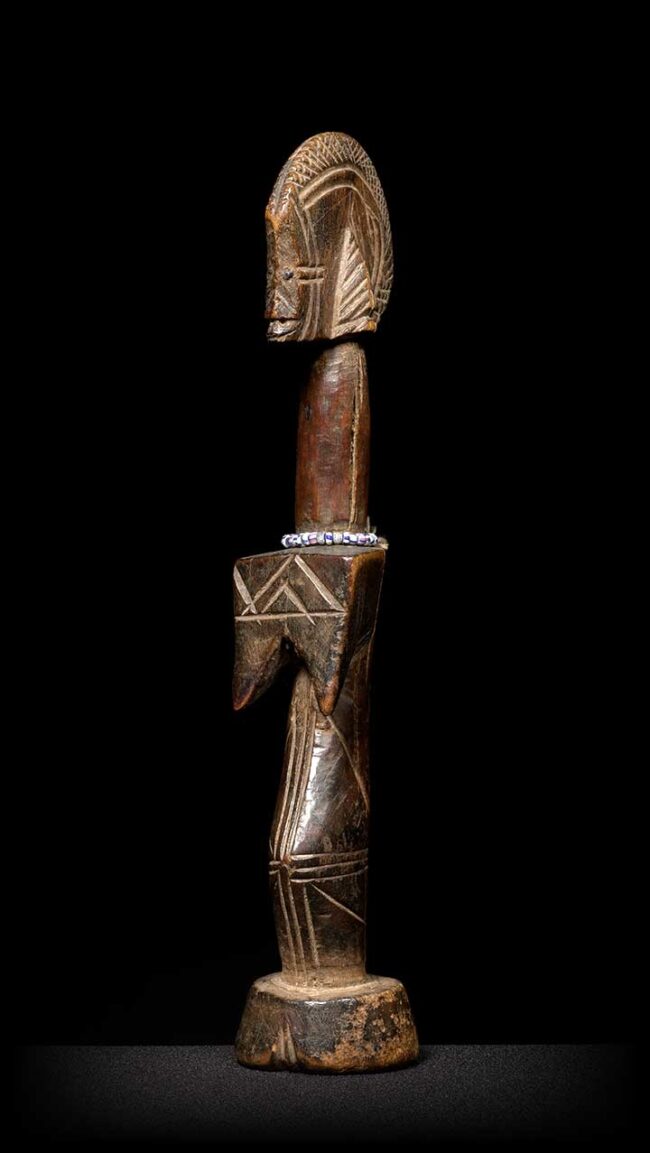 Mossi dolls are made by blacksmiths and given to young girls for play and educational purposes. The figure is made out of a single piece of wood and represents an adult woman, with distinct facial features, hairstyles, and mature female breasts; personifying motherhood. The dolls symbolize fertility and teach girls how to care for their future children. This example is adorned with incised lines representing body scarification and an elaborate hairstyle with carefully delineated braids. This doll is also embellished with a beaded necklace.
