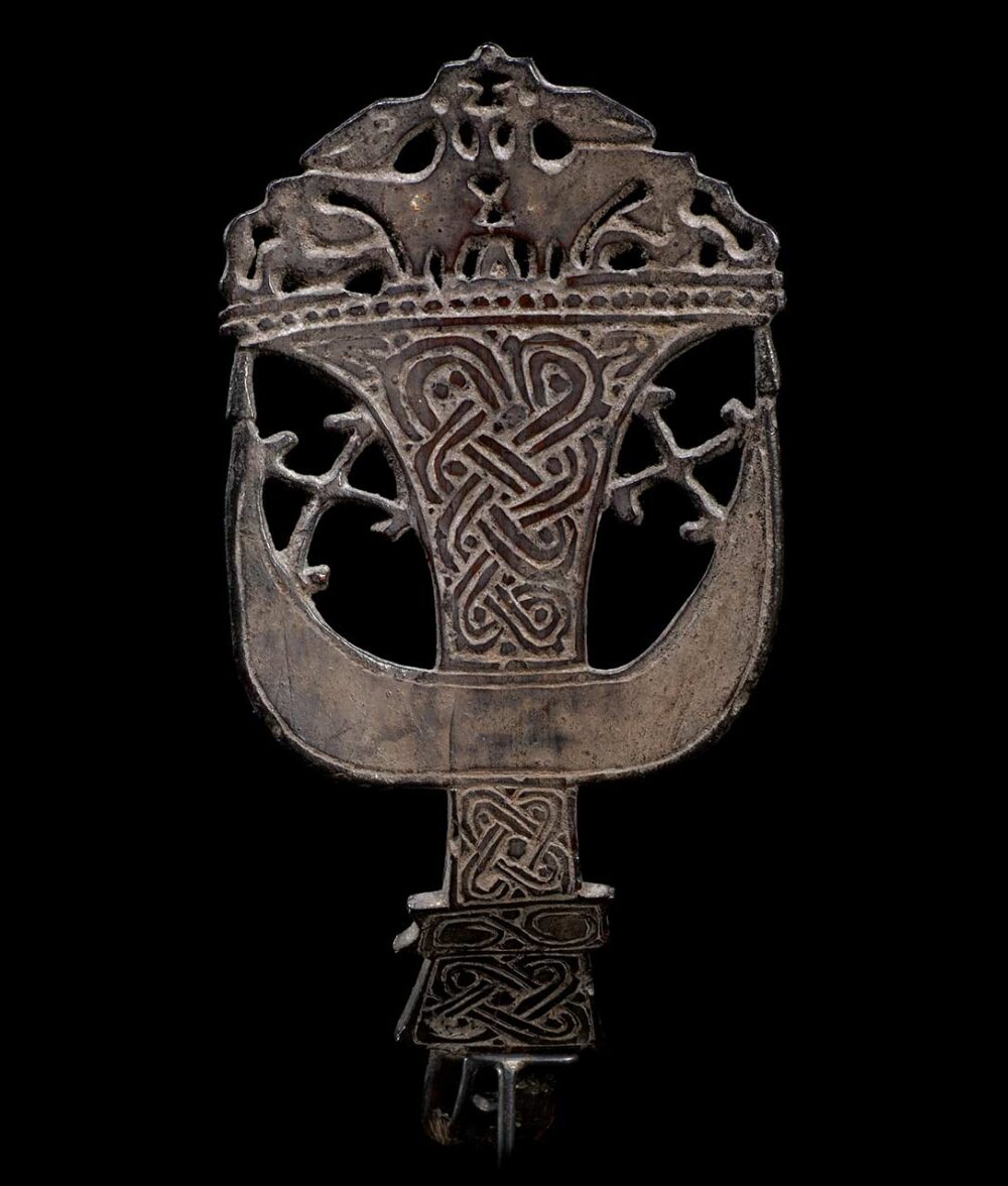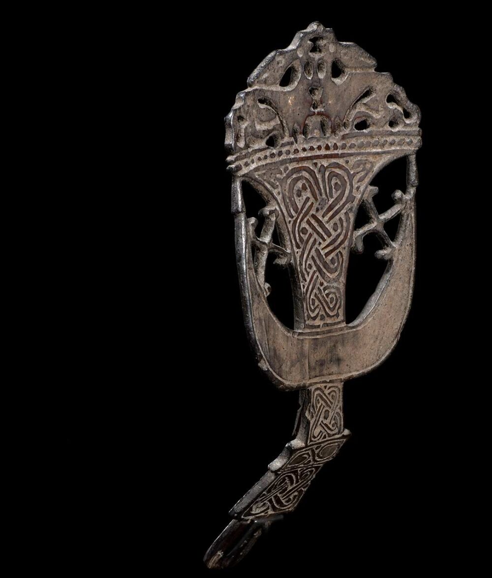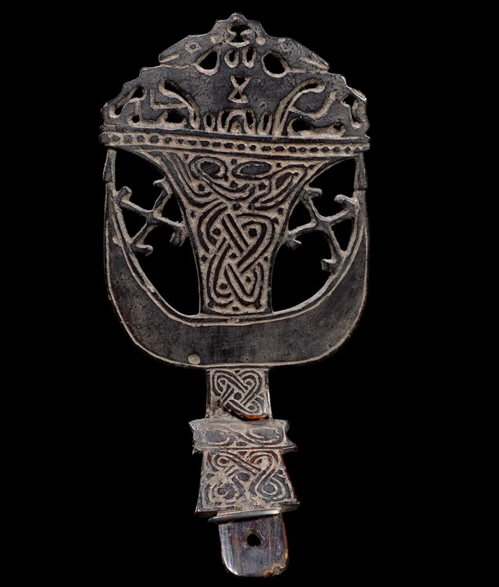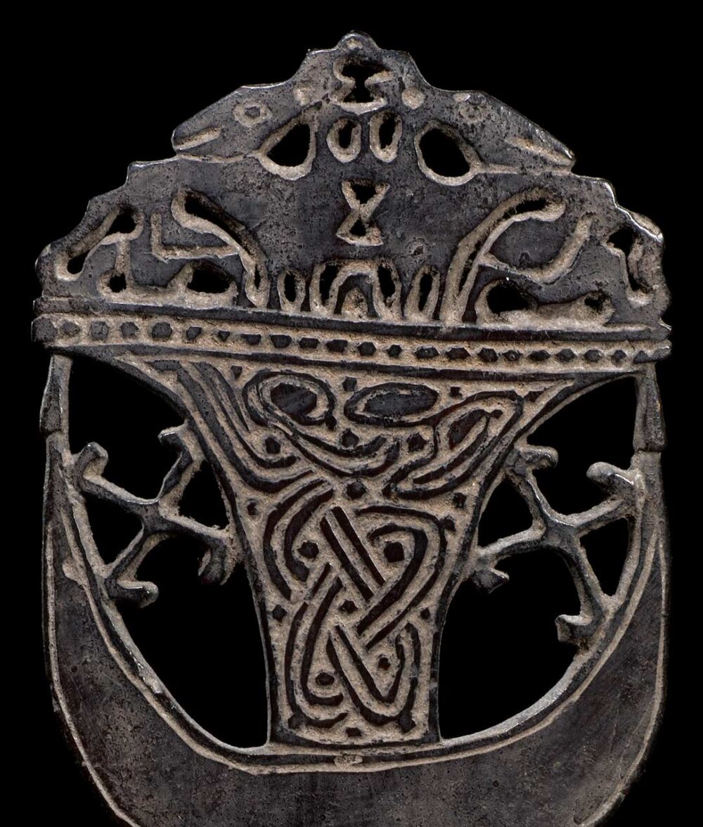 This exquisite comb finial hails from the Lesser Sunda Islands and is meticulously carved from buffalo horn. Unfortunately, the lower part of the fan-like tines is absent, as it would have originally been affixed at the opening located at the bottom. At the crown of the comb, you’ll find intricate adornments featuring stylized animals and archaic open-form iconography, bearing the influence of the Dong-Son culture. Over time, the natural variations in the colors of this material have been further enhanced through extensive handling, adding to its unique charm.