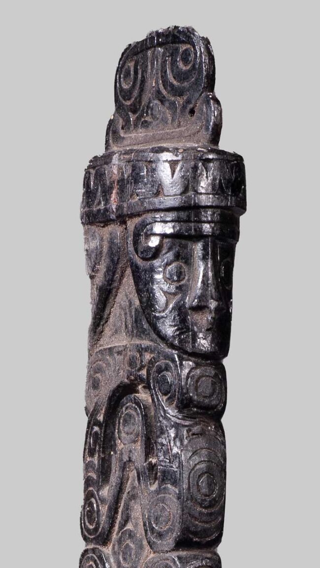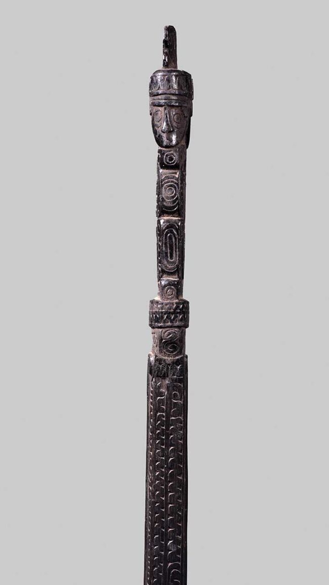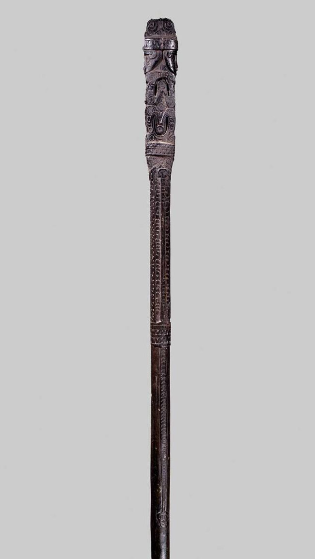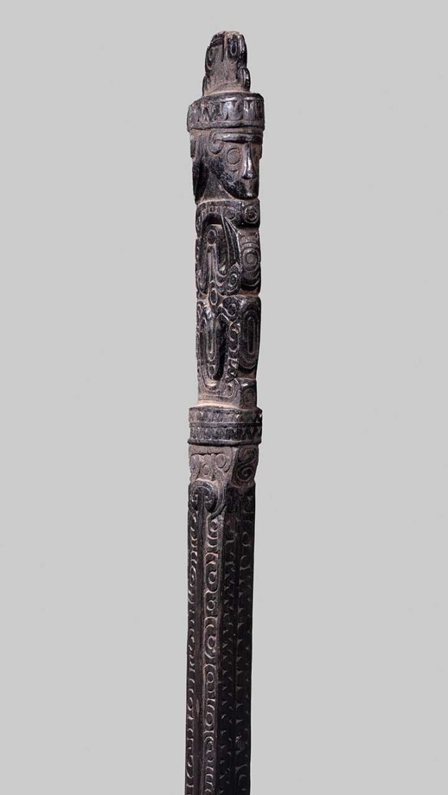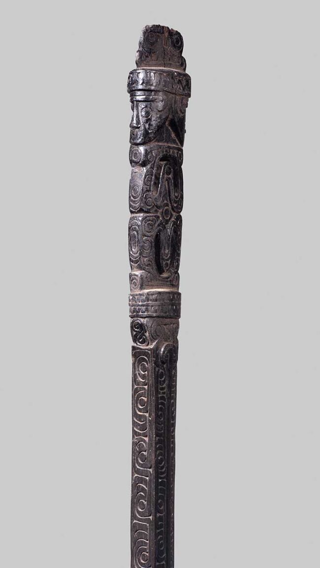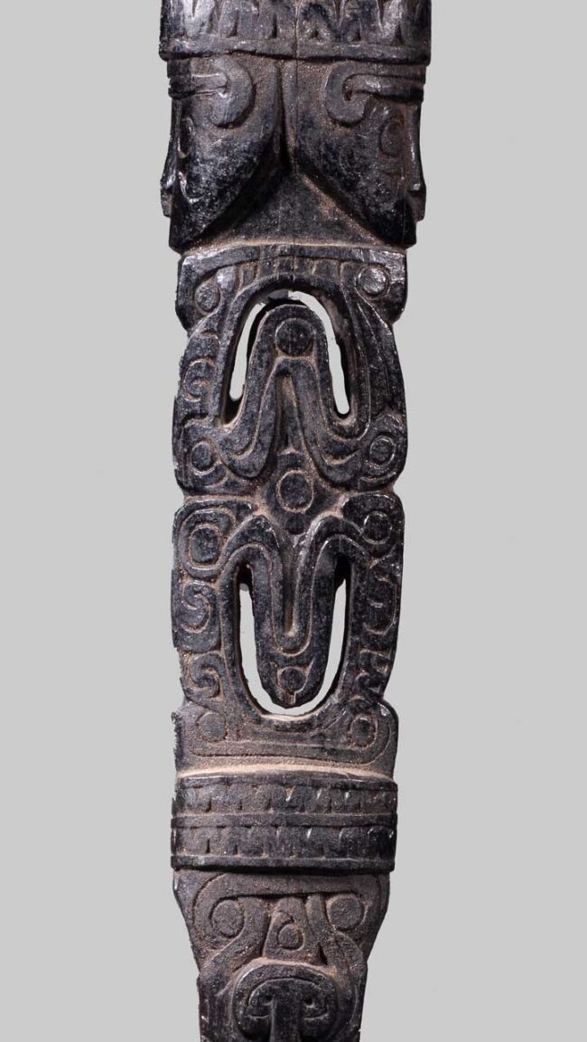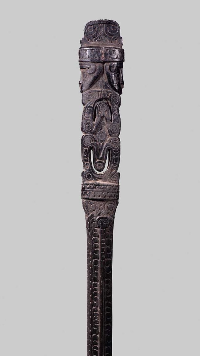 This staff is topped by stylized squatting Janus figures, decorated with curvilinear scrolling designs, creating an overall impression of fluidity and motion. Its complex well-handled dark and lustrous patina attests to the numerous rituals it was used in The staff holds great cultural significance for the Massim people, who believe that it possesses powerful magical properties.