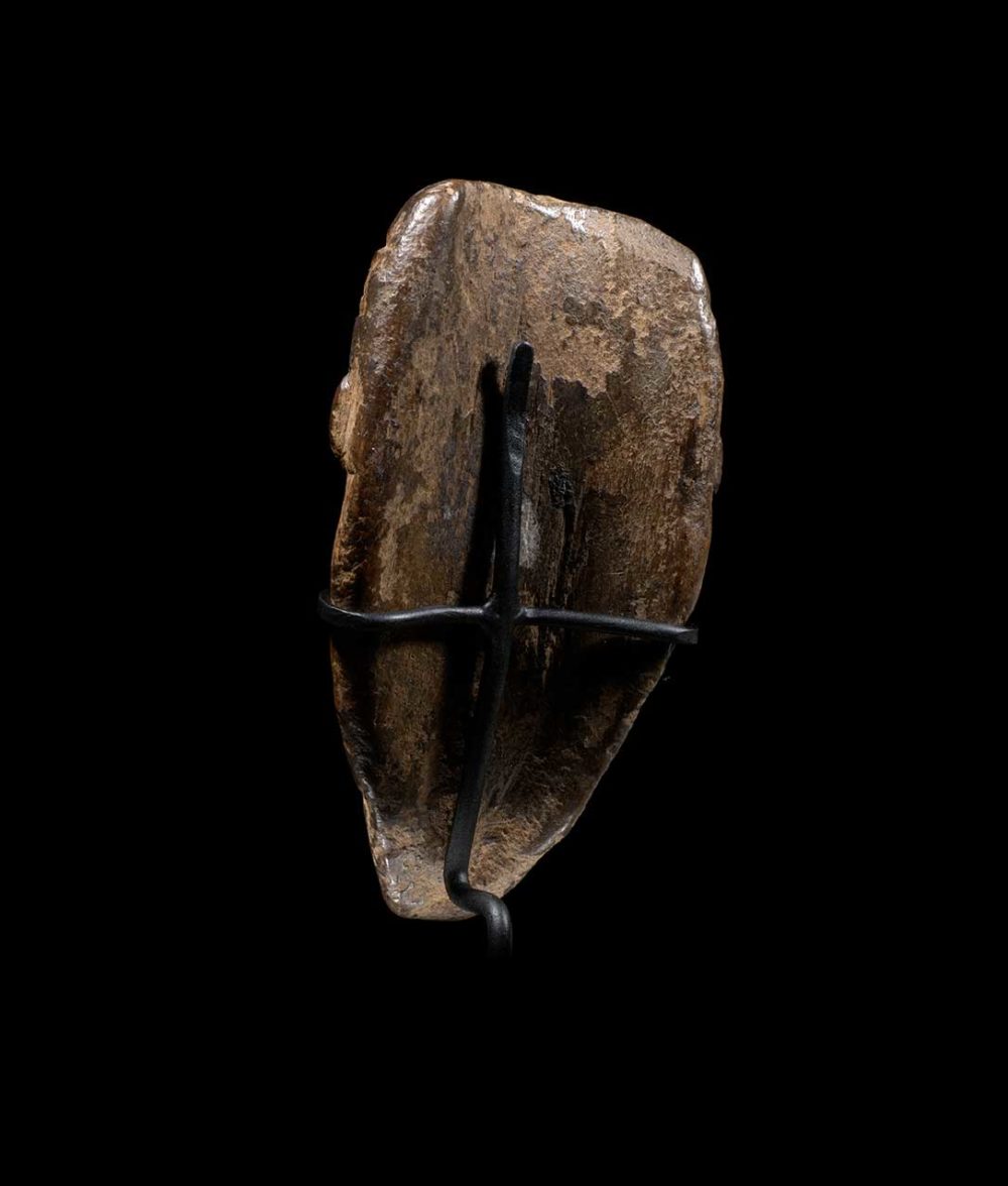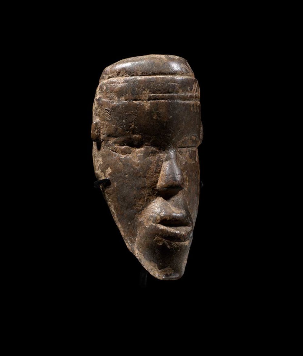 This ma go, like all Dan miniature masks, has several other vernacular names, all related to its sacred role: being a small-scale copy of a mask-spirit, it is believed to contain a fraction of its powers. Small offerings can be made and the ma go is often carried with a leather pouch or an antelope horn filled with medicinal herbs. The slitted eyes of this piece suggest it is an attractive feminine figure.