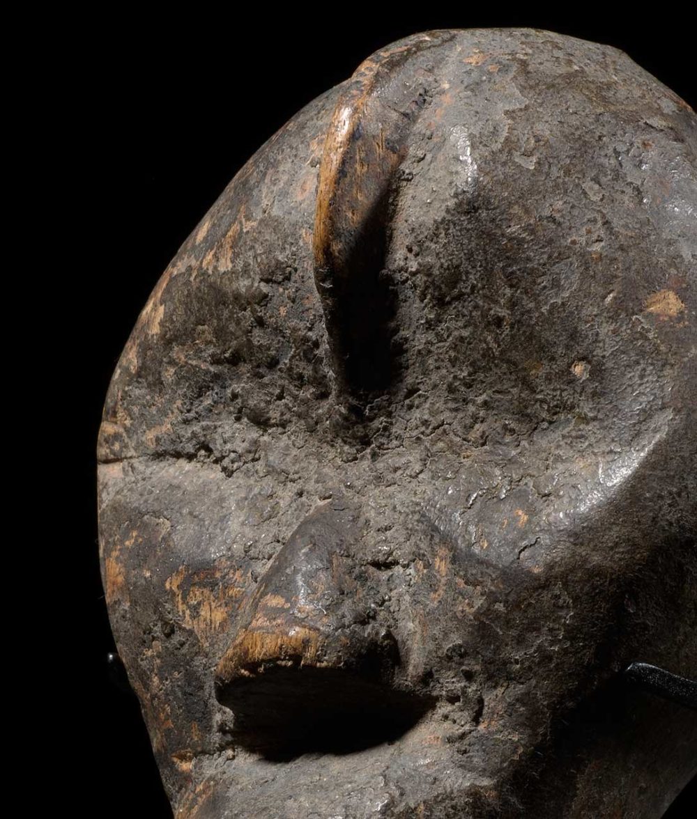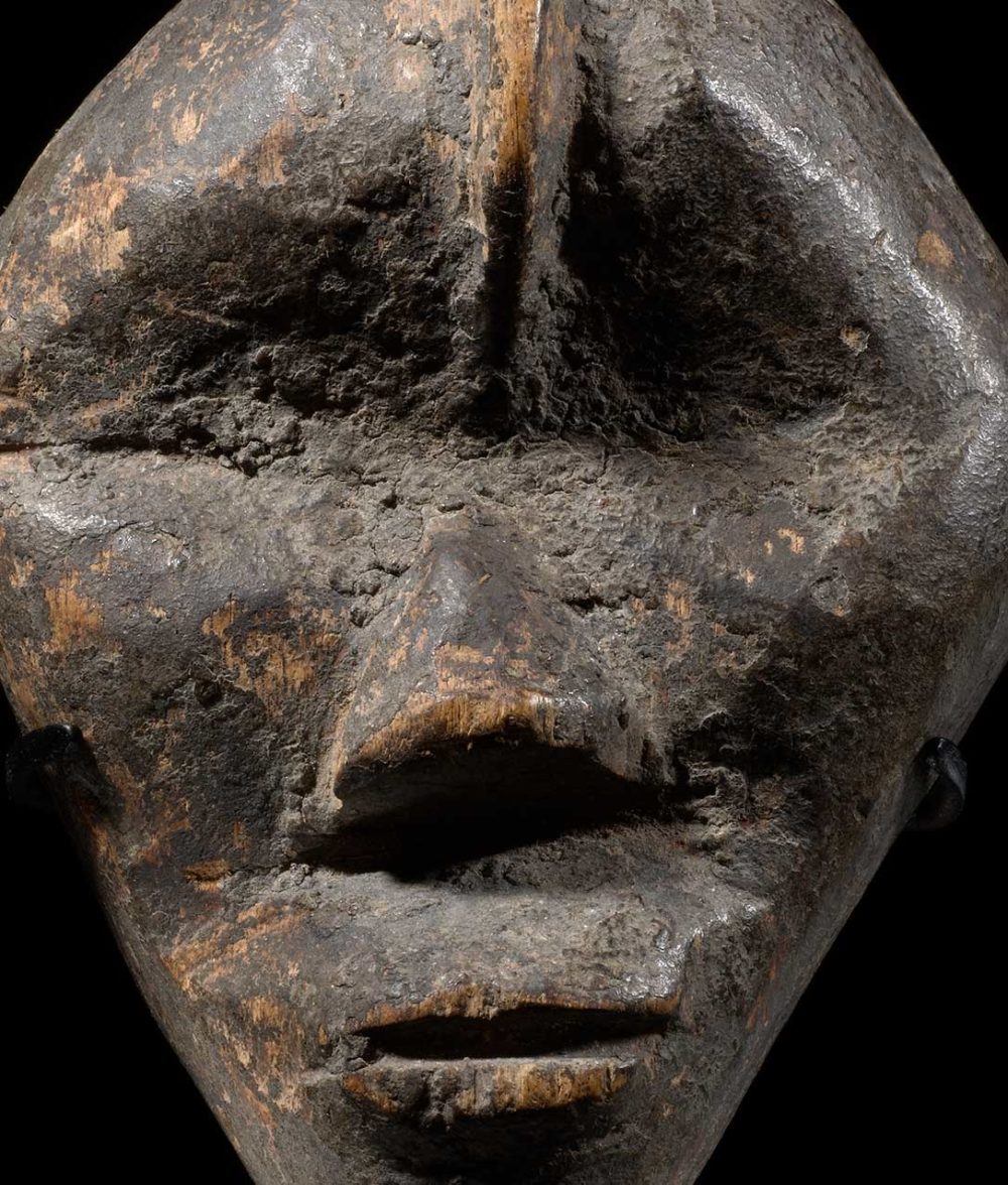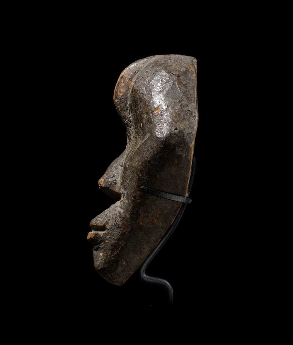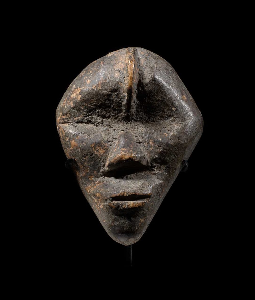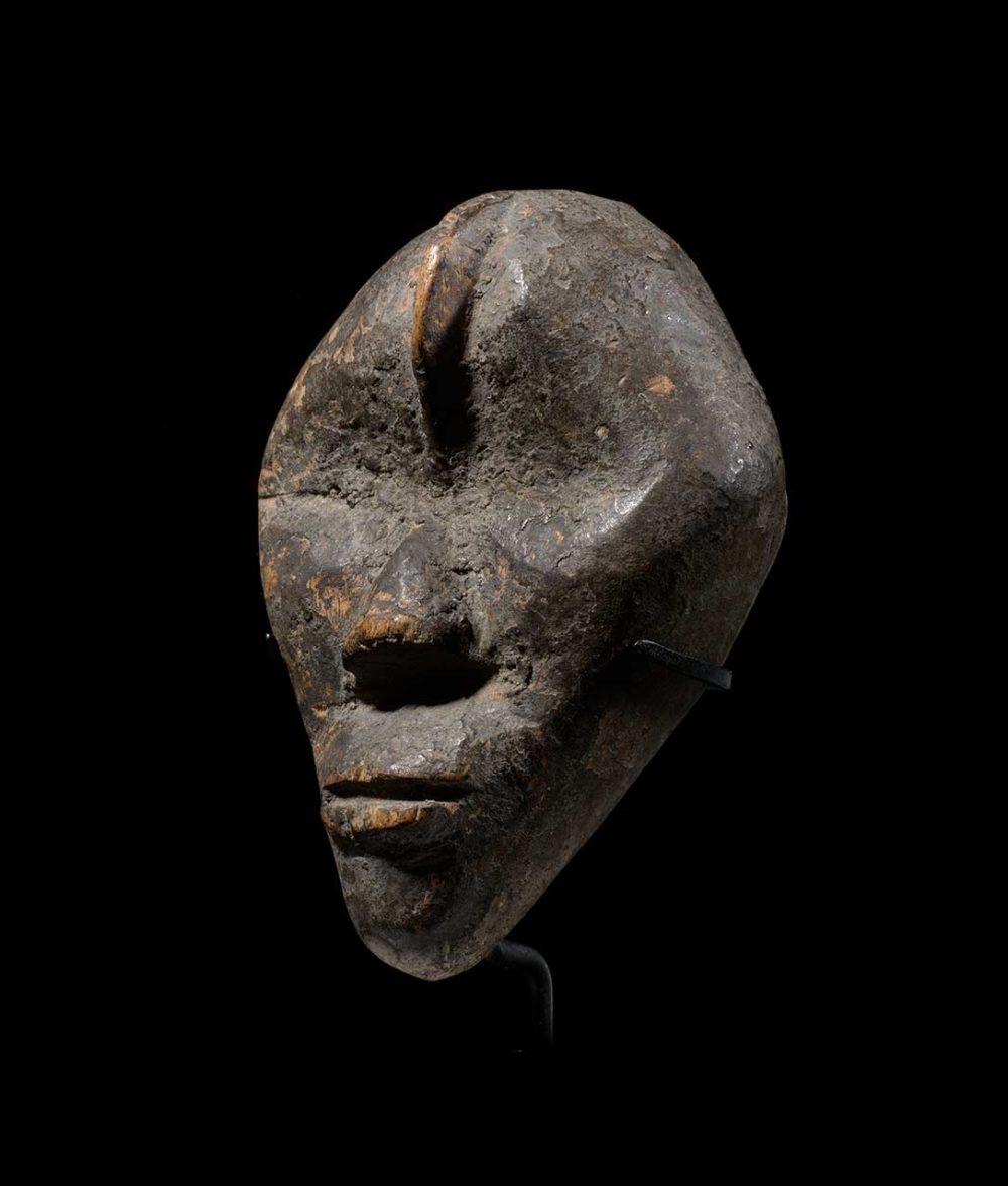This is another example of the sophisticated Dan production of passport masks, or ma go. This powerful diamond-shaped mask could embody an important family mask when its owner traveled abroad, to keep a spiritual link with the main mask-spirit. Both men and women could own one as an important means of identification. Miniature masks could also be used in circumcision rituals.