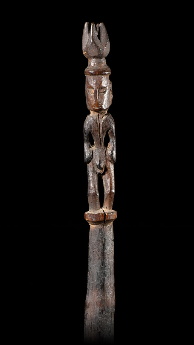 Spatulas for the application of Lime can be found all over Oceania. This example is from the Admiralty Islands; figurative sculpture from this area is difficult to acquire. This example consists of a finely carved ancestor with elaborate headdress. There is great attention to detail; such as a delineated scapula, and arms that are carved away from the body. The patina is rich and deep from generations of use and handling. In excellent condition.