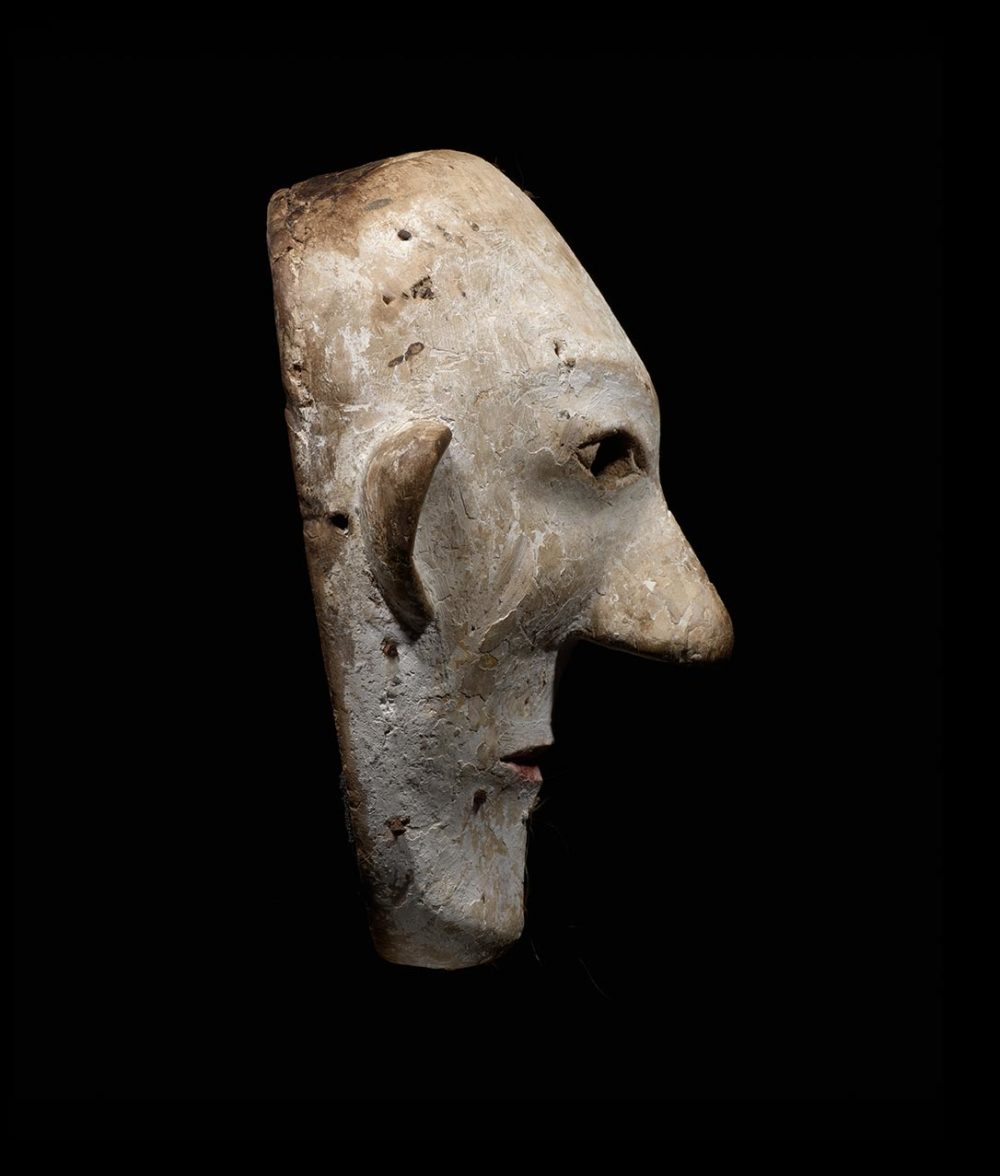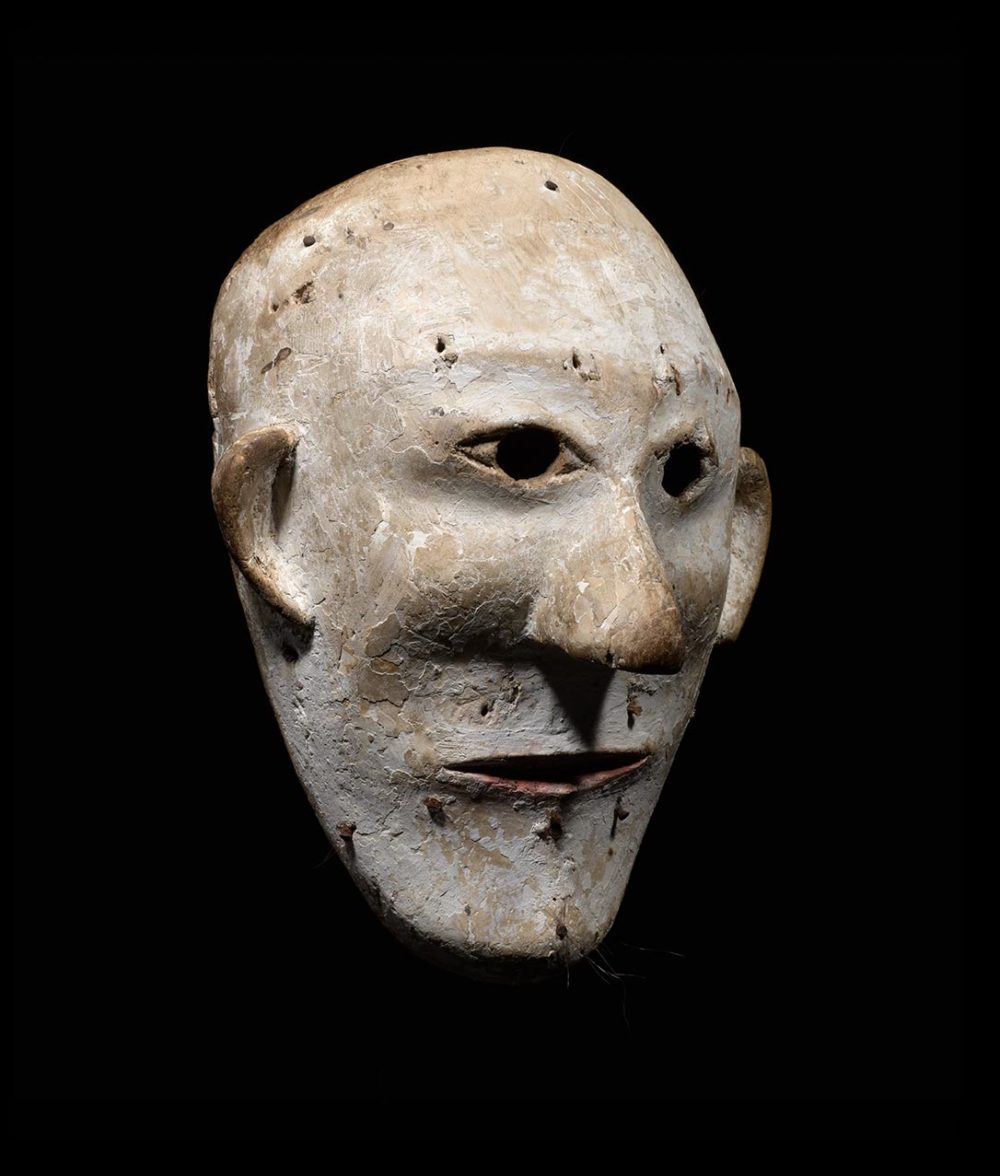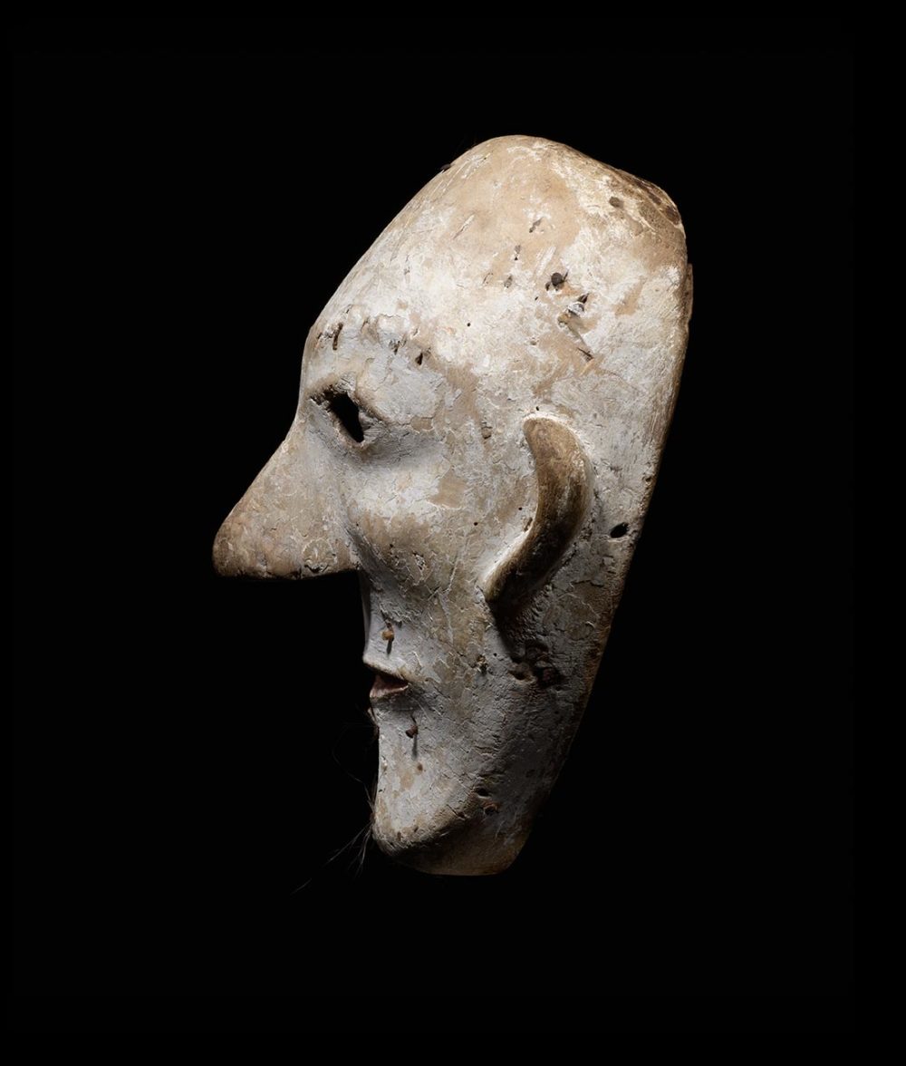 This striking mask is carved from a lightweight and light colored wood, which has a received, an undercoat of light brown pigment to imitate skin tone. The front of the mask has been over painted in natural white pigment. There are numerous wooden pegs inserted throughout the mask’s surface that held hair, some of which still remains. Small round eye holes pierce through the mask, so that the performer can orient himself. The overall shape of the eyes along with subtle details such as the highlighting in red of the lips and the raised cheekbones, convey a sense of naturalism.