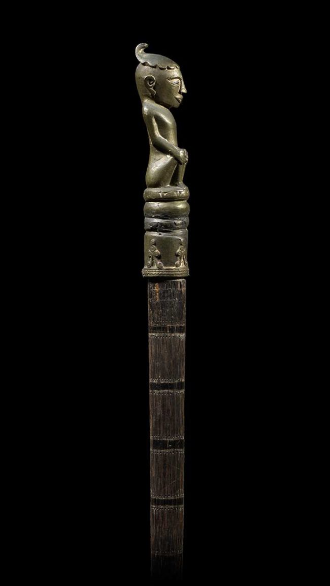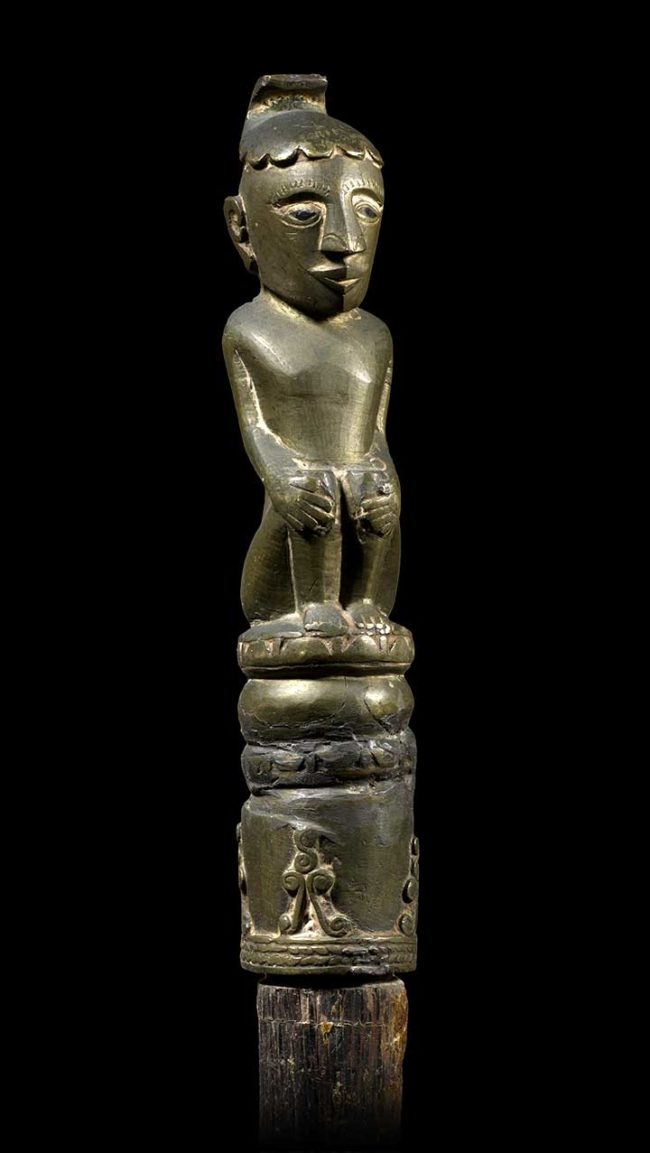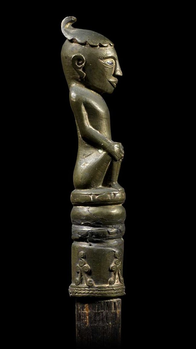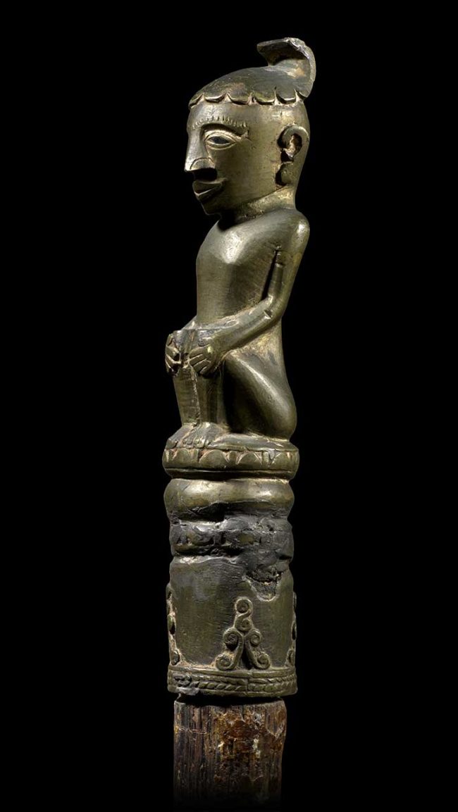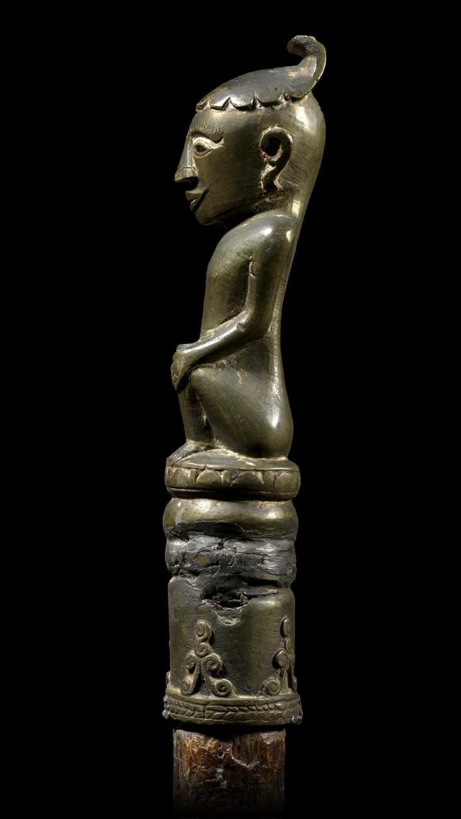 The most important object carved and owned by the Batak datu priests were certainly their magic staffs. This early example has a finely cast bronze figure in a classic hunkered position, with a deep and handled patina. Originally, bands of rattan would have been woven around the lighter sections of the upper portion of the staff. For a related example, ref. The Batak, by Achim Sibeth, pg. 128.