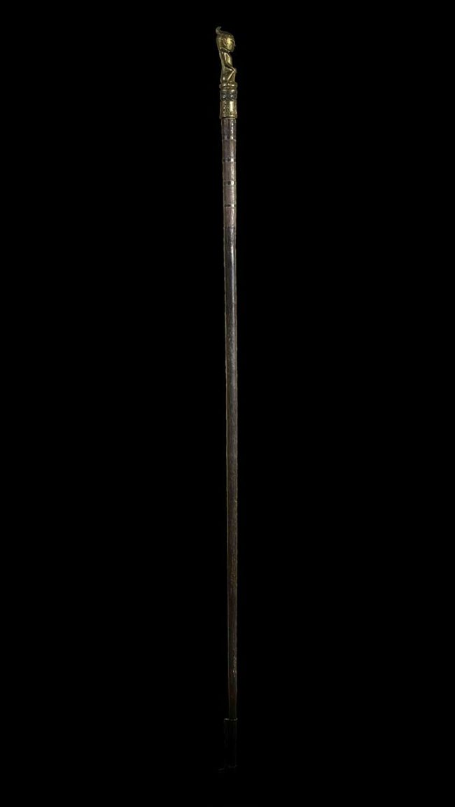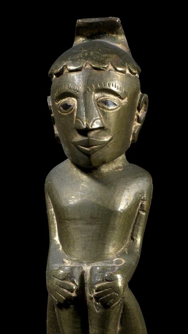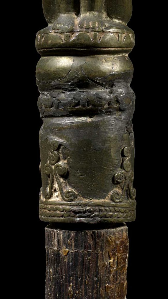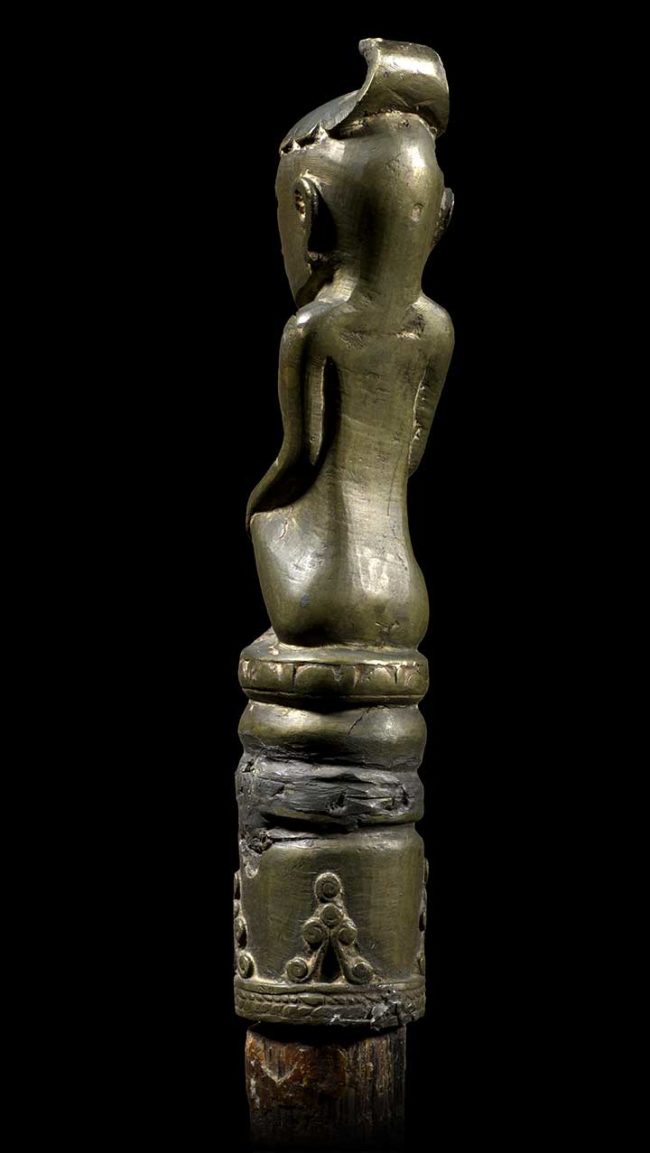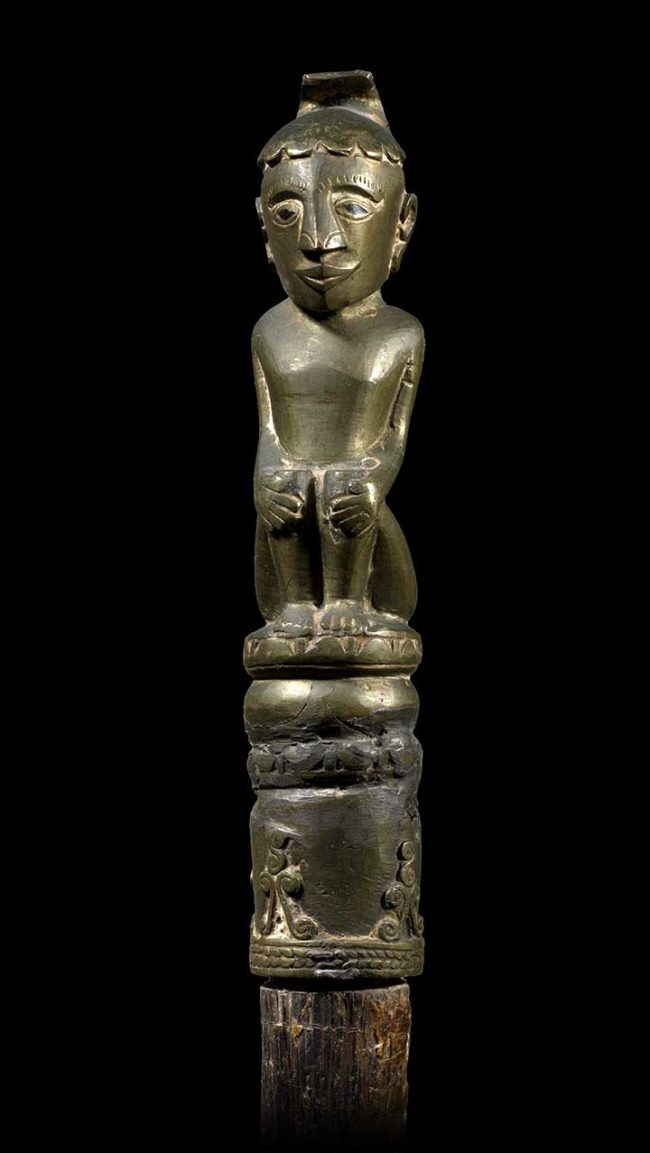 The most important object carved and owned by the Batak datu priests were certainly their magic staffs. This early example has a finely cast bronze figure in a classic hunkered position, with a deep and handled patina. Originally, bands of rattan would have been woven around the lighter sections of the upper portion of the staff. For a related example, ref. The Batak, by Achim Sibeth, pg. 128.