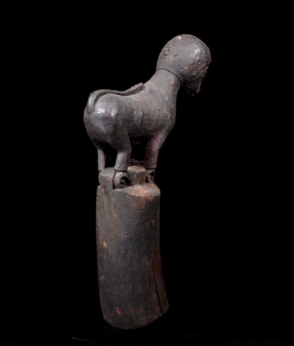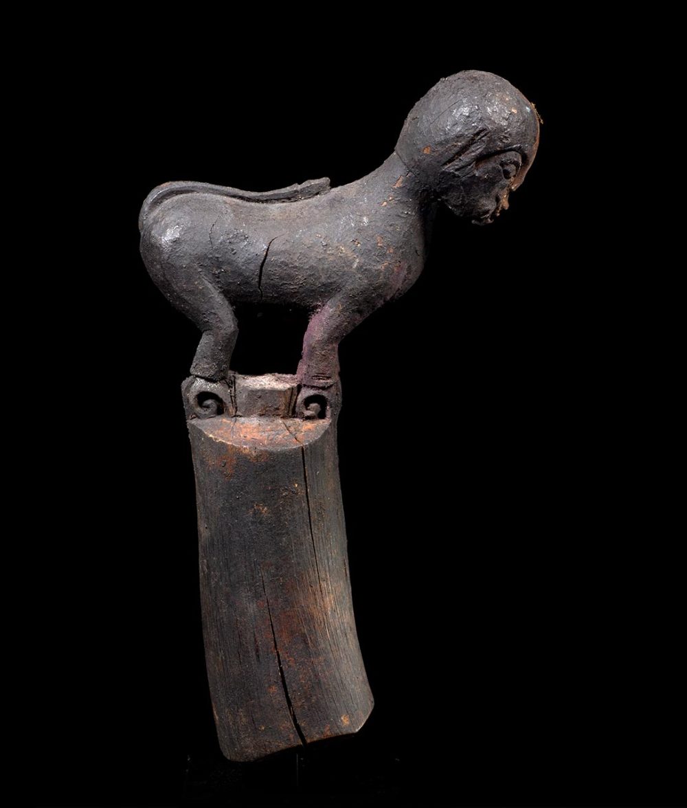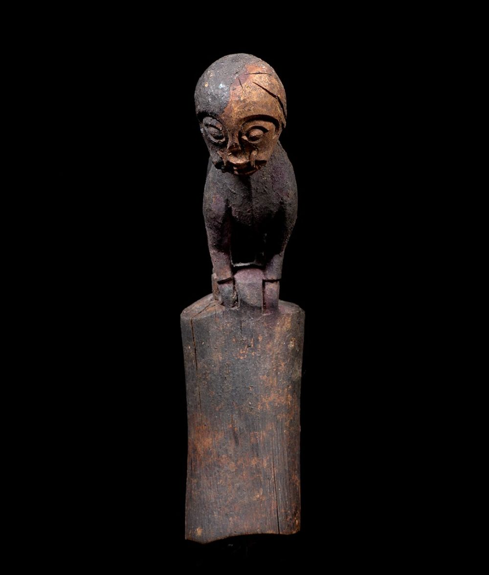 This wooden stopper would have surmounted a very large bamboo container; shaman’s used to store medicine and “magical” substances. The stopper is carved in the form of a stylized Tiger Cat, linjau. The sculpture is superb. There is great tension and elegance found throughout the carving. Its patina is dark and encrusted, evidence of prolonged use and libations.