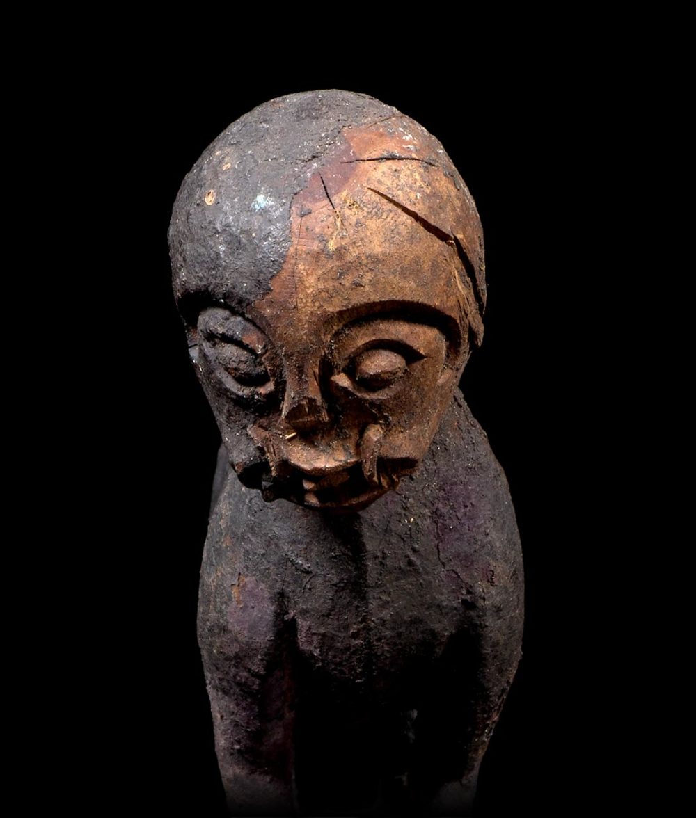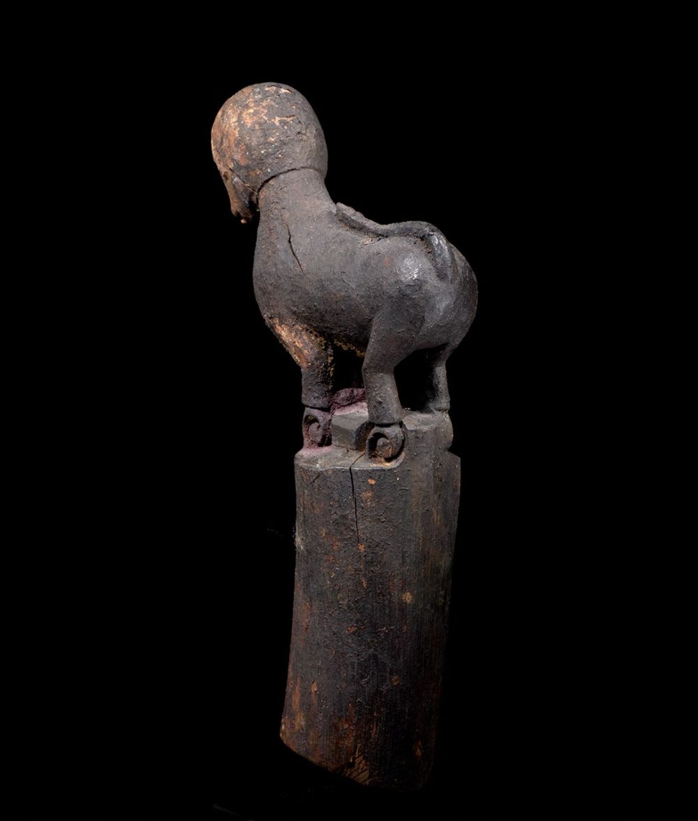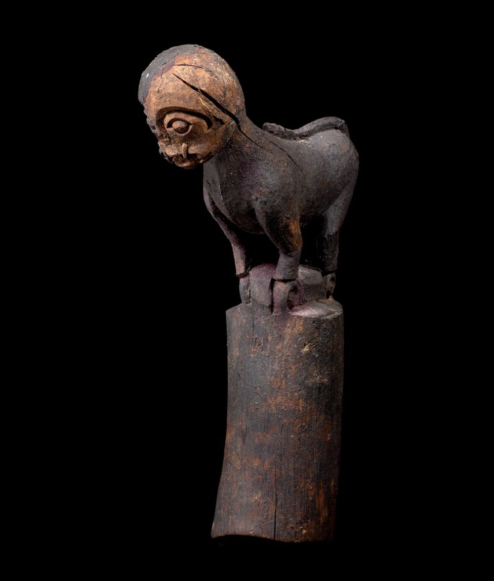This wooden stopper would have surmounted a very large bamboo container; shaman’s used to store medicine and “magical” substances. The stopper is carved in the form of a stylized Tiger Cat, linjau. The sculpture is superb. There is great tension and elegance found throughout the carving. Its patina is dark and encrusted, evidence of prolonged use and libations.