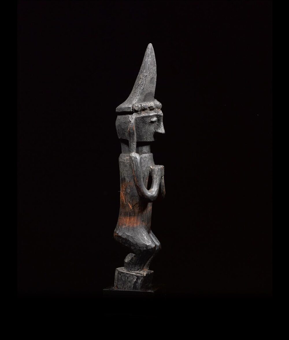 These sculptures represent the founding ancestors of important lineages in Nias society. Playing a vital role in daily life, the sculptures would have been present in each noble household, serving as a supernatural protector of the home. This example is an early rendition suggested by its archaic style. Depicted in a standing position and grasping a cup with both hands, the figure is adorned with an elaborate crown, a marker of its noble status, which would have been worn during major festivals. The surface is heavily encrusted, indicating it was displayed for many decades near the upper rafters of the home; exposed to the smoke and soot emanating from the hearth.
