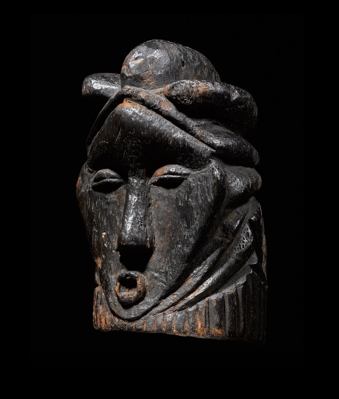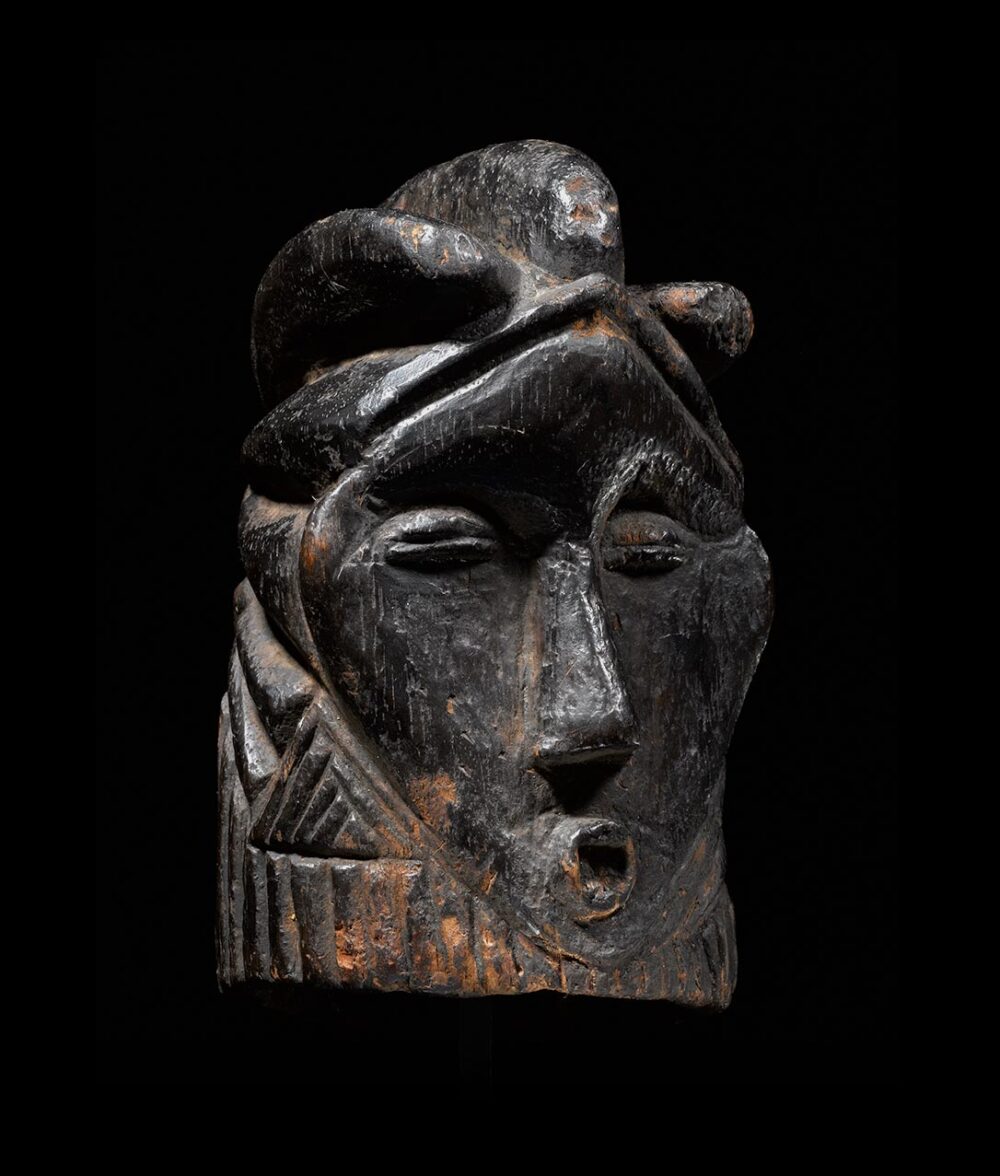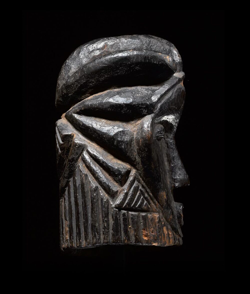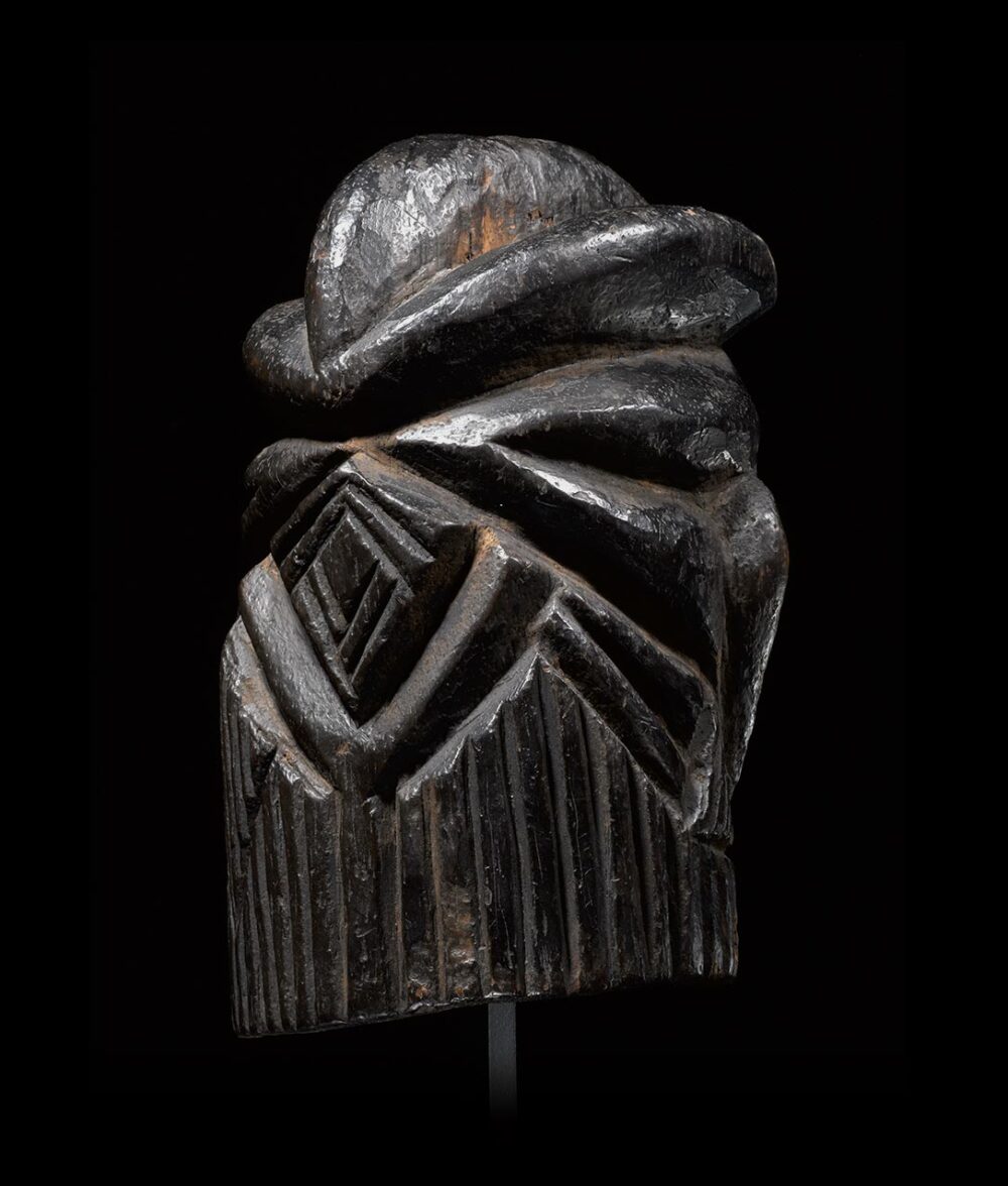 Bassa Helmet masks are very scarce; most collectors are more familiar with the Bundu masks created by the Mende. Miniature examples are even rarer. This example was never worn, instead it was created to be part of a sacred shrine, whether personal or collective, this miniature mask was fed regularly to remain strong and able to help its owners. Food may be simply set before it, or the offering, such as rice or oil, may be rubbed or poured onto it. On special occasions a sacrificed chicken’s blood is spilled onto the mask. Its dark and deep patina attests to the numerous ritual libations it received. The sculpture is strong and compelling, the face is angular and diamond shaped, and its mouth is open and extended, as if it’s calling out to the spirit world.