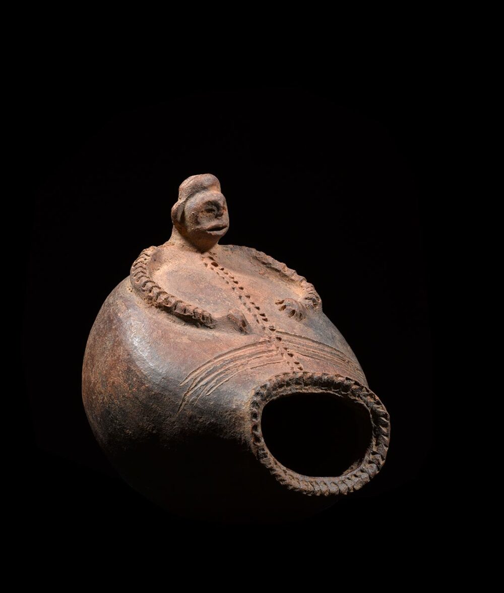 This distinctive bowl has an abstracted face at one end with bands of horizontal slits for eyes and a large opening representing its mouth. Another human head surmounts the vessel, projecting upward and has attached arms bent toward the center. Inside it contains what appear to be the remains of offerings. No definitive research has been done to confirm the exact function of these types of vessels.