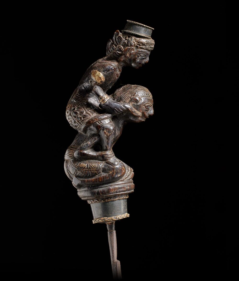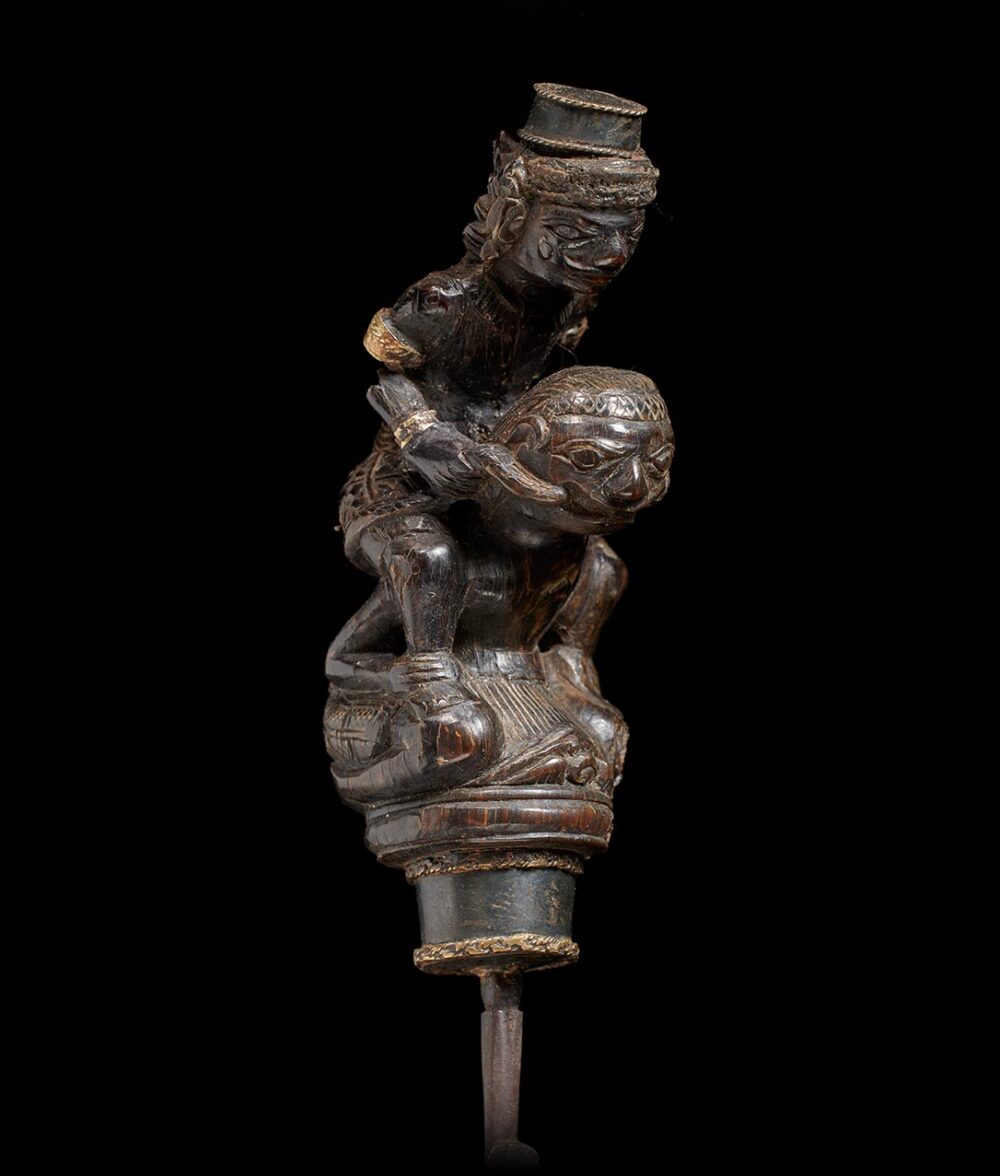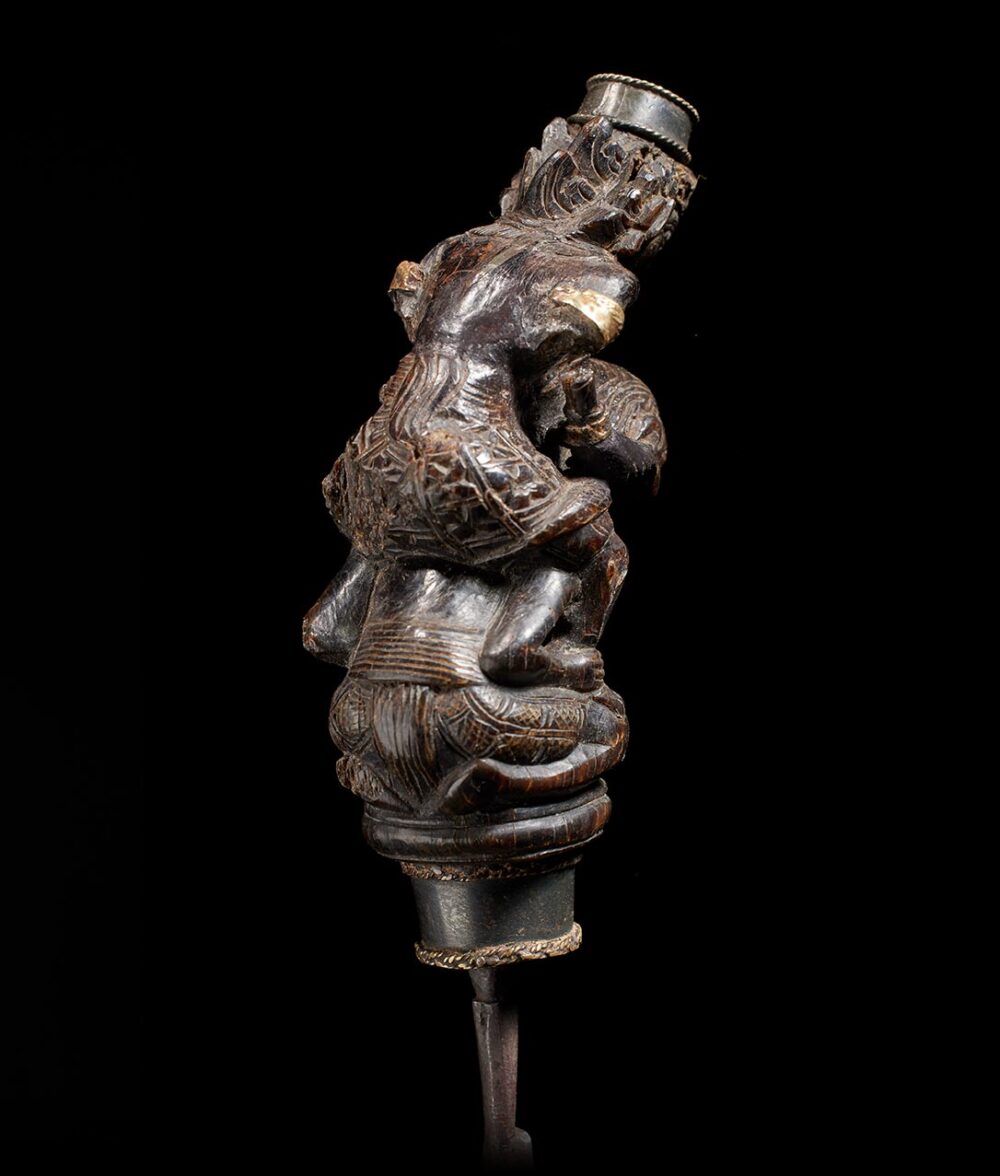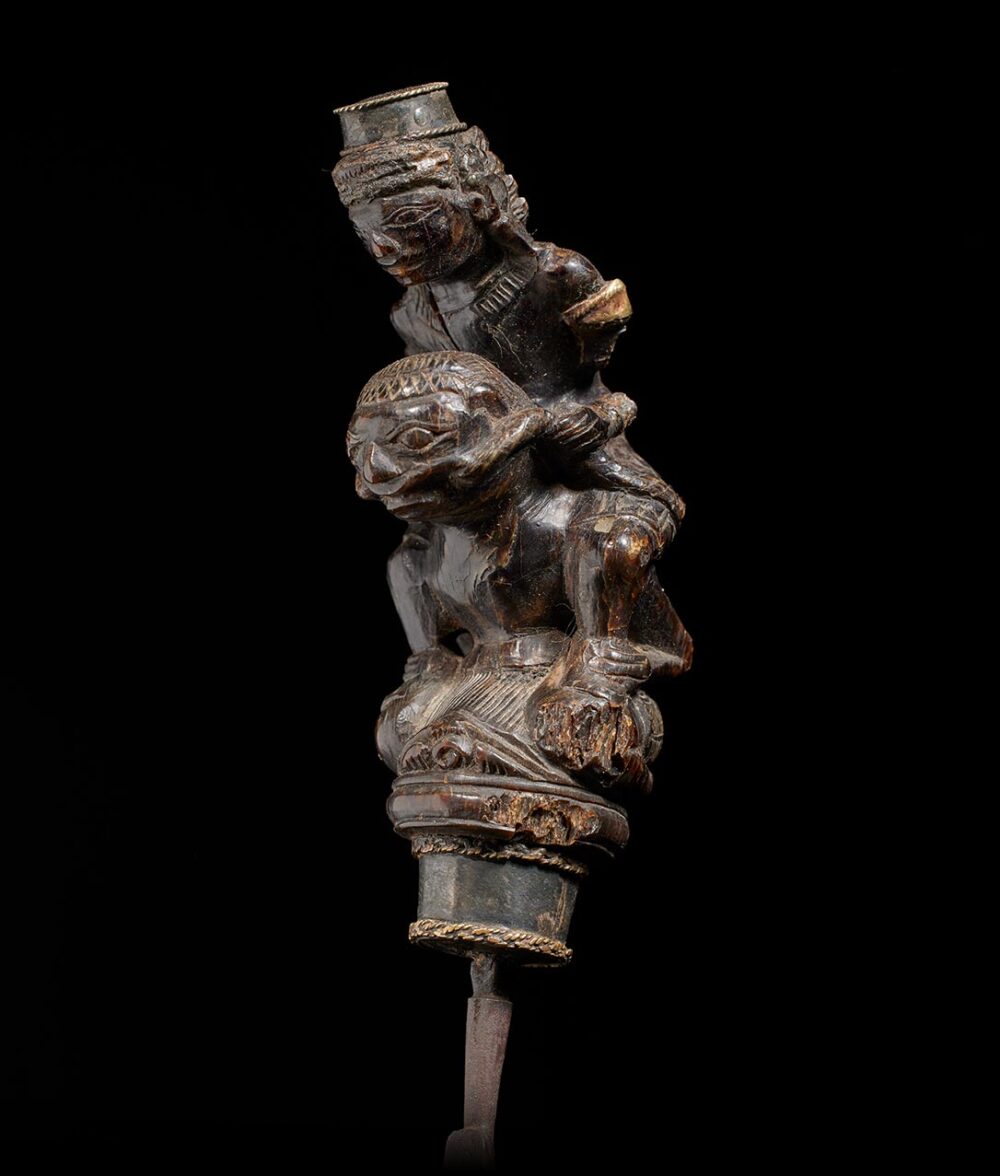 Elderly individuals without teeth depend on pestles featuring chisel-like blades to crush the tough areca nuts, a primary ingredient in betel chewing. This pestle is a genuine master-work of sculpture, showcasing an astonishing level of detail. The handle is both thick and imposing in size, depicting a female figure riding atop a male figure, both with highly animated expressions. This object possesses considerable age and a well-worn surface that demonstrates the Indonesians’ ability to create a monumental miniature masterpiece.