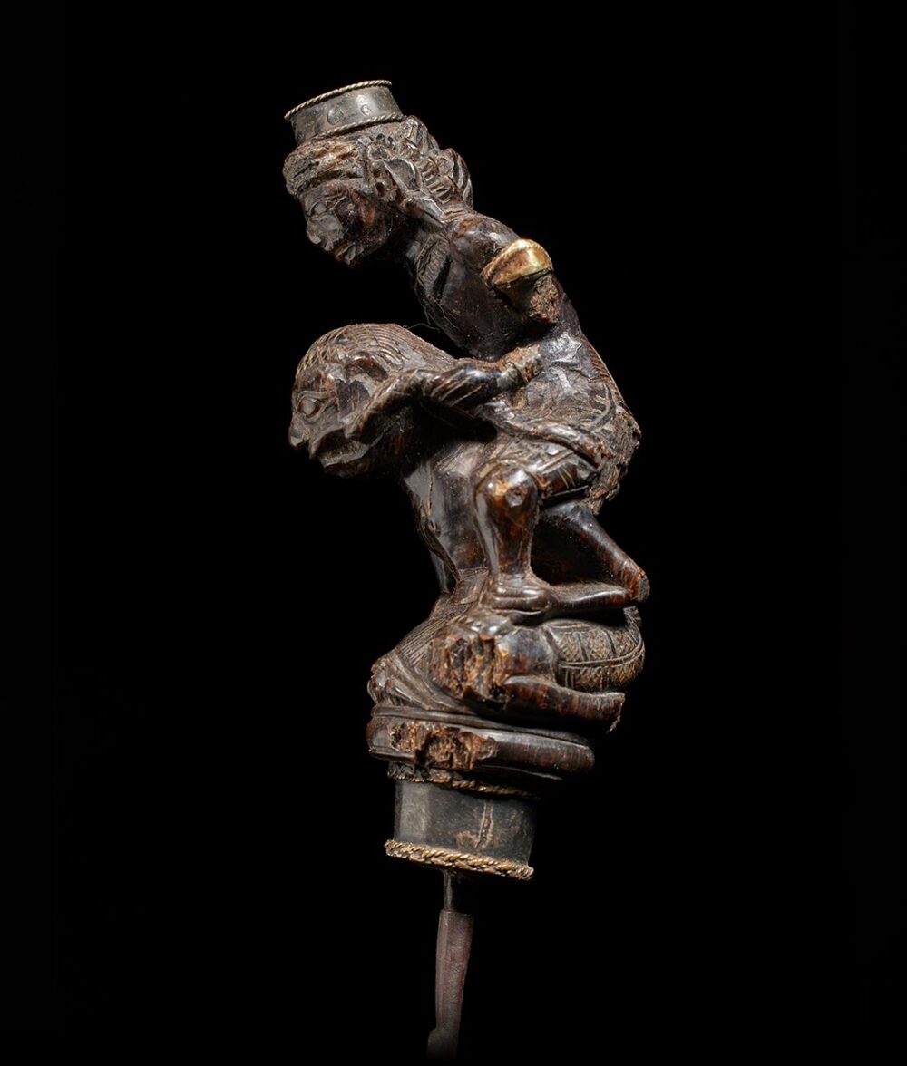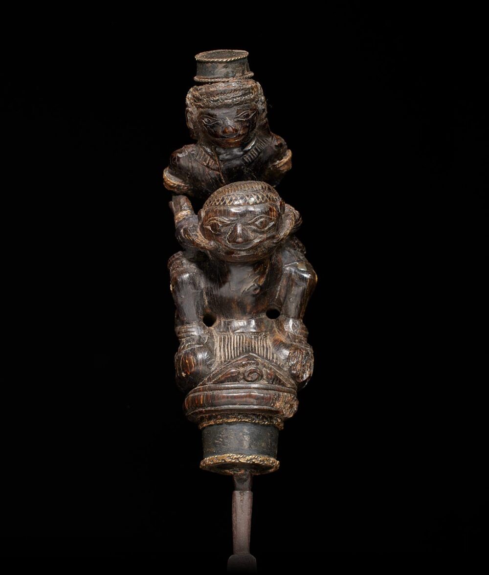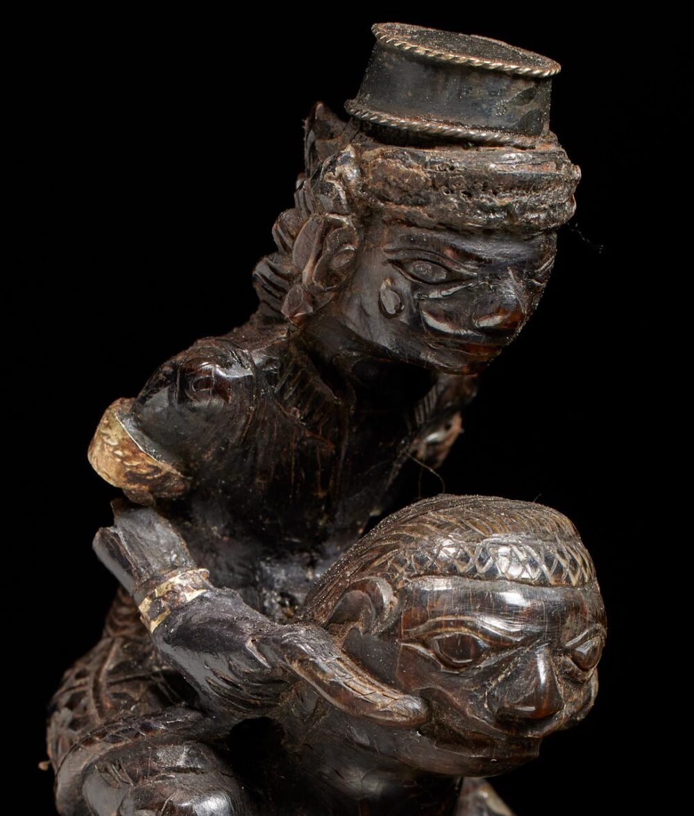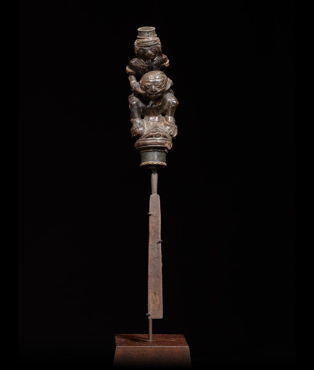 Elderly individuals without teeth depend on pestles featuring chisel-like blades to crush the tough areca nuts, a primary ingredient in betel chewing. This pestle is a genuine master-work of sculpture, showcasing an astonishing level of detail. The handle is both thick and imposing in size, depicting a female figure riding atop a male figure, both with highly animated expressions. This object possesses considerable age and a well-worn surface that demonstrates the Indonesians’ ability to create a monumental miniature masterpiece.