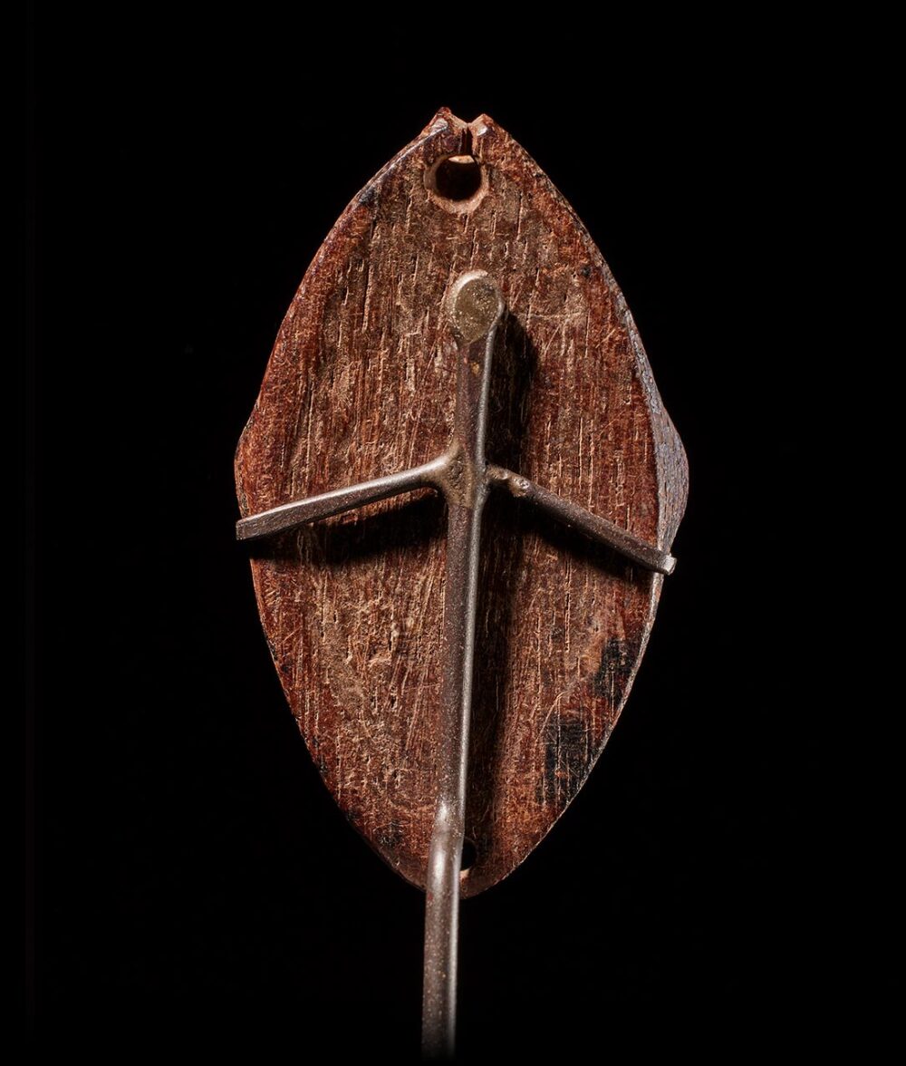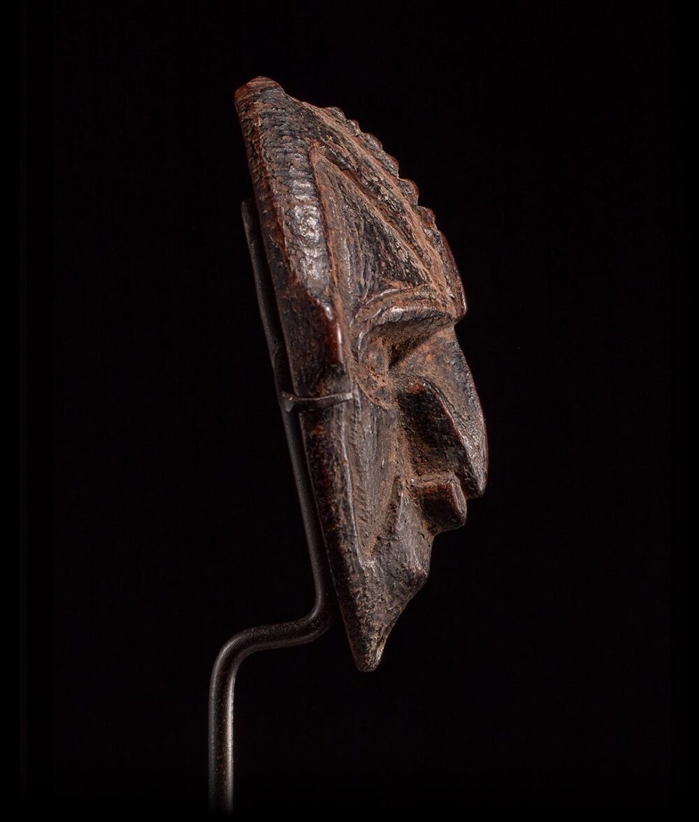 This exquisite miniature amulet mask hails from the Lower Sepik region and was originally designed to be suspended through a small, intricately pierced hole at the crown of its head. Carved with non-metal tools and bearing the marks of great antiquity, this mask possesses an allure through its captivating facial features, exuding a subtle but palpable intensity.