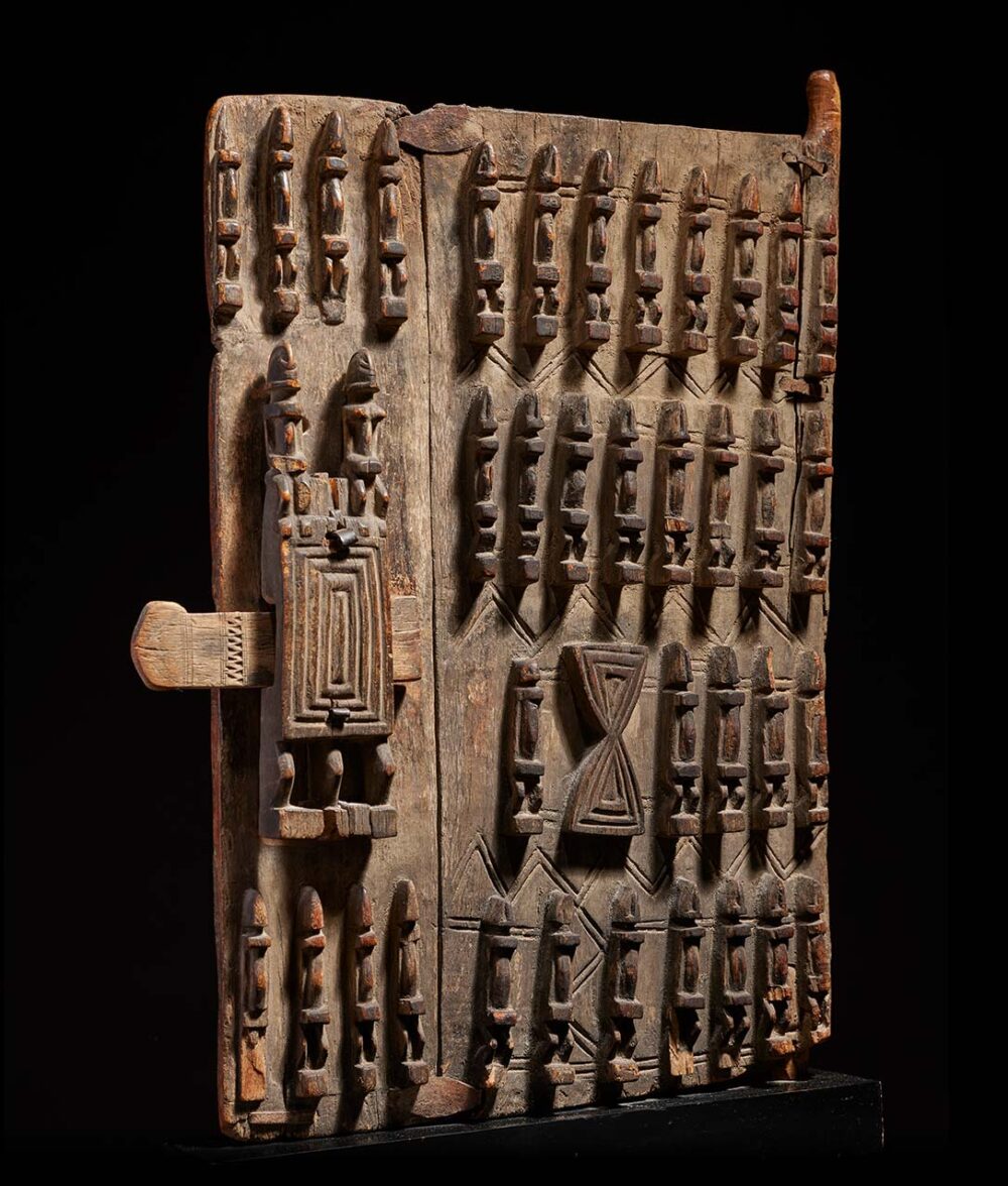 These doors served to protect the window-like openings of each family’s grain storage building and employed a straightforward sliding door lock mechanism. This door is comprised of two panels firmly fastened with iron staples near the right side. Notably, the doors feature well-worn knobs for hinges and are adorned with high relief carvings of abstract figures arranged in four tiers, resulting in an aged, dark brown patina.