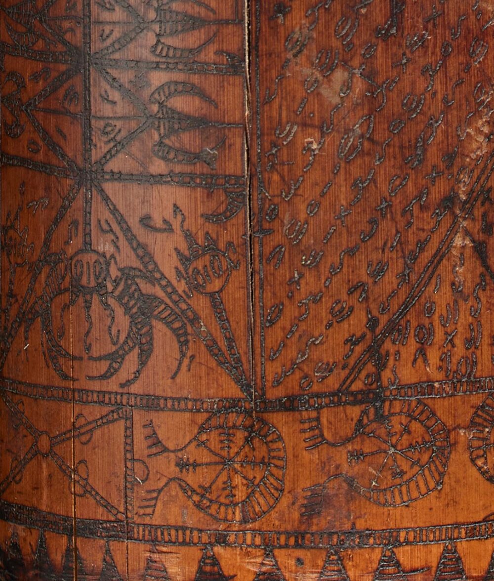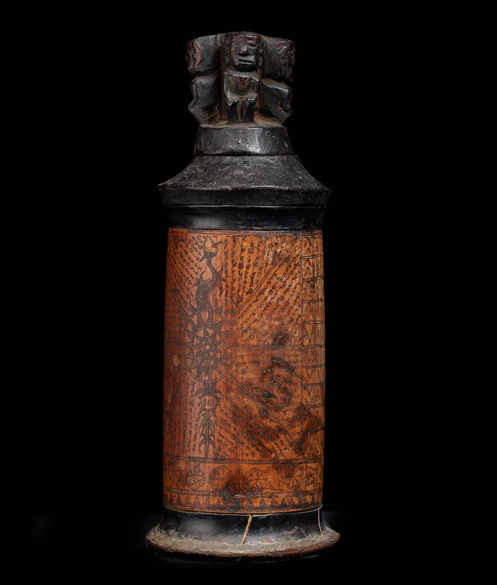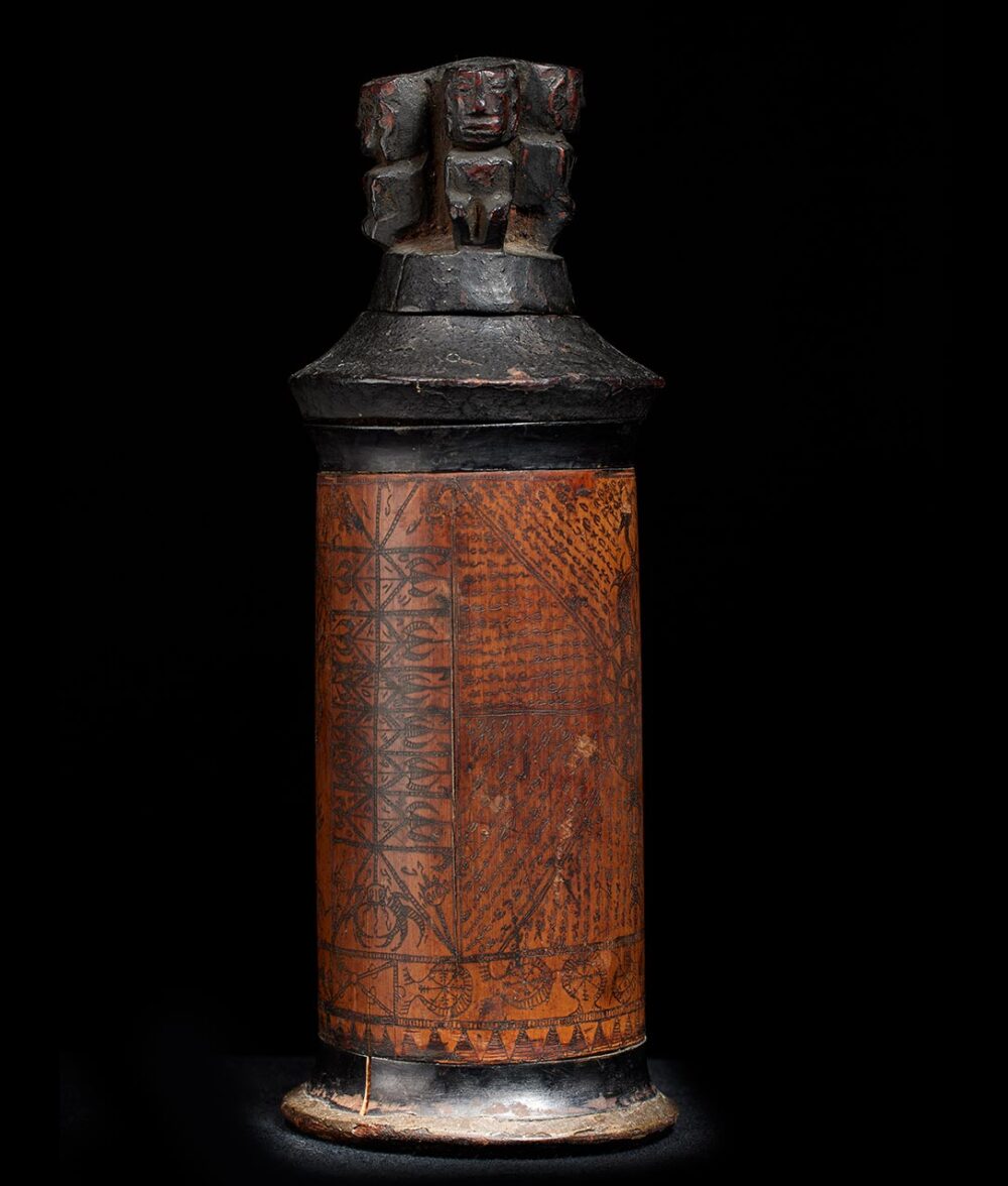 This container features a bamboo body with black water buffalo horn rims at the top and bottom. The wooden lid is intricately carved with four outward-facing squatting figures, a motif that is also commonly found on the bases of Magic Staffs. What makes this piece truly remarkable is the extensive coverage of magical inscriptions in the Toba language and figurative imagery, mirroring the writings found in Batak shaman’s magical books.
