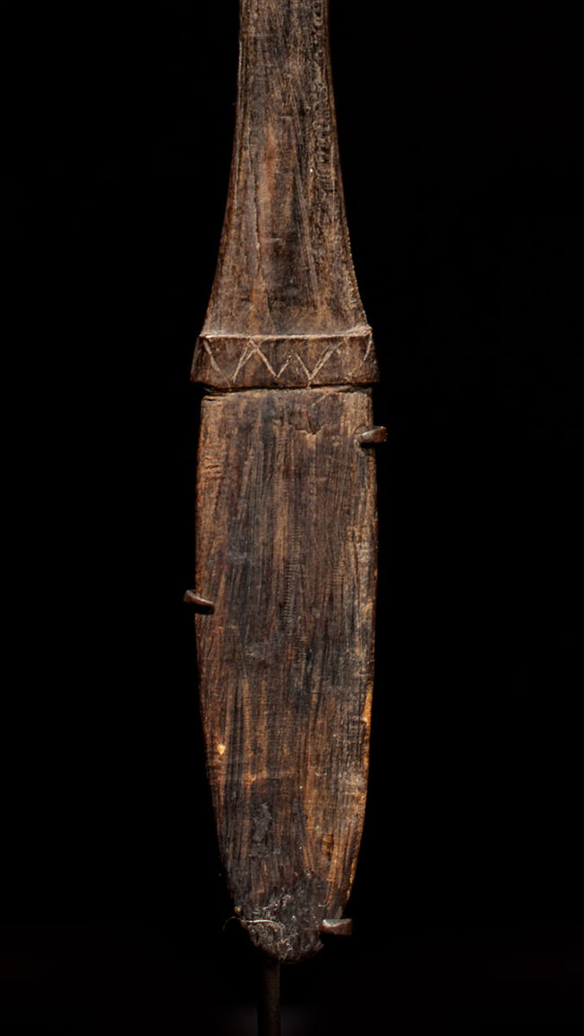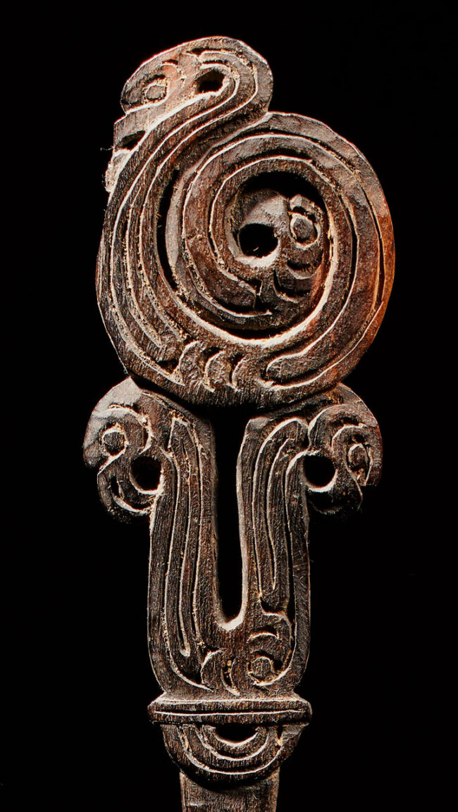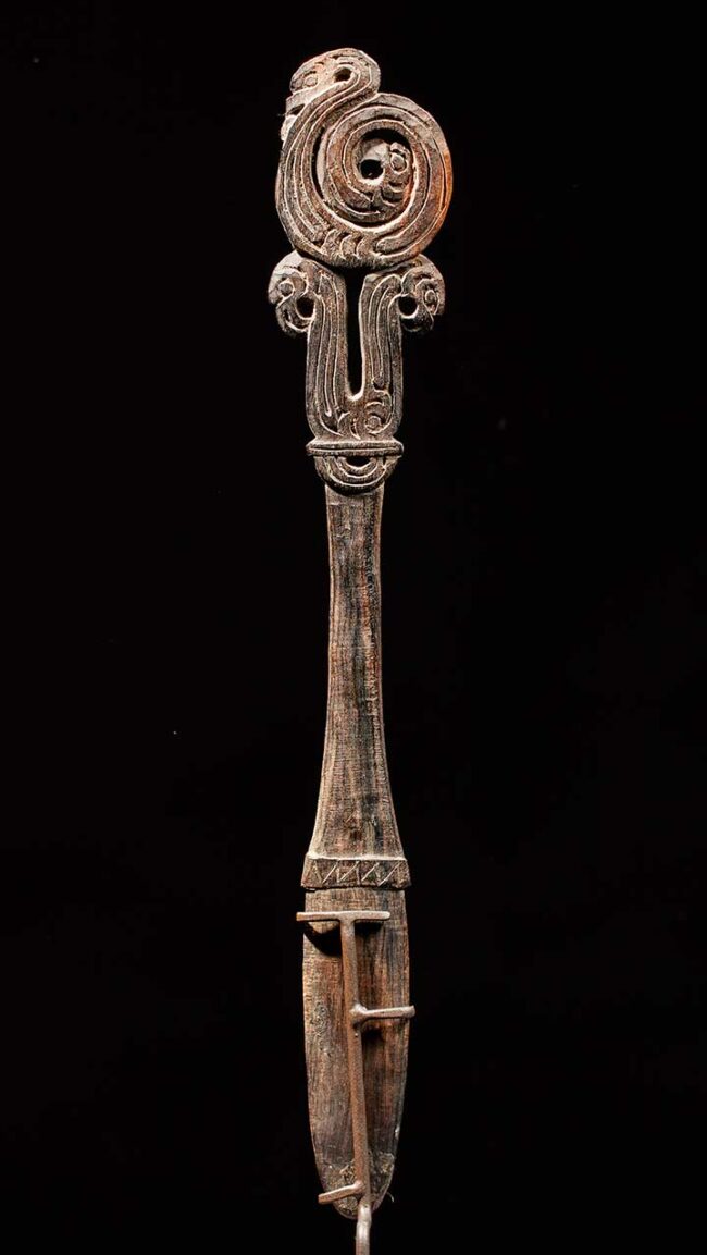 The lime spatula on offer is not only a beautiful work of art but also played a practical role in Trobriand Island culture. This spatula was used to prepare lime, which was an essential ingredient in chewing betel nut, a common social and ceremonial practice in the Trobriand Islands.