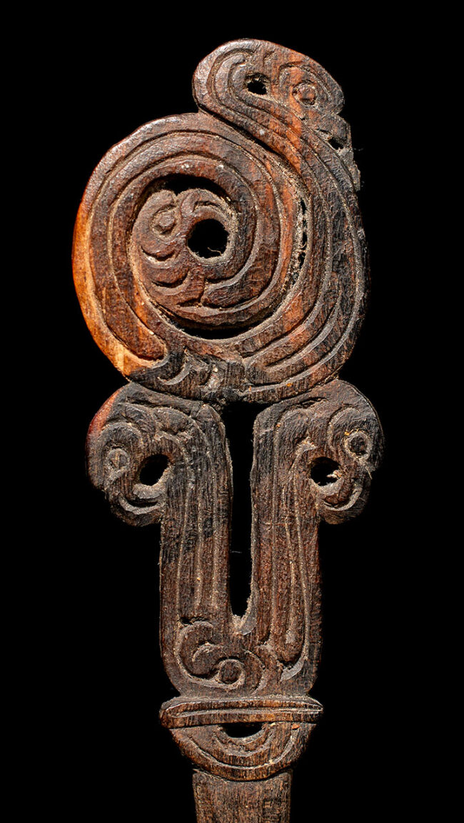 This spatula is adorned with four coiled frigate birds at the top, which serve as a testament to the rich cultural heritage of the Trobrianders. It is carved from a hard, dense wood and has a dark patina