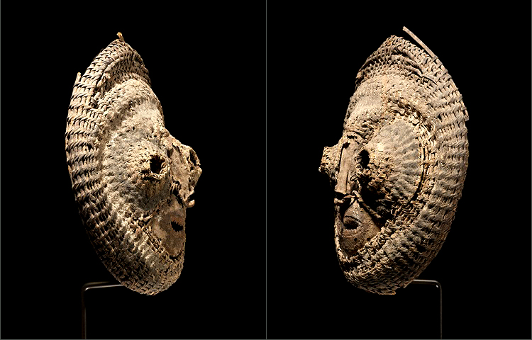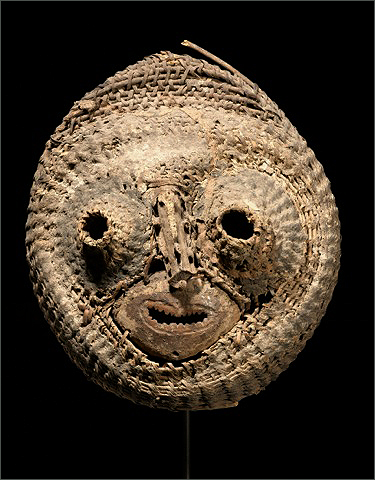 Fiber masks from the Boiken in the Coastal Price Alexander Mountains of the East Sepik Province are extremely rare. This particular mask is one of only two known today. The mask is made out of vegetable fibers, which are wound around a wooden skeleton. The facial characteristics are consistent with Boiken artistic trends. Large protruding eyes dominate the face, while a small shaft of wood represents the nose. The mouth is carved out of coconut shell, and care has been taken to clearly delineate the teeth. The three-dimensional quality of the eyes compared with the linear features created by the nose and mouth produce a nice contrast.