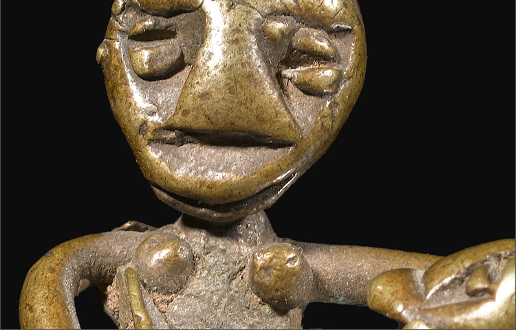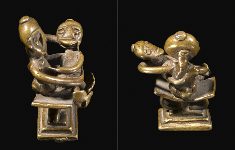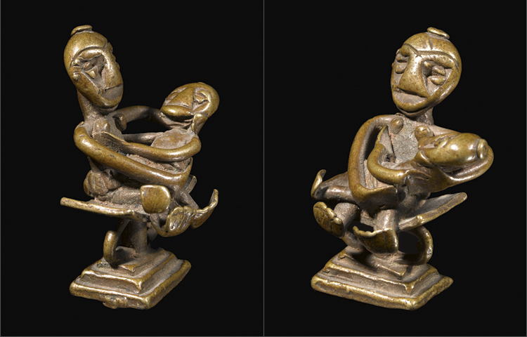 In the Akan kingdom during the 15-19th century; brass gold weights were used to measure gold dust. The human forms usually represented Akan proverbs. This example is a fine casting of a mother holding her child while sitting on a classic throne. The patina shows great evidence of wear through the generations. In excellent condition.