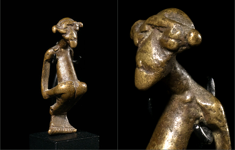 Of sleek diminutive form this is a magnificent casting of a Kulango amulet. The classic features of the Kulango form are taken to new heights with this example. The projecting head is complemented by an angular body that has acquired a superb patina from handling. The facial features are heavily worn down as a result from said handling. There are no casting flaws and this amulet is in excellent condition.