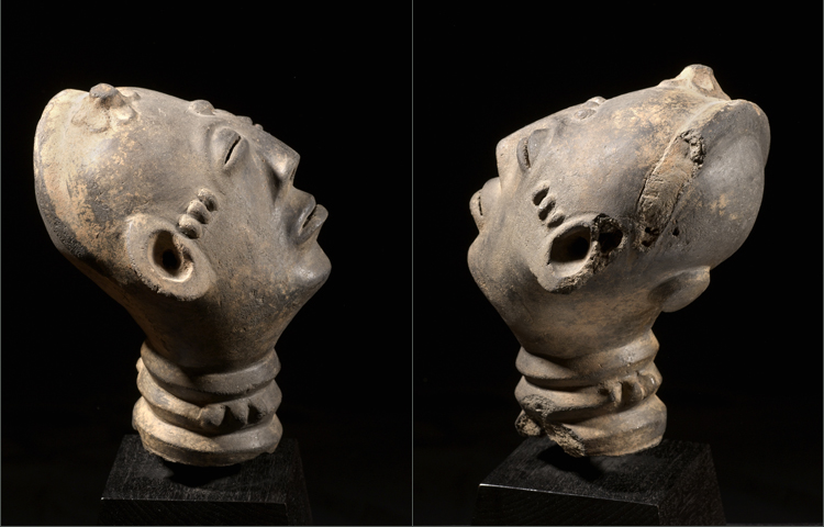 As it gazes up to the heavens this Akan terracotta head is not only superb aesthetically; it was created by a well known hand. These heads were usually found on large figures or vessels made in a funerary context. The features are rendered naturally and blend to create a haunting appearance. The classic dot scarification is found on the head and ringed neck. There are some slight losses but this is to be expected from an object of this vintage and medium. An example by this hand can be found in the publication “Ancient treasures in Terracotta of Mali and Ghana “figure 43.