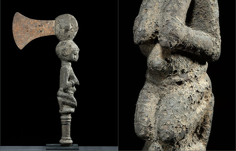 This is a fine and old example of a ceremonial ax used by chiefs among the Yoruba. The figurative element on the axe is of a kneeling female figure holding her breasts. What makes this example special is originally its ceremonial purpose was an axe, but later in its lifetime became a shrine object as you can see by the thickly developed encrusted patina from copious libations at the shrine; mostly chicken blood and other organic materials. This is a nice example of tribal art because the whole history of the object is speaking directly to you through its surface patina.
