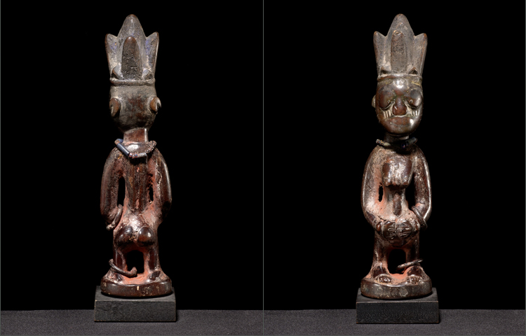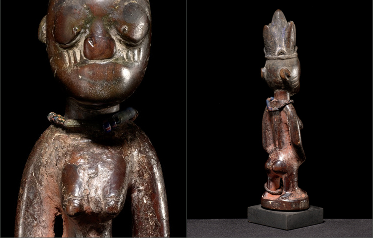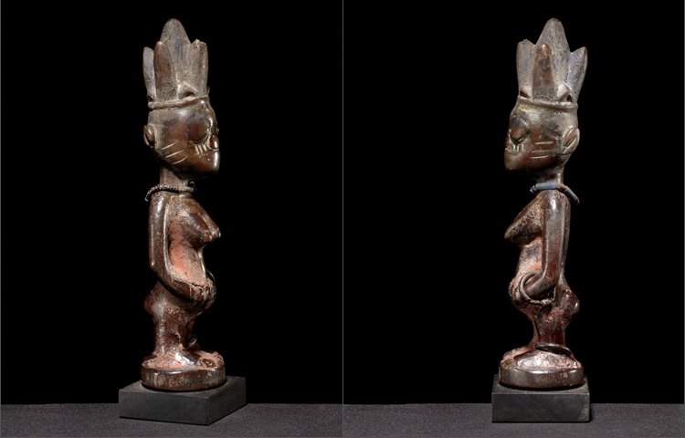 Nigeria births the largest known population of twins. Starting in the 19h century, due to the high infant mortality rate; dolls called Ibeji were commissioned. The soul of the dead twin would enter this wooden carved doll and it was to be treated as if it WAS the twin that passed on. This example shows exactly how Ibeji’s were treated. The heavily worn features are from the daily washings; as if you were washing a real child. The caked on reddish surface was the ‘clothing’ given to the Ibeji; known as cam-wood. The mouth is worn down; from offerings of food. The beads are gifts that would be presented to the Ibeji on occasions. This example is the epitome of the Ibeji among the Yoruba of Nigeria.